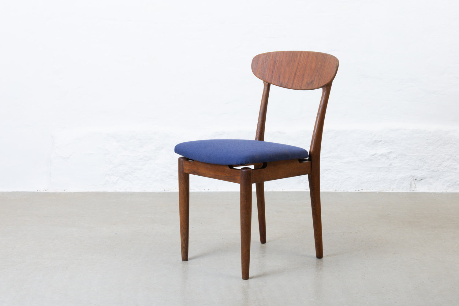 Set of four dining chairs with teak backs, oiled oak frames and padded seats newly reupholstered in a navy cotton.