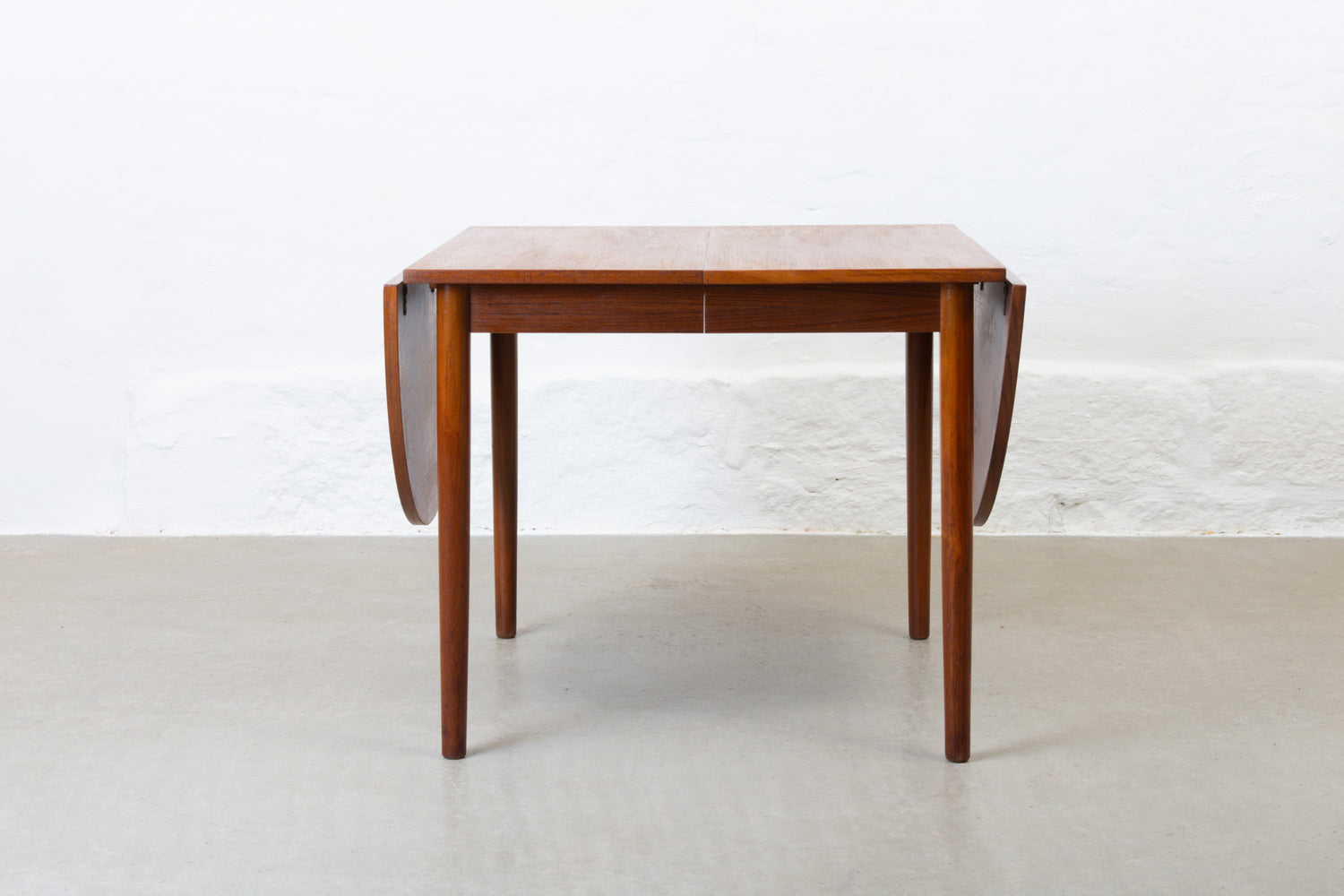 Extending dining table in teak with two removable drop-leaf extensions. Sits two to four and up to six comfortably when extended.