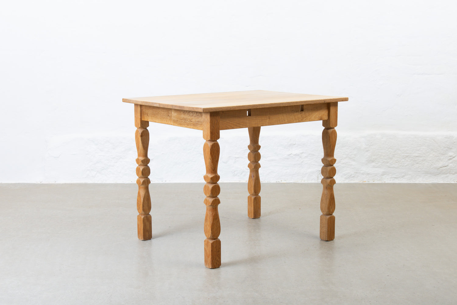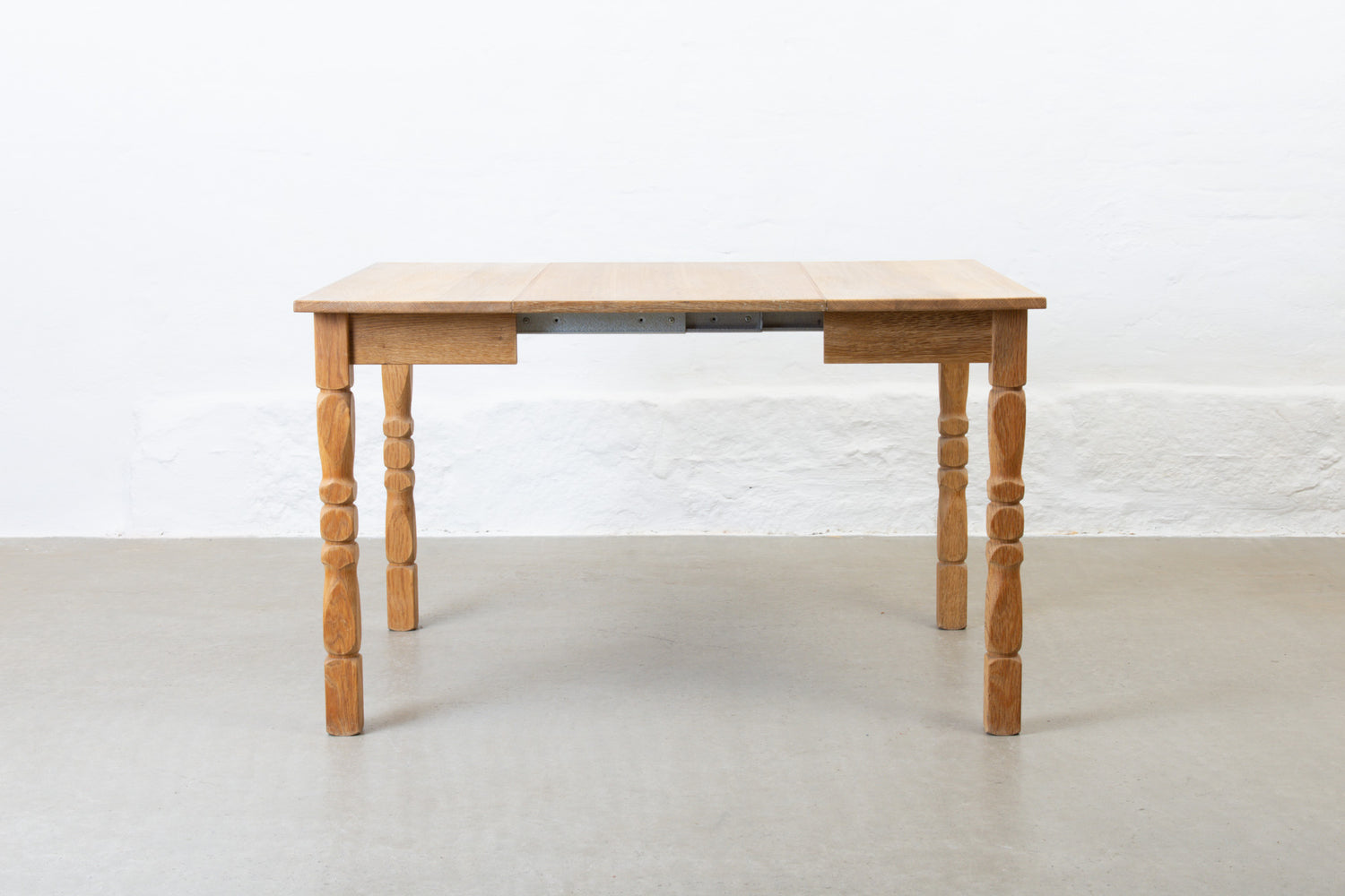 Square dining table in solid oak with two drop-in extension leaves. Sits six to eight when fully extended.