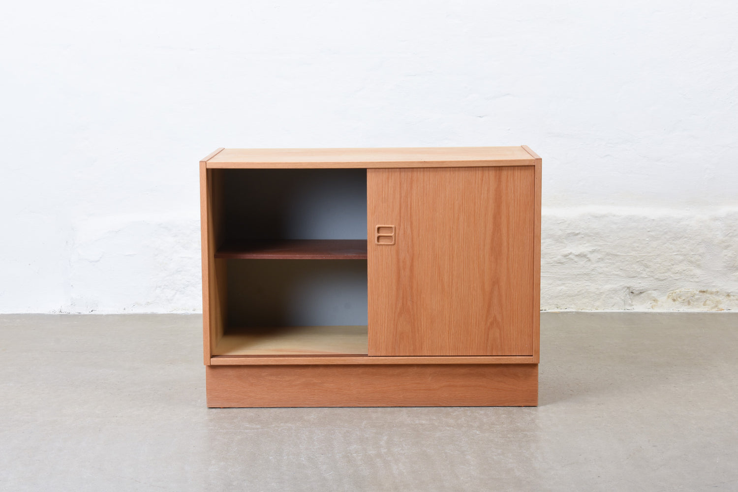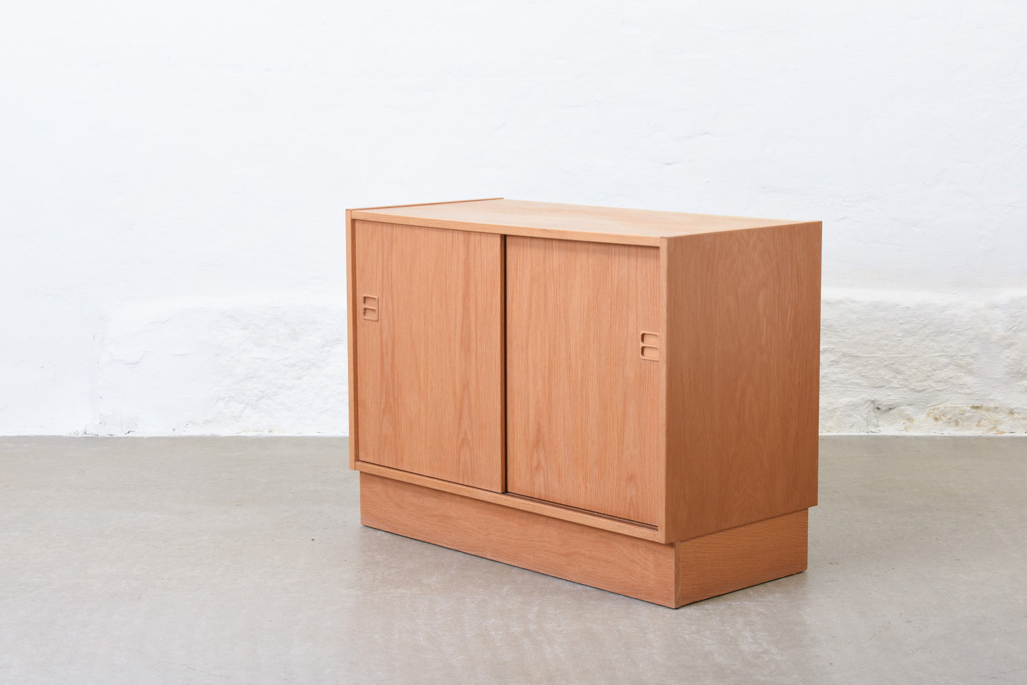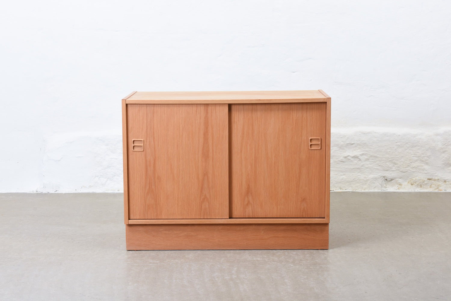 Short sideboard in oak with sliding doors, inset handles and one internal shelf. Sits on a plinth base.