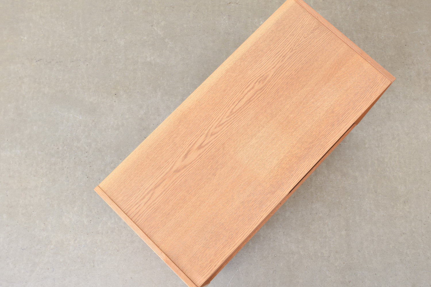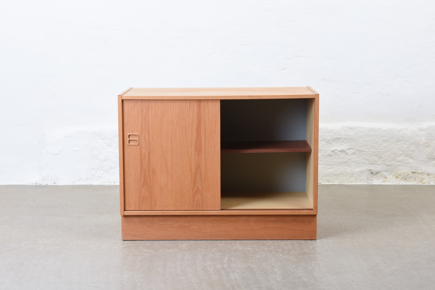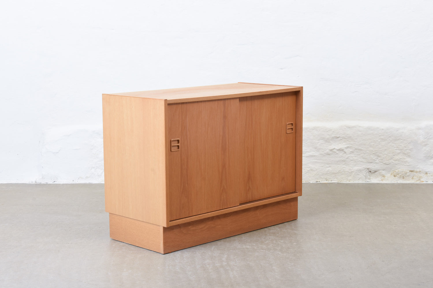 Short sideboard in oak with sliding doors, inset handles and one internal shelf. Sits on a plinth base.