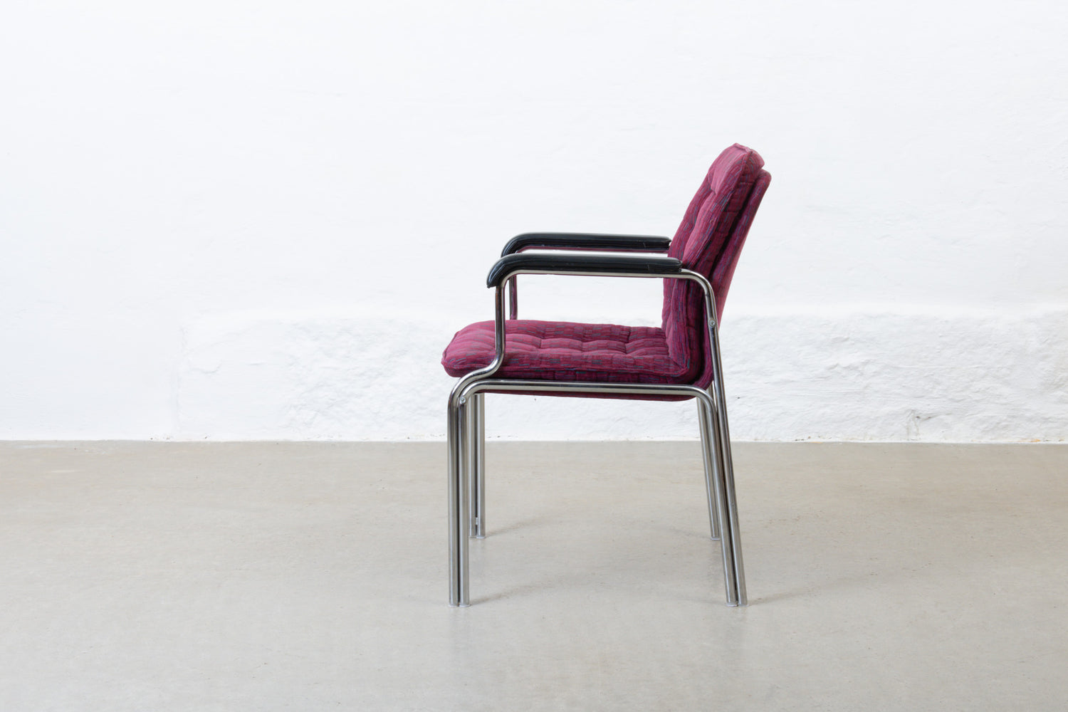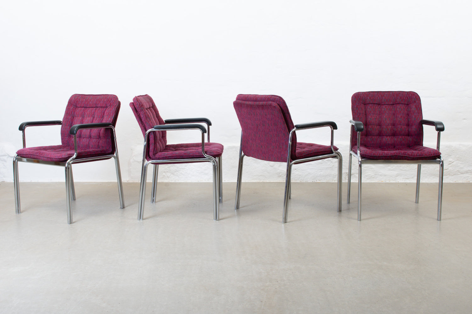 Vintage set of four armchairs with polished metal frames, padded vinyl armrests and their original fabric.