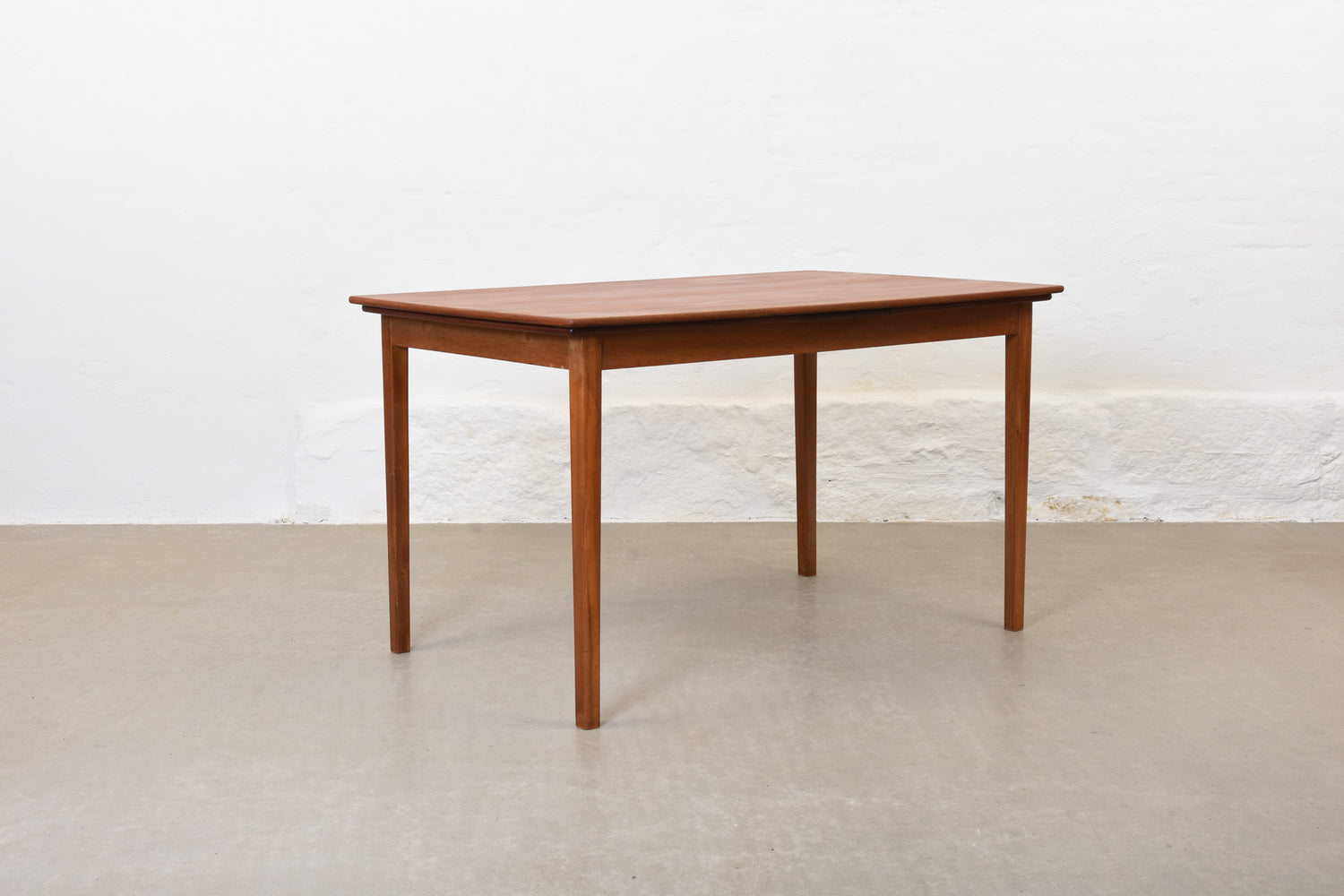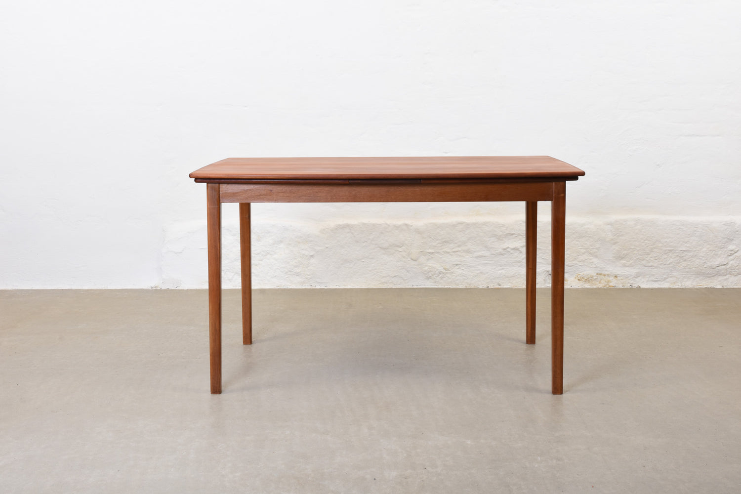 Boat-shaped Danish dining table in teak with two hidden extension leaves. Sits six normally and eight to ten when fully extended.
