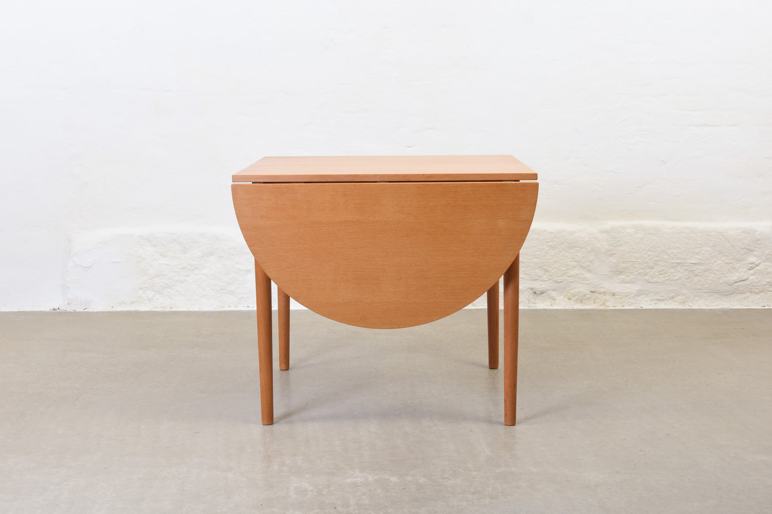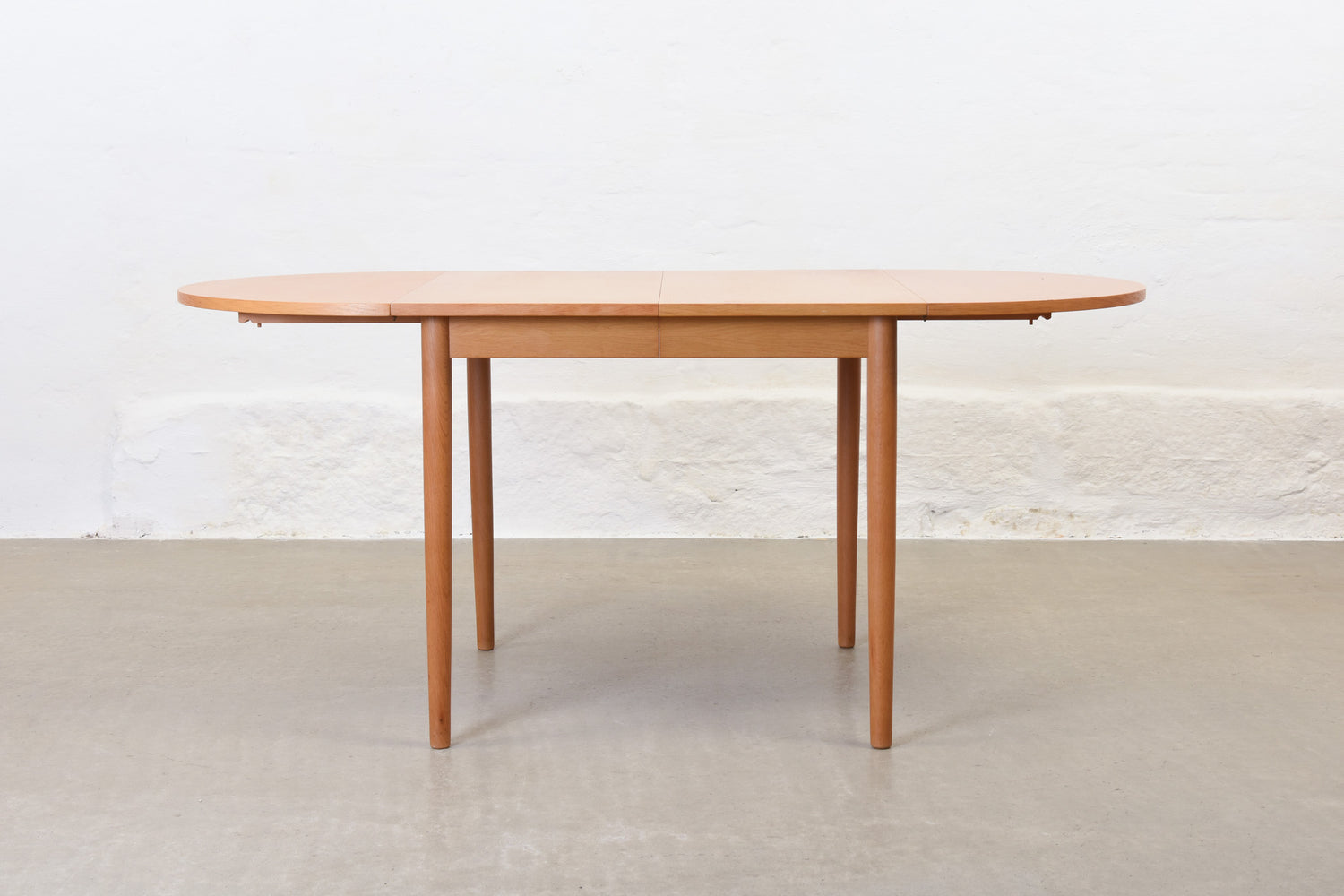 Extending dining table in oak with two removable drop leaf extensions. Sits four to six when fully extended.