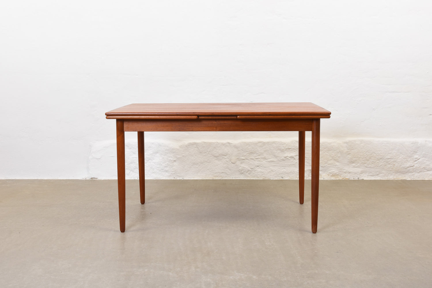 Teak dining table with two hidden pull-out extension leaves. When fully extended will sit up to eight comfortably.