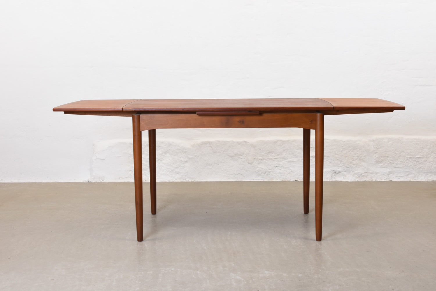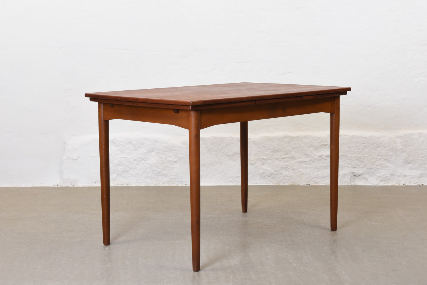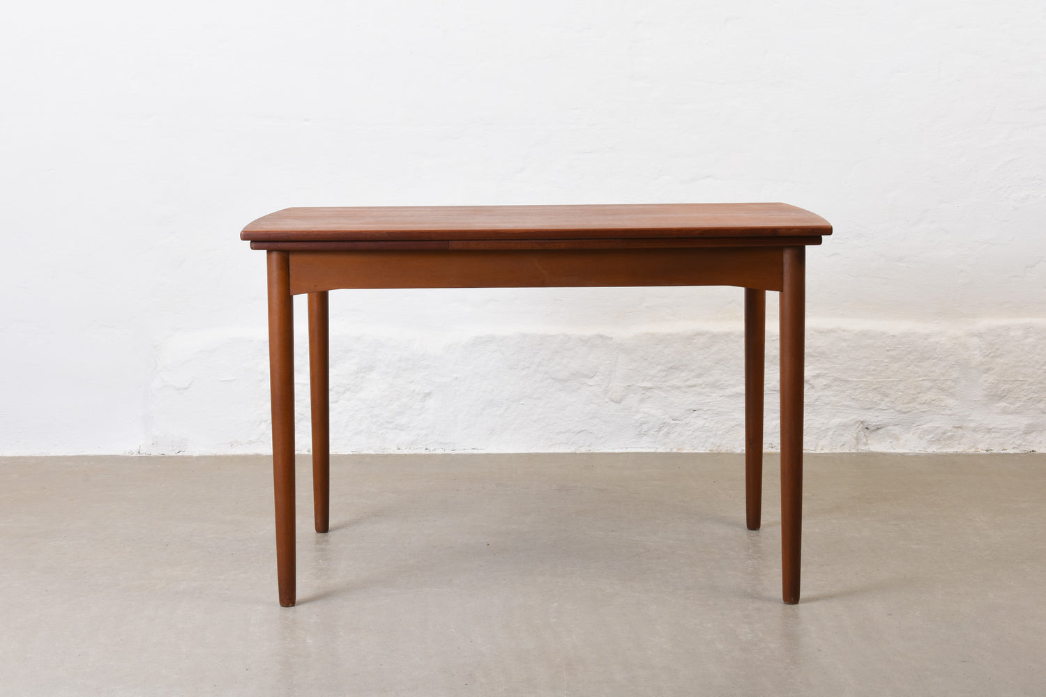 Extending dining table in teak on beech base with two hidden extension leaves. Sits six normally and up to eight comfortably when fully extended.