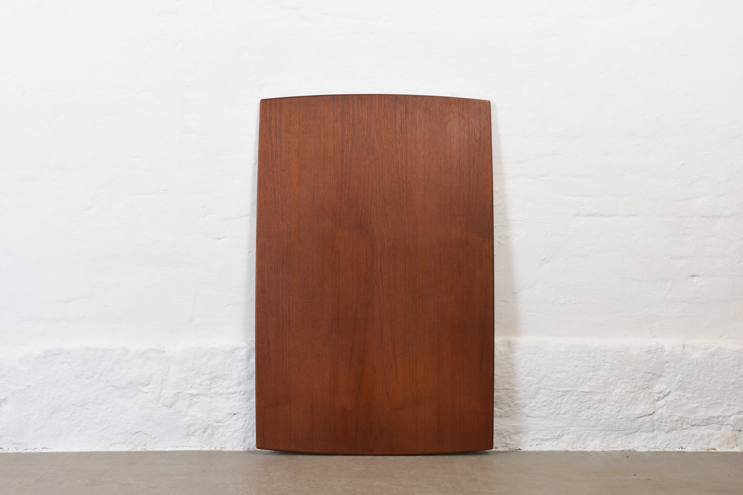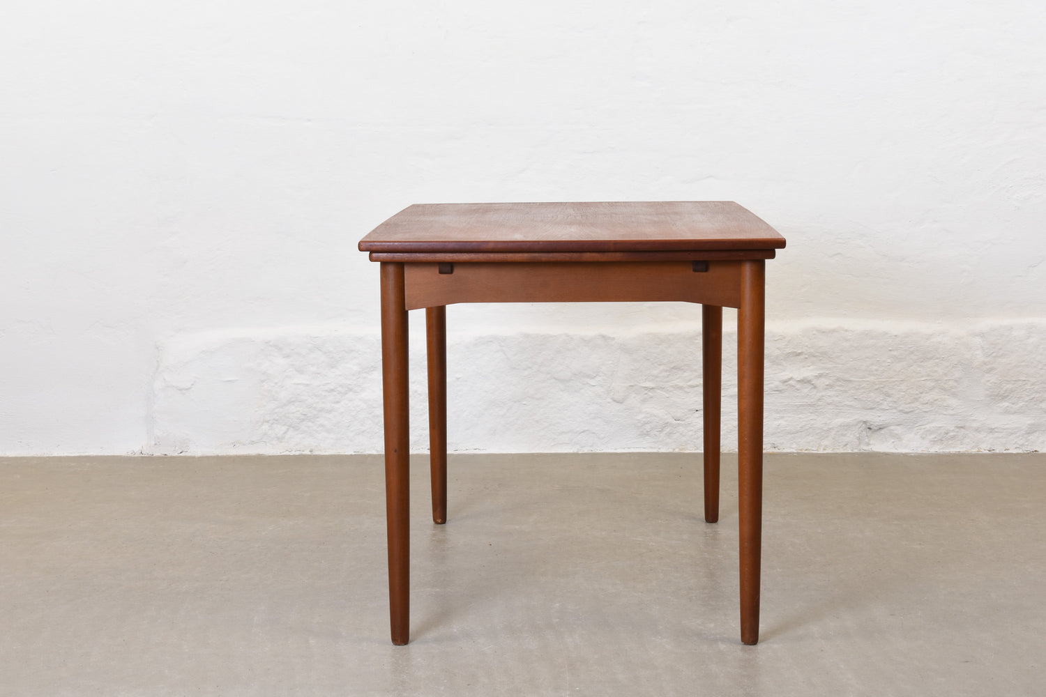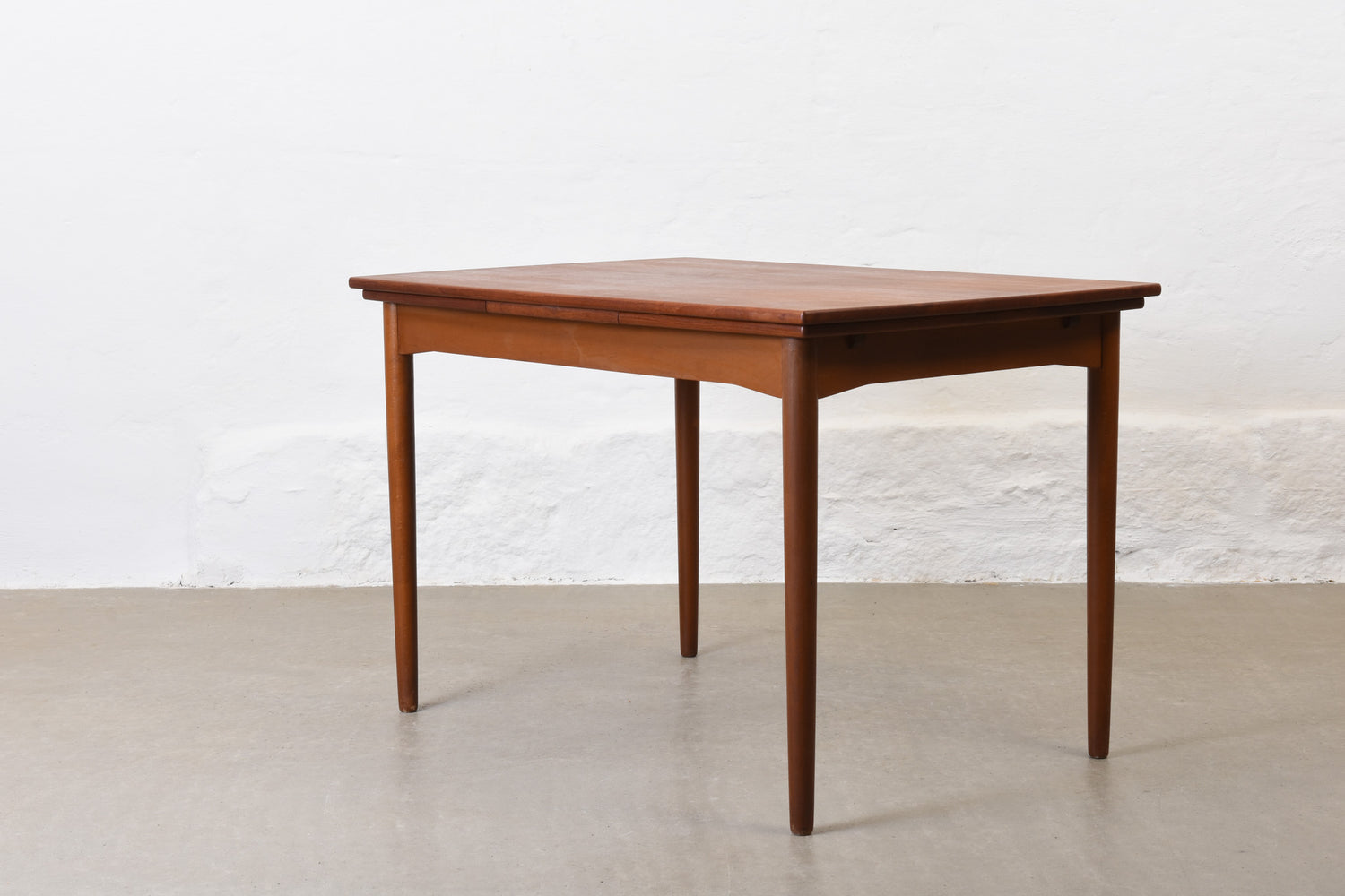 Extending dining table in teak on beech base with two hidden extension leaves. Sits six normally and up to eight comfortably when fully extended.