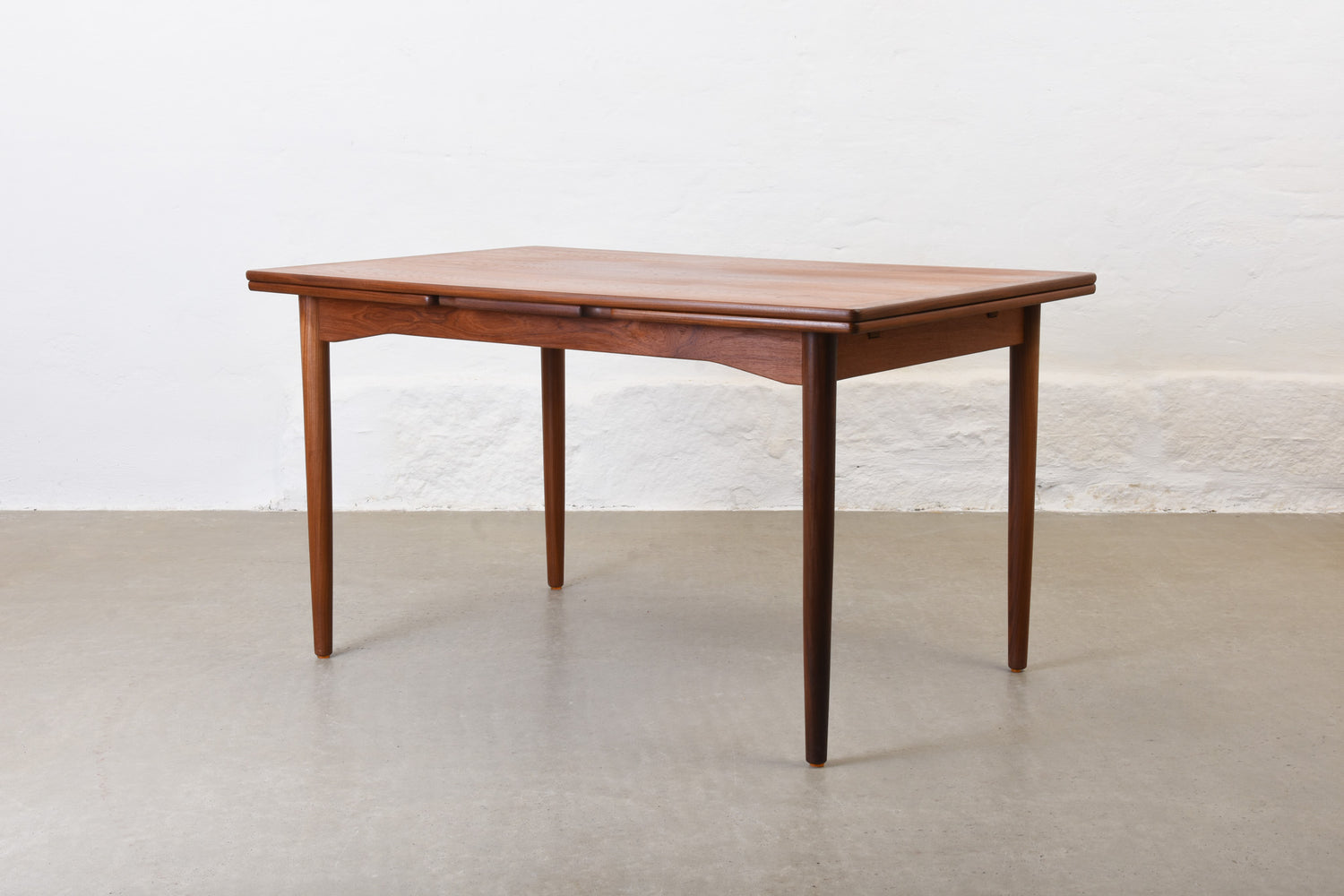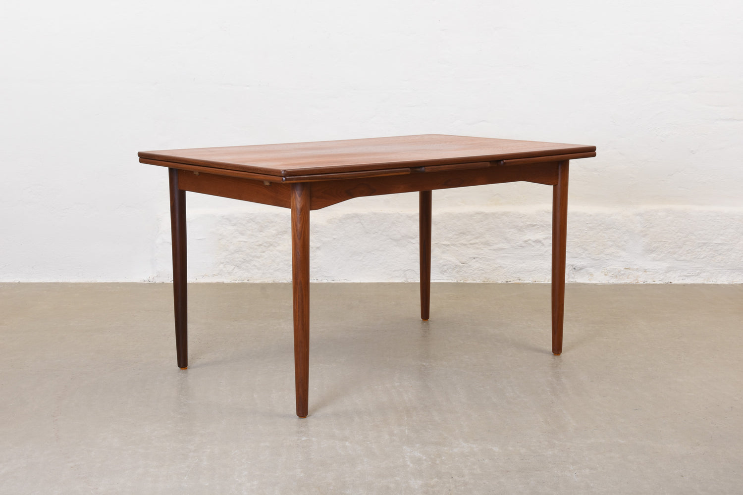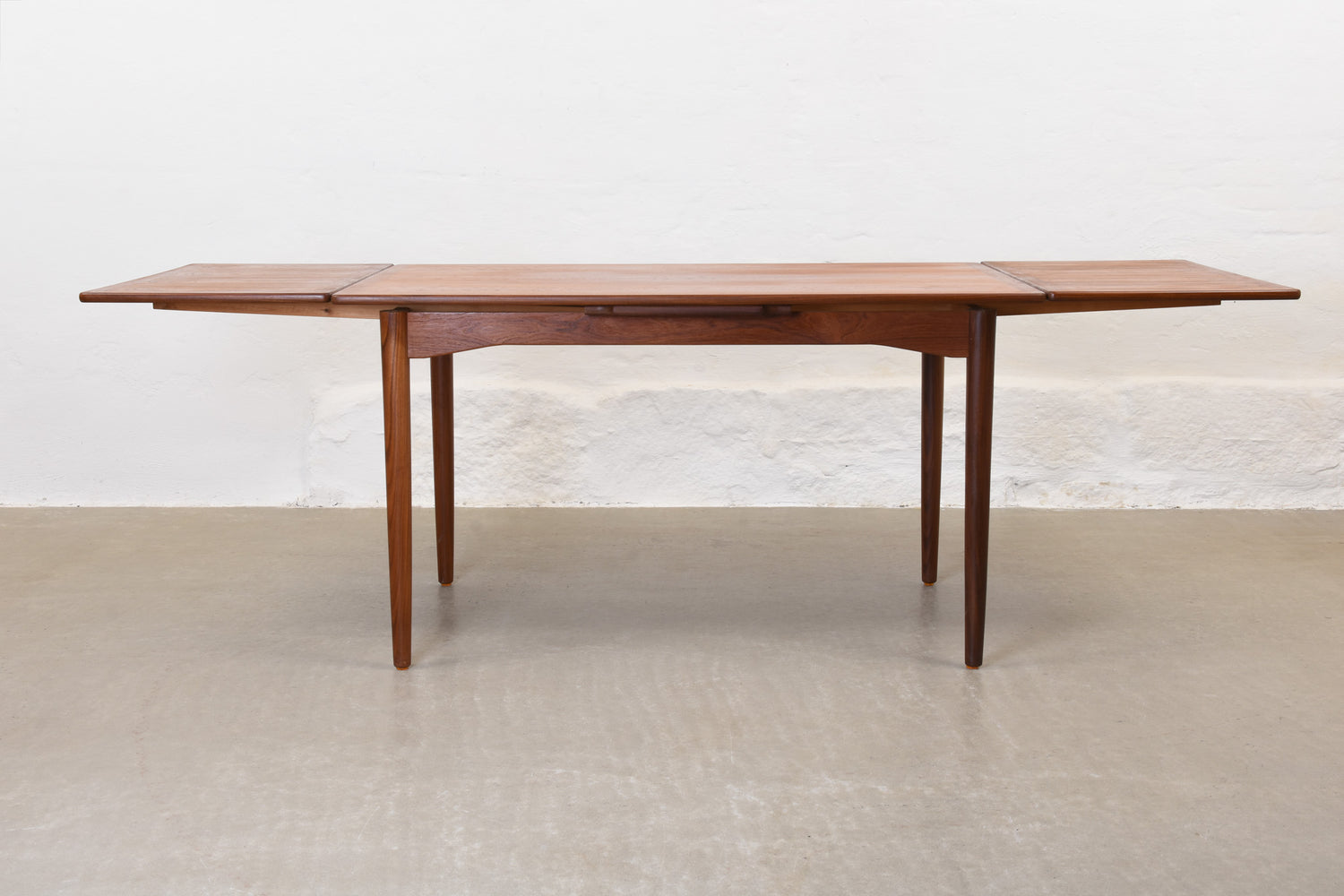 Extending dining table in teak with two hidden pull-out extensions. Sits six normally and up to eight comfortably when fully extended.