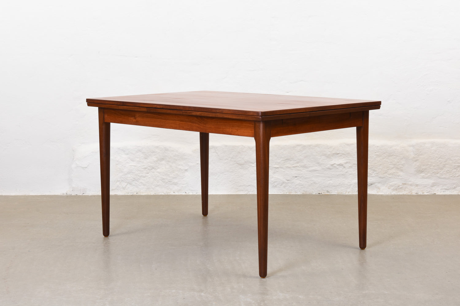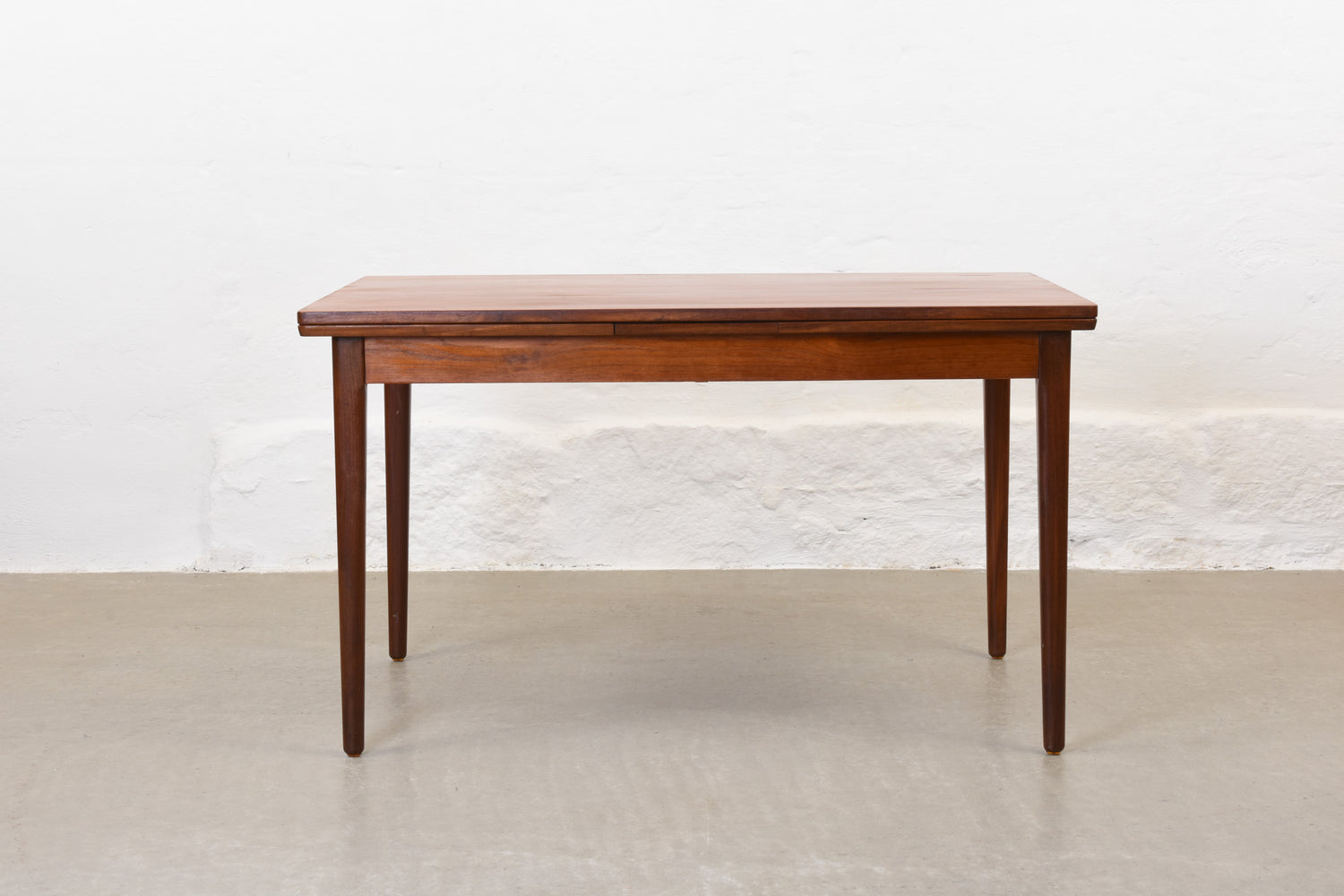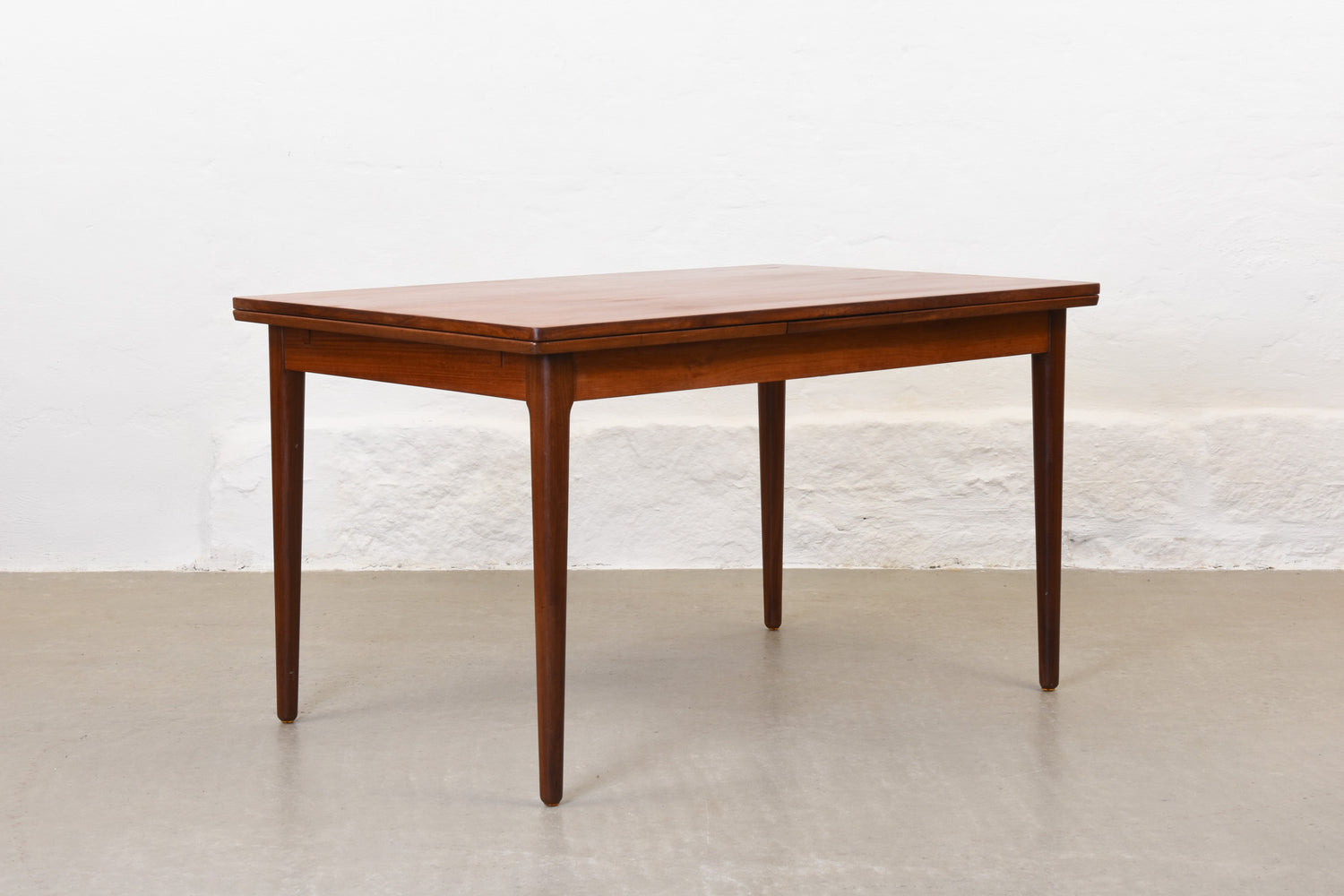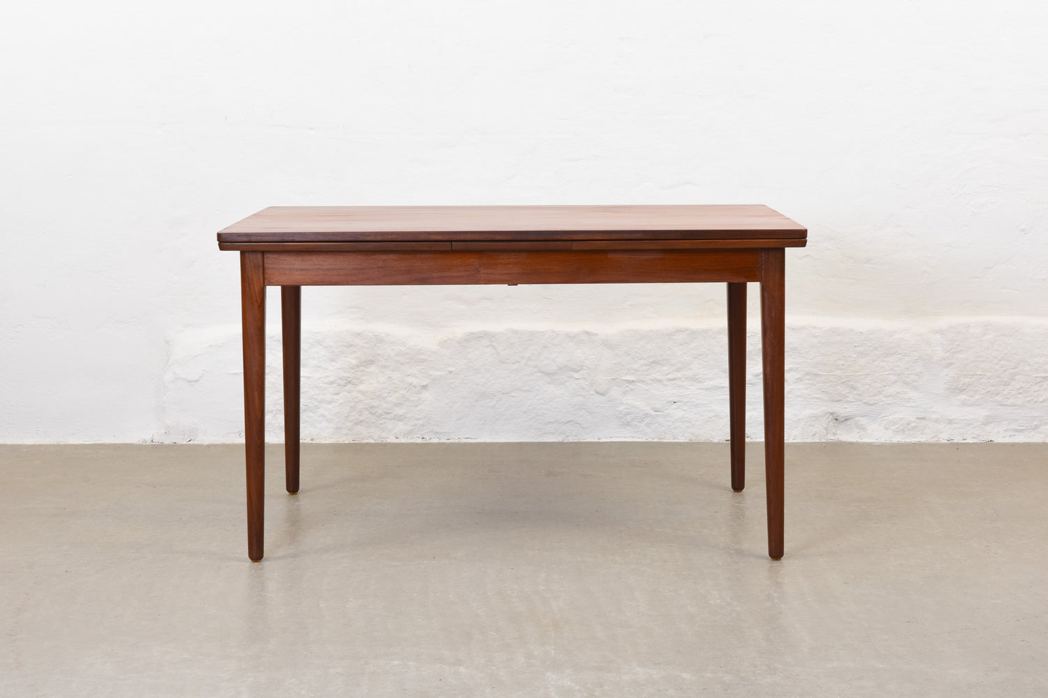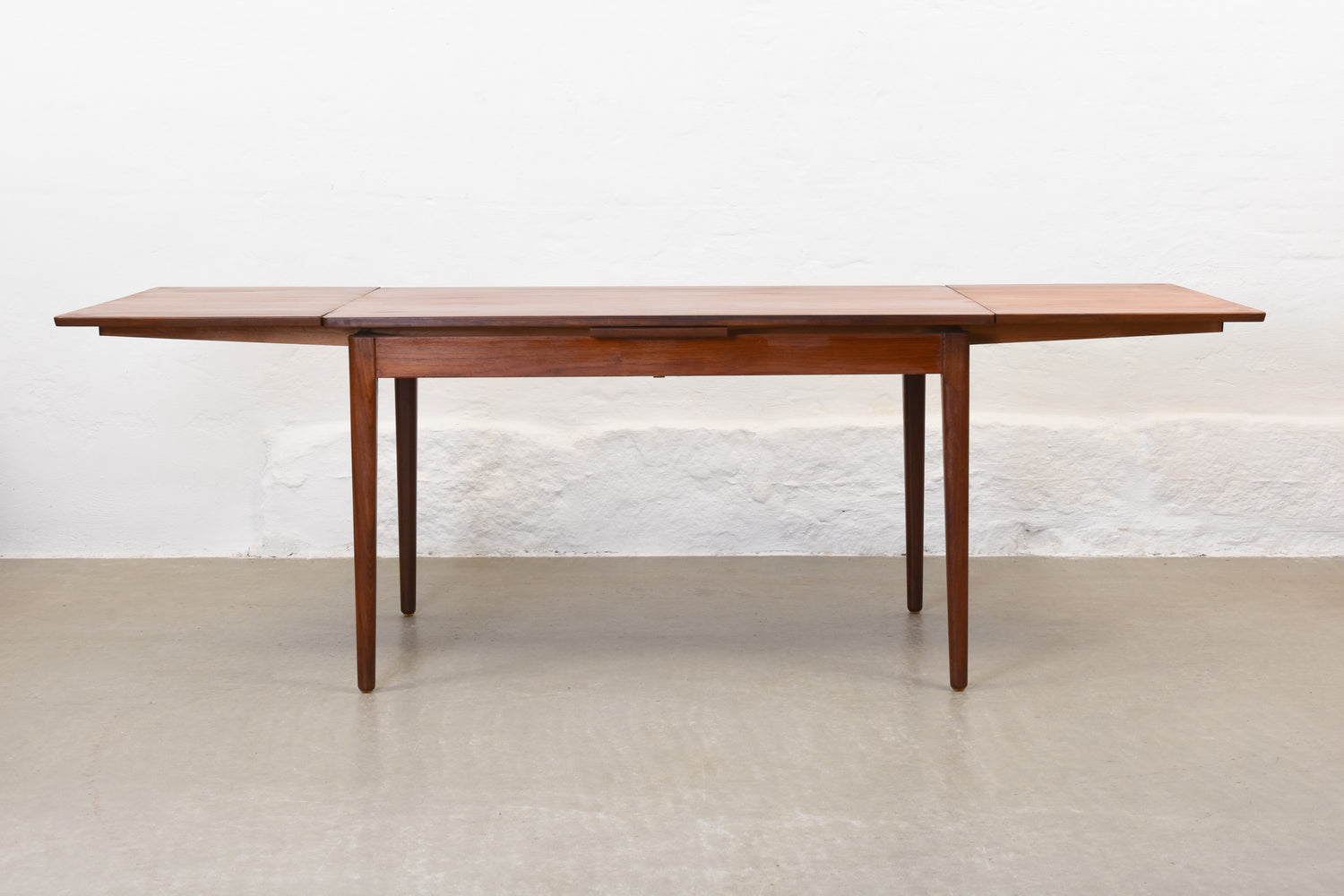 Extending dining table in teak with two hidden pull-out extension leaves. Sits six normally and up to eight comfortably when fully extended.