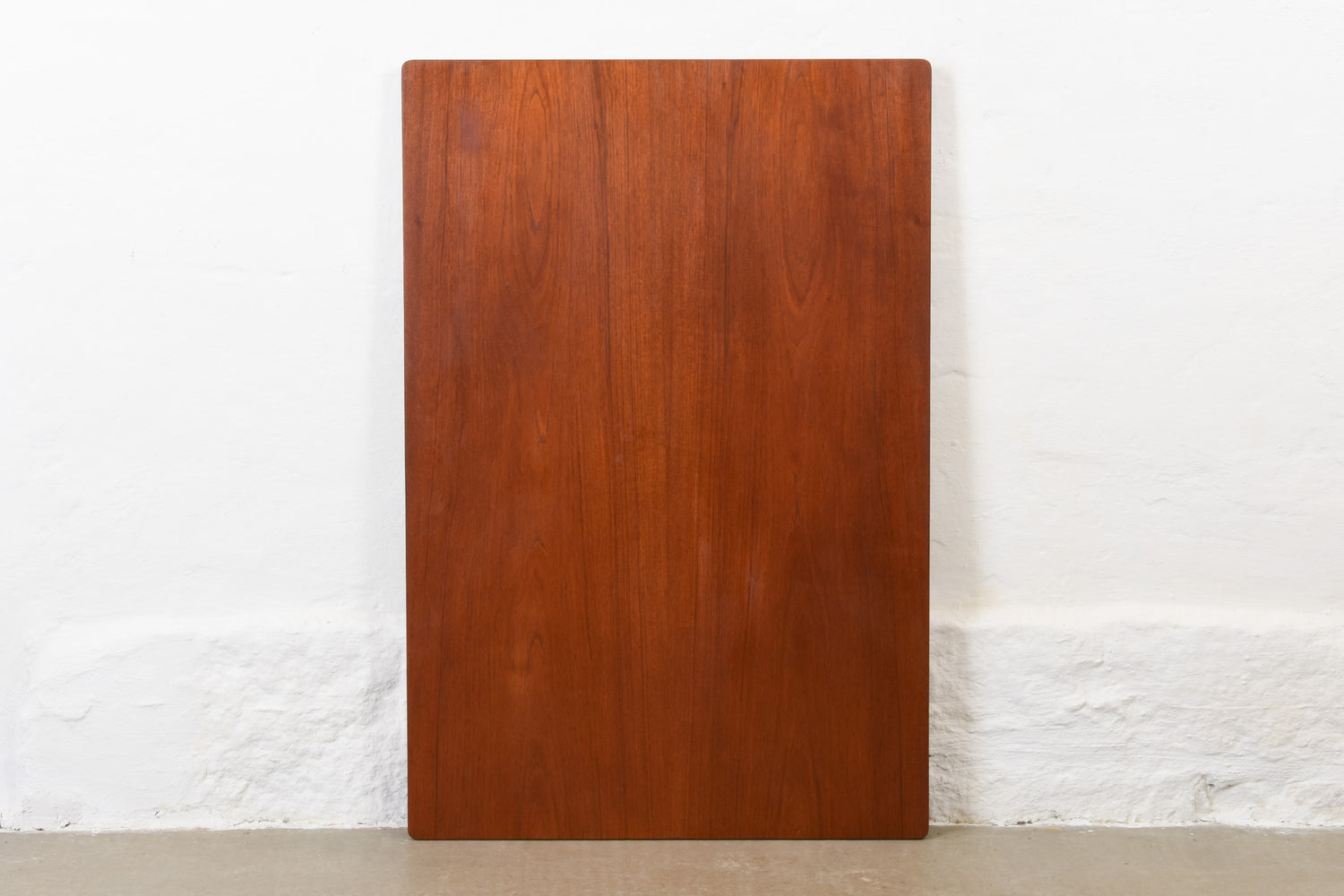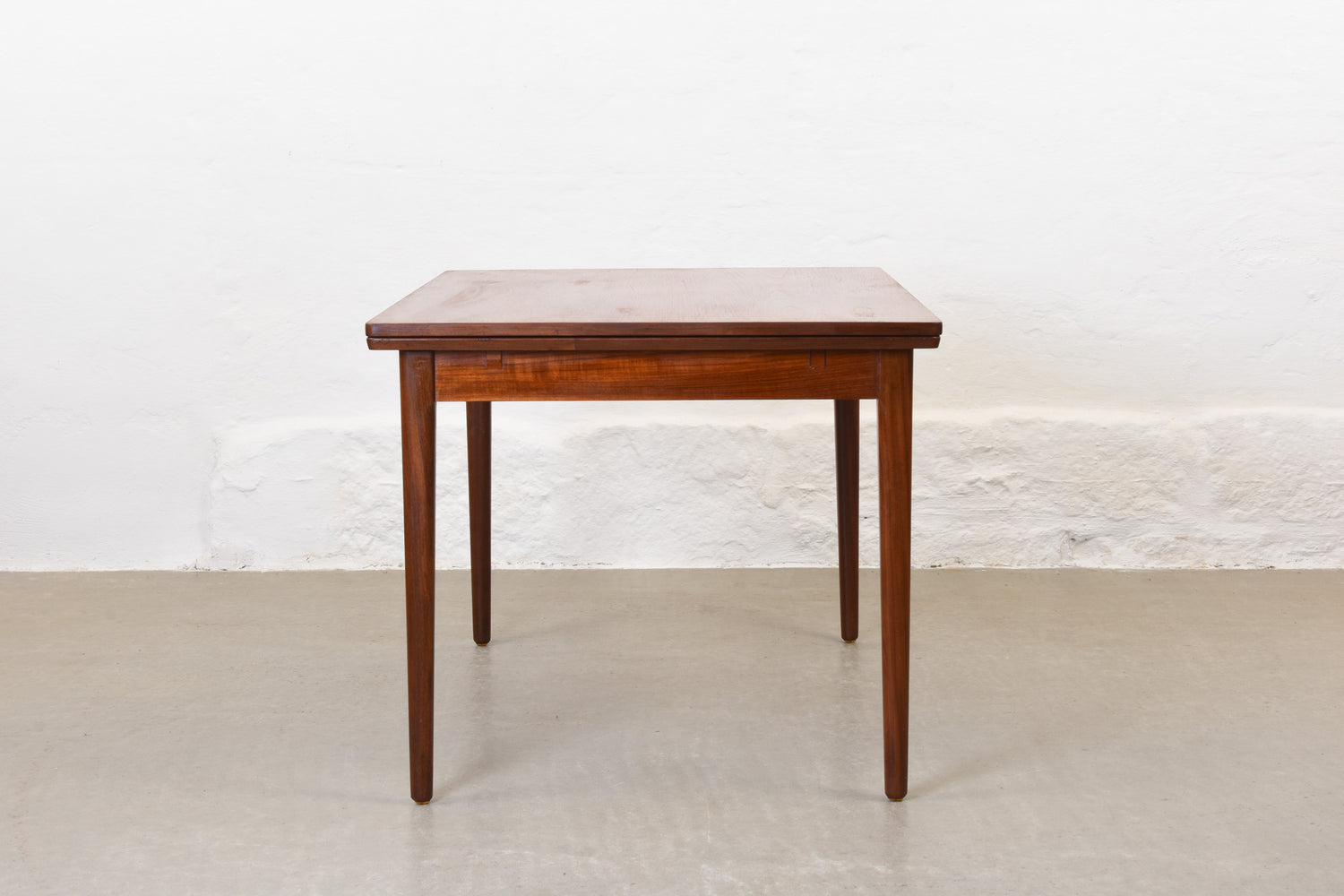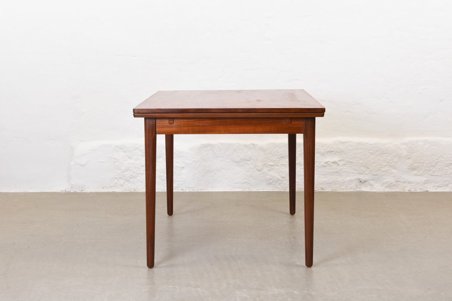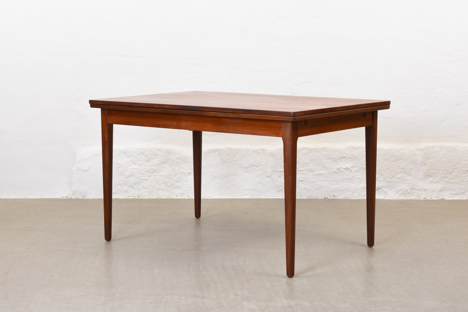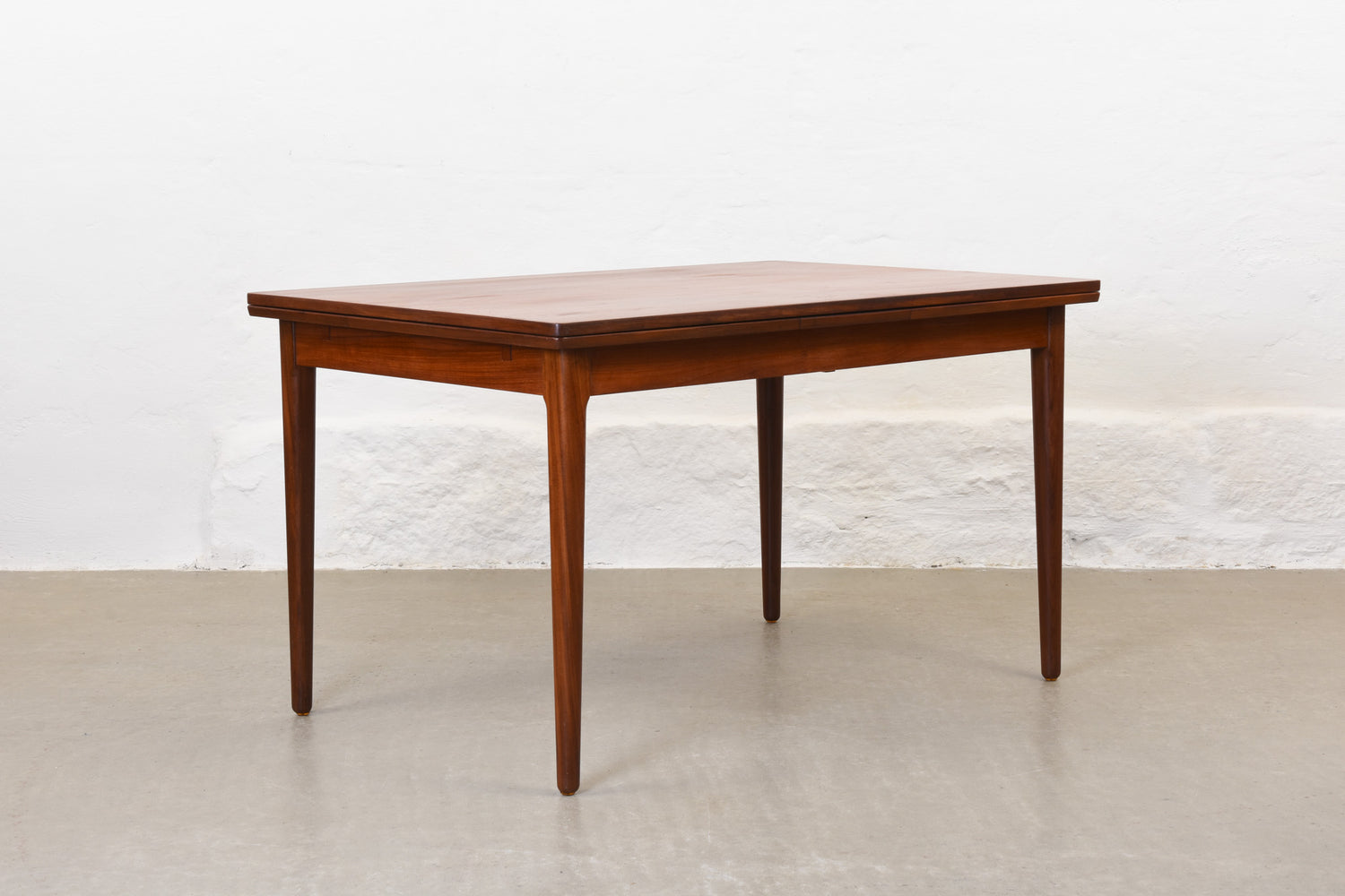 Extending dining table in teak with two hidden pull-out extension leaves. Sits six normally and up to eight comfortably when fully extended.