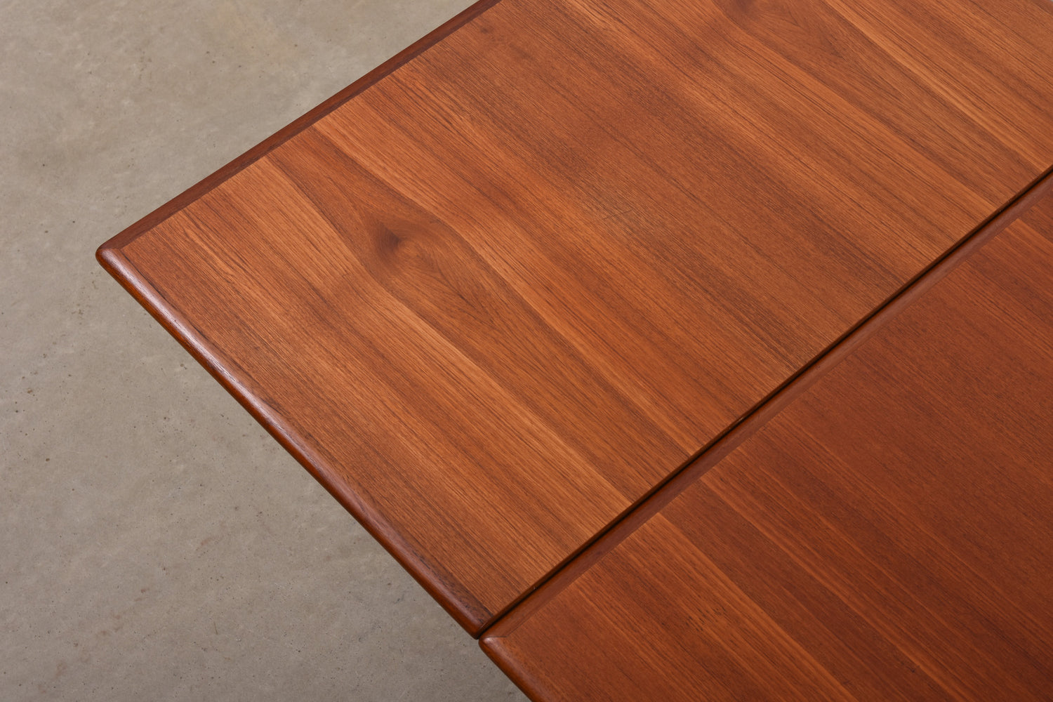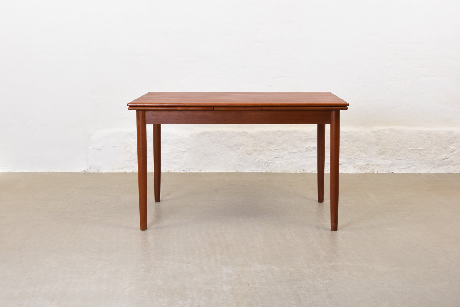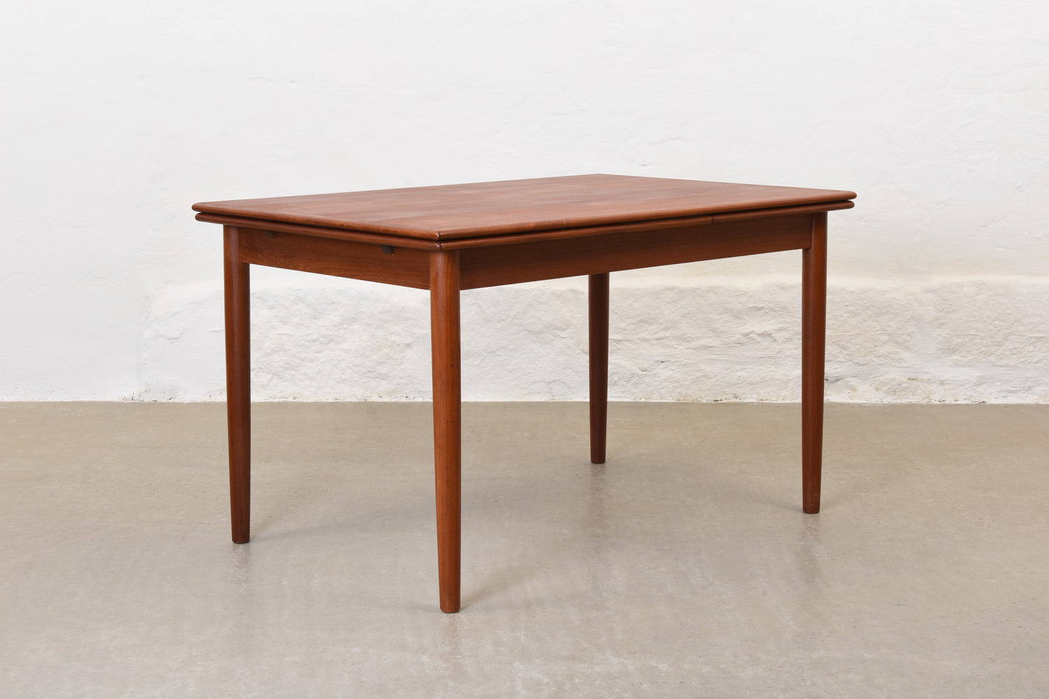 Extending dining table in teak with two hidden pull-out extensions. Sits six normally and up to eight comfortably when fully extended.