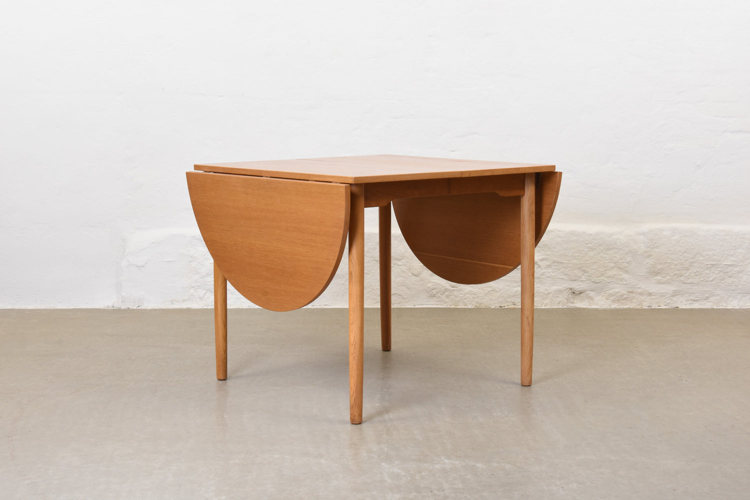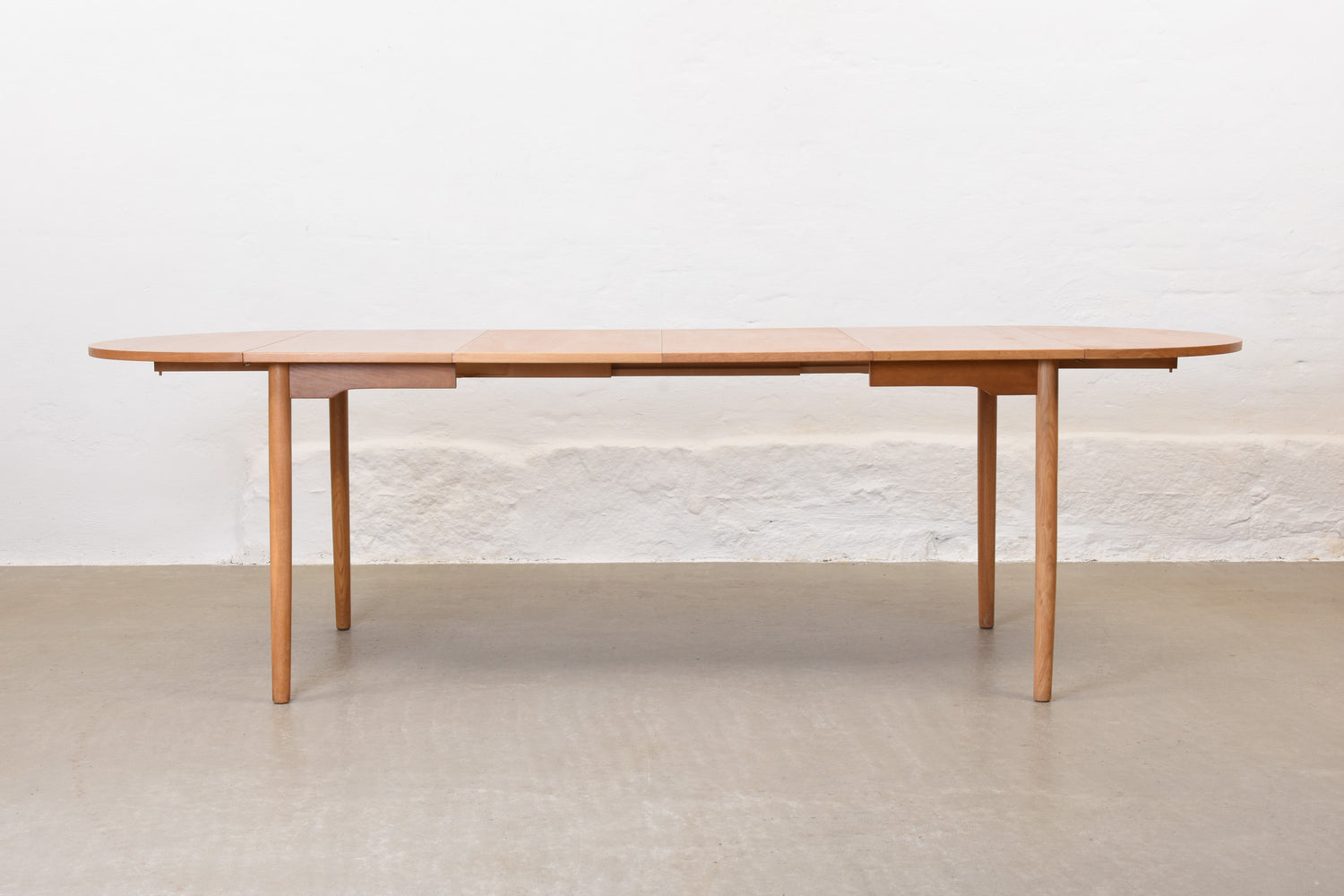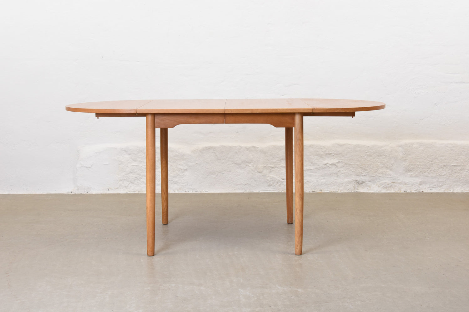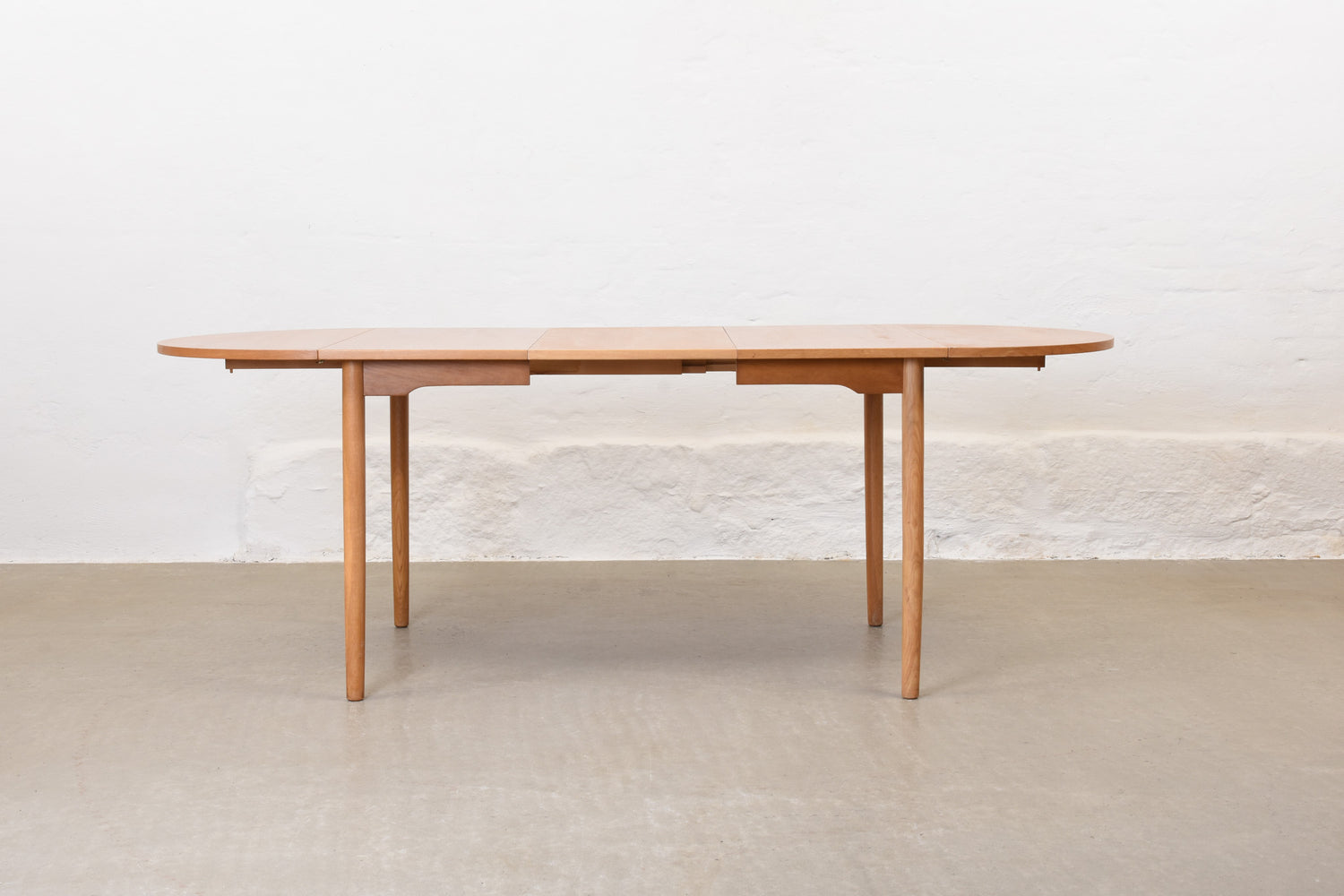 Extending dining table in oak with two removable drop-leaves and a further two drop-in extensions. When fully extended will sit up to eight comfortably.