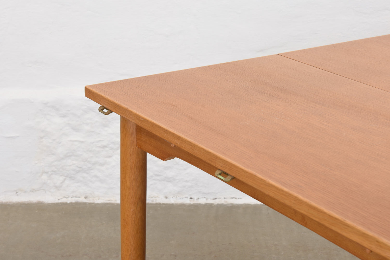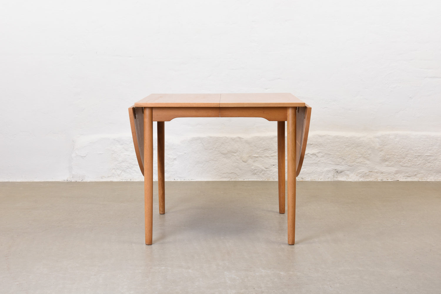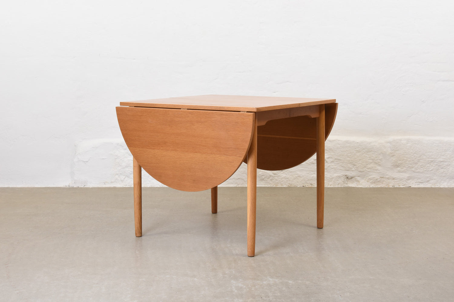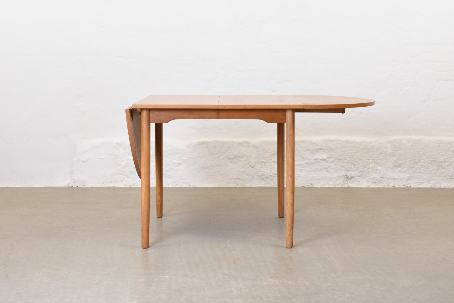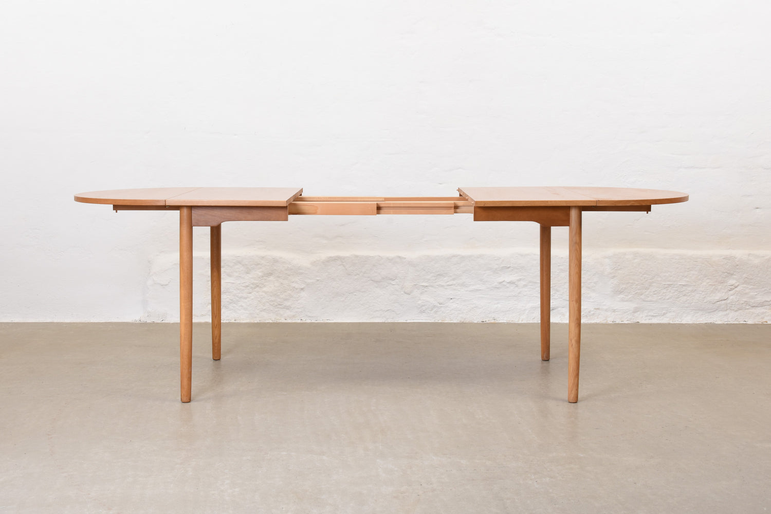Extending dining table in oak with two removable drop-leaves and a further two drop-in extensions. When fully extended will sit up to eight comfortably.