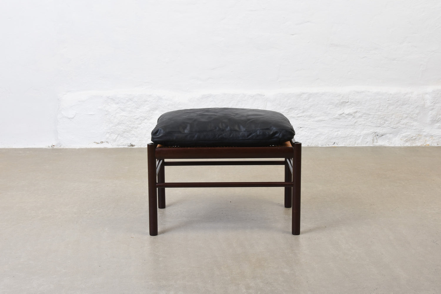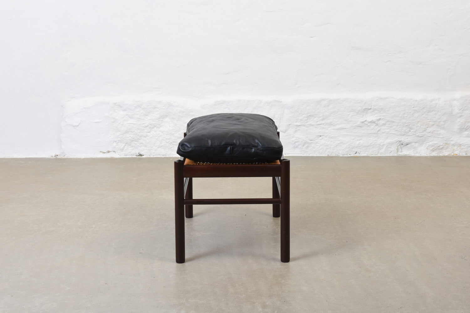 Model OW149F foot stool with a mahogany frame, woven cane top and feather-filled black leather cushion.