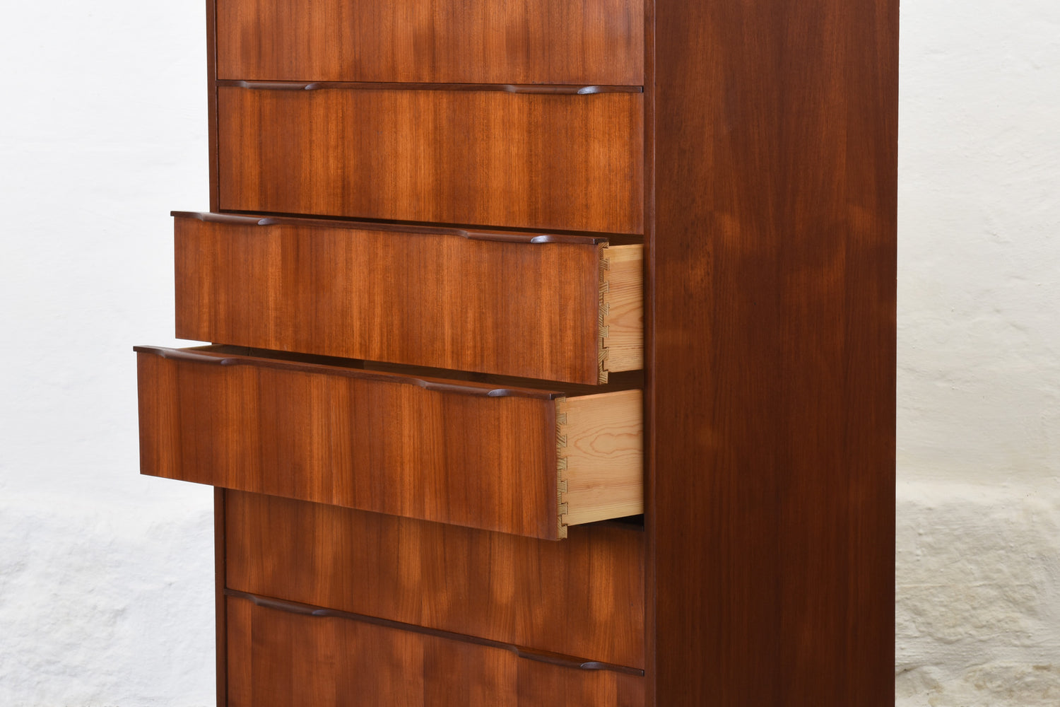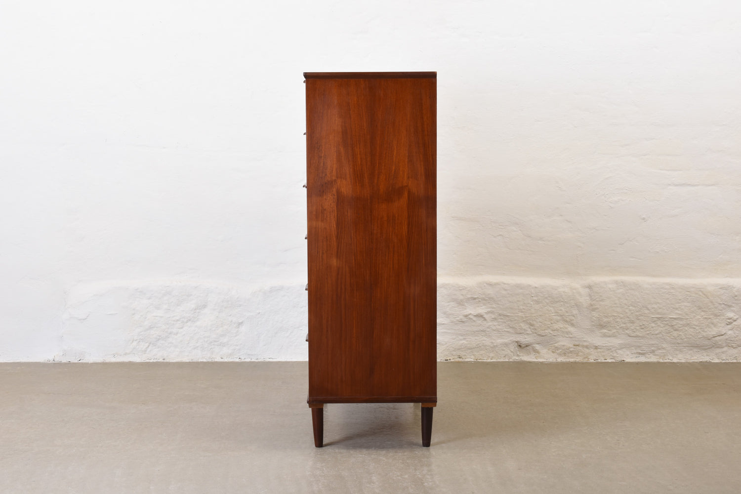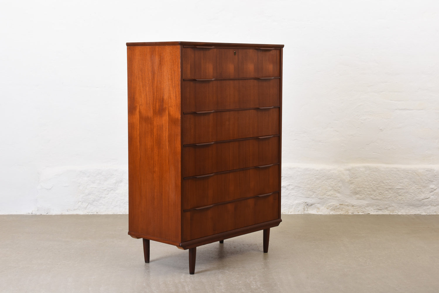 Large chest of six drawers in teak with lipped handles. Sits on turned solid teak legs.