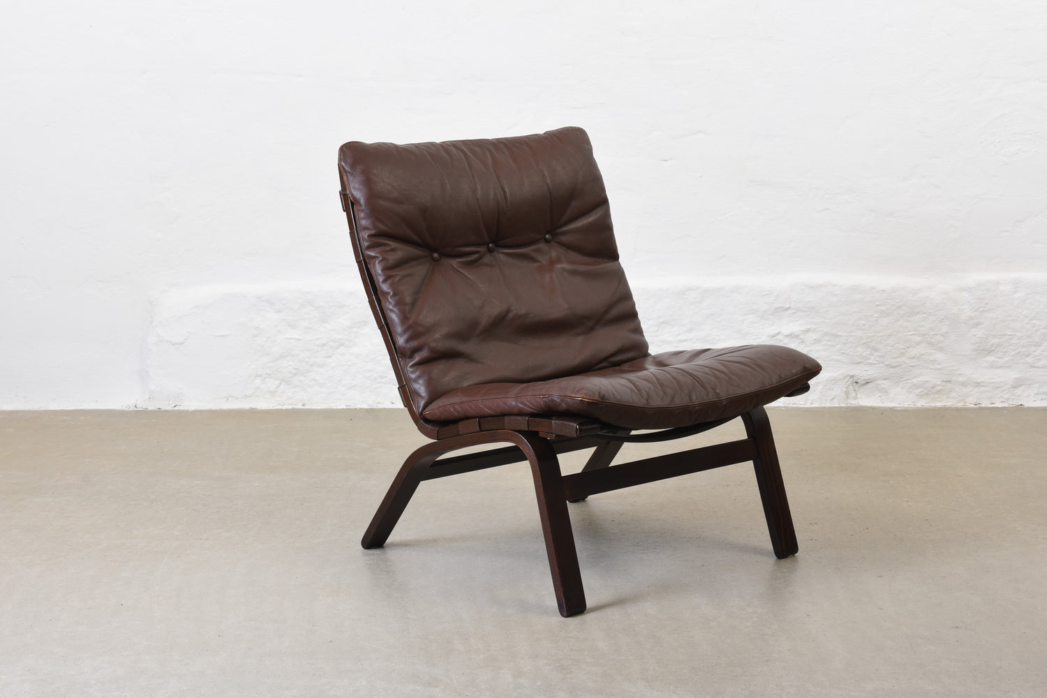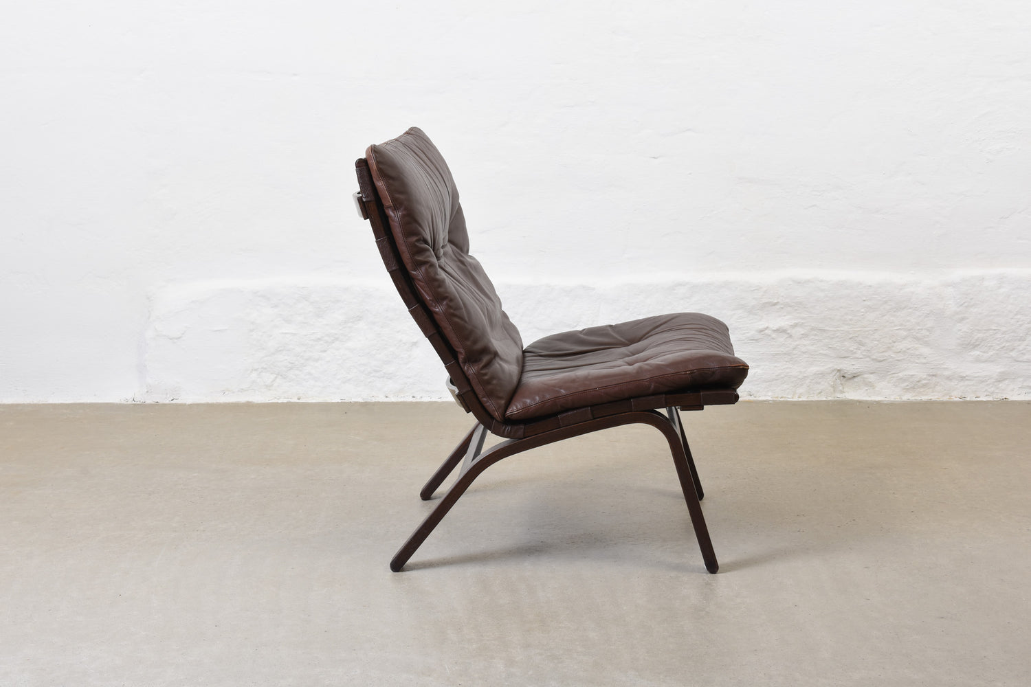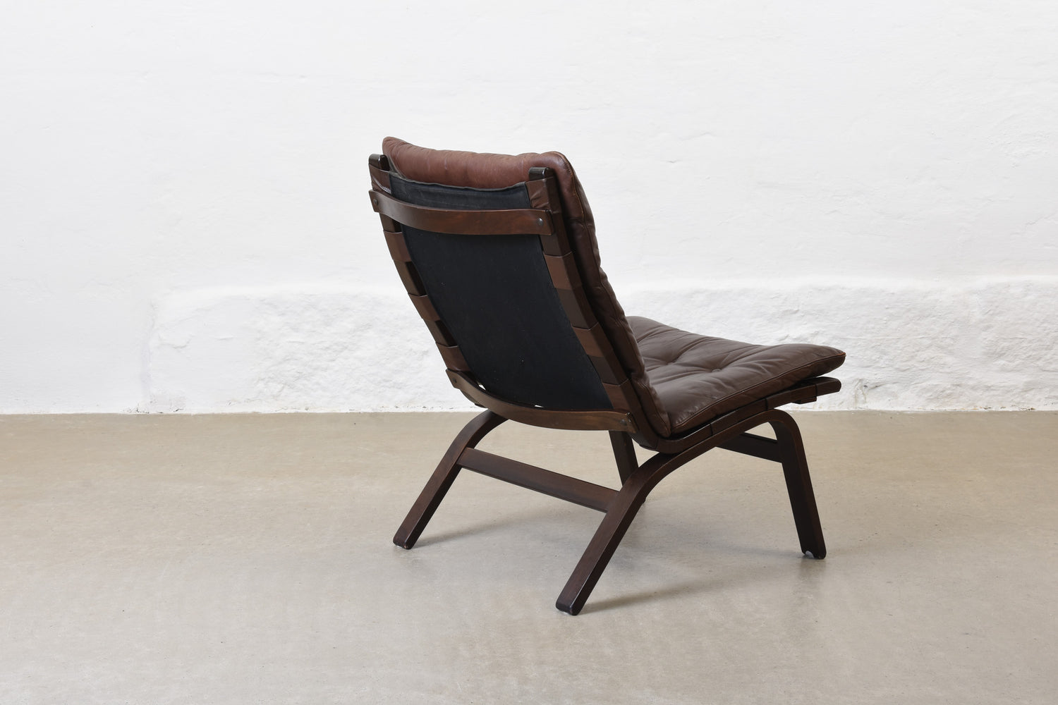 Low back lounge chair with a stained beech frame, canvas lining and leather pad cushion.