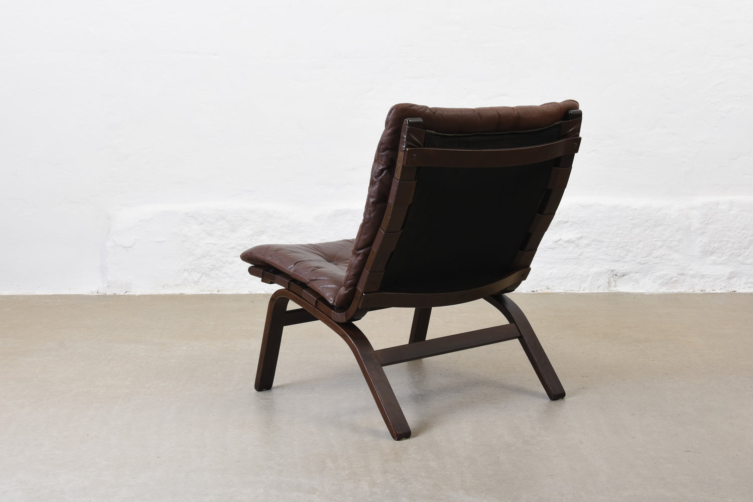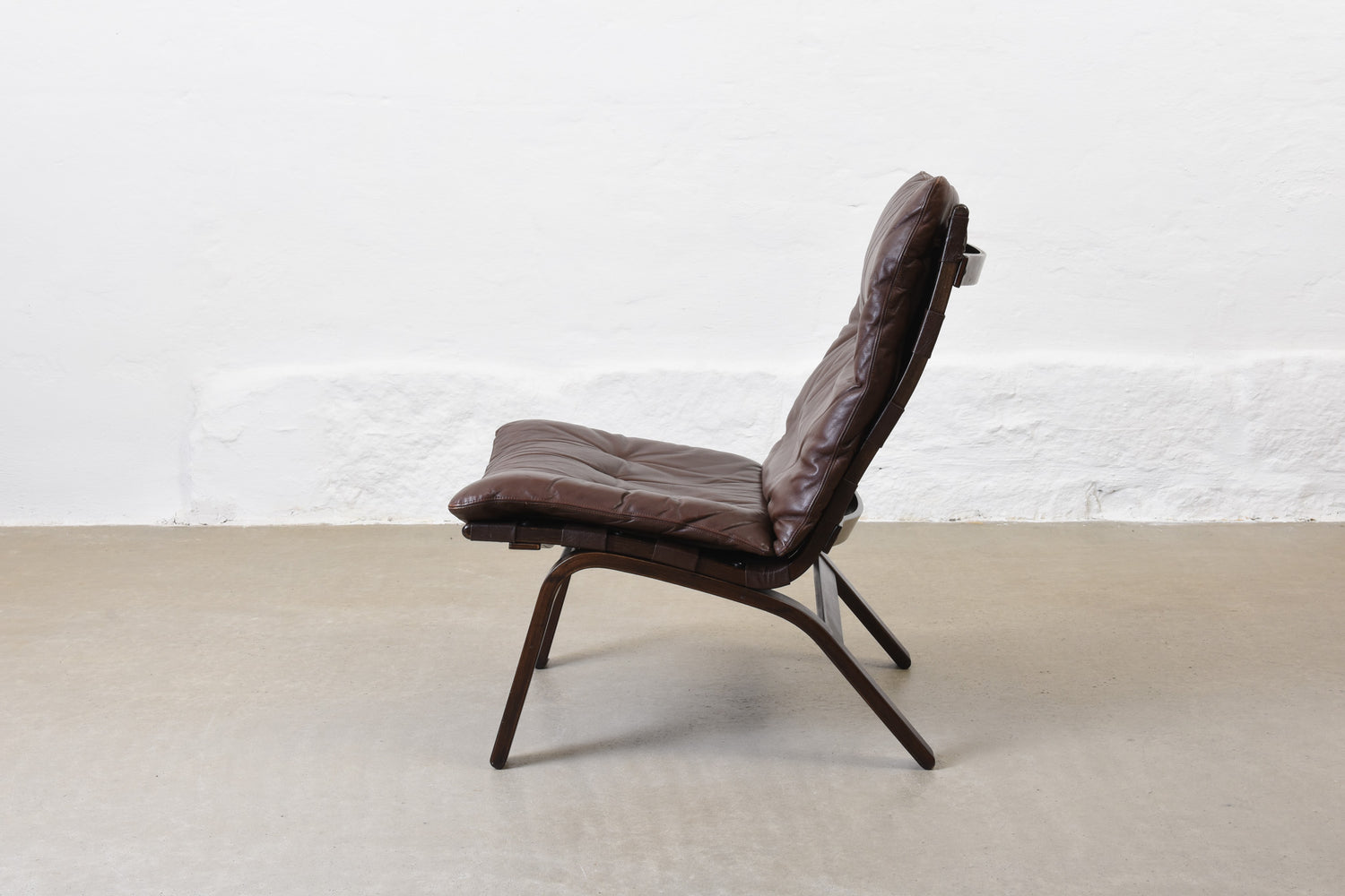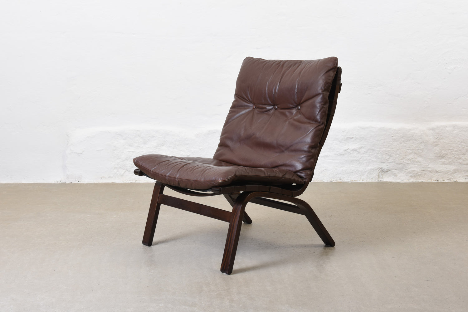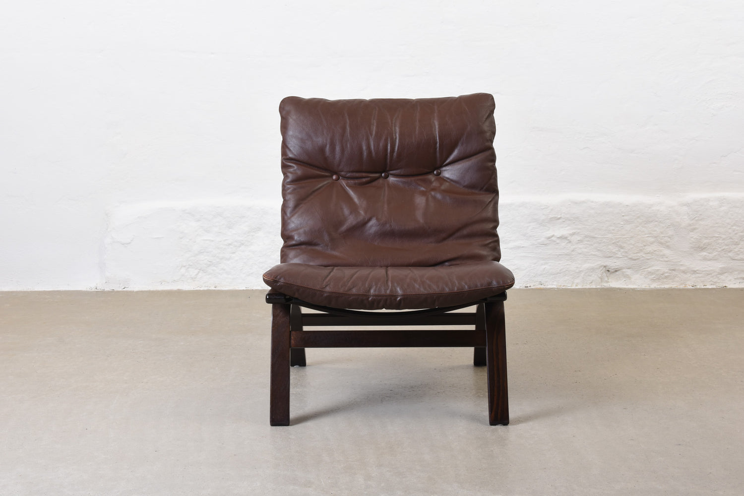 Low back lounge chair with a stained beech frame, canvas lining and leather pad cushion.