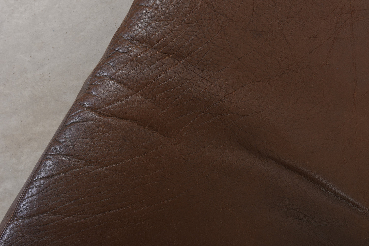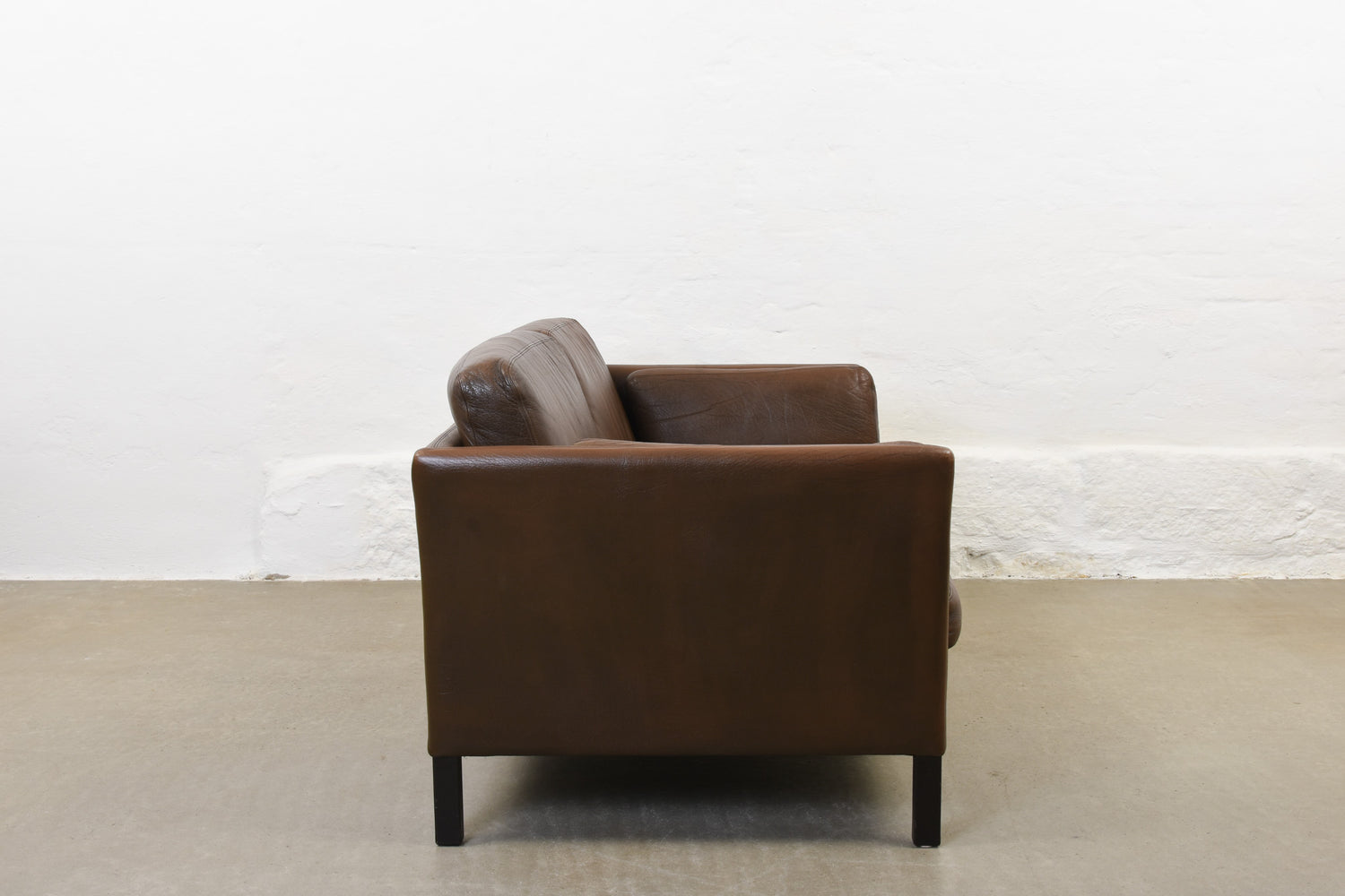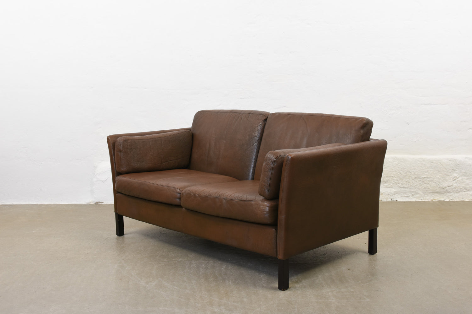 Vintage two seat leather sofa with six loose foam filled cushions. Sits on stained beech legs.