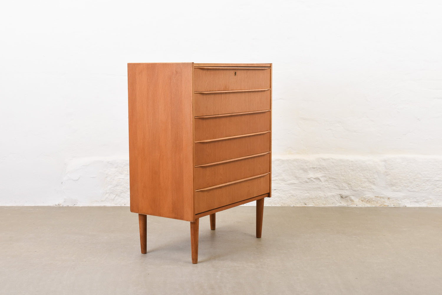 Chest of six drawers in oak with lipped handles. Sits on turned oak legs.