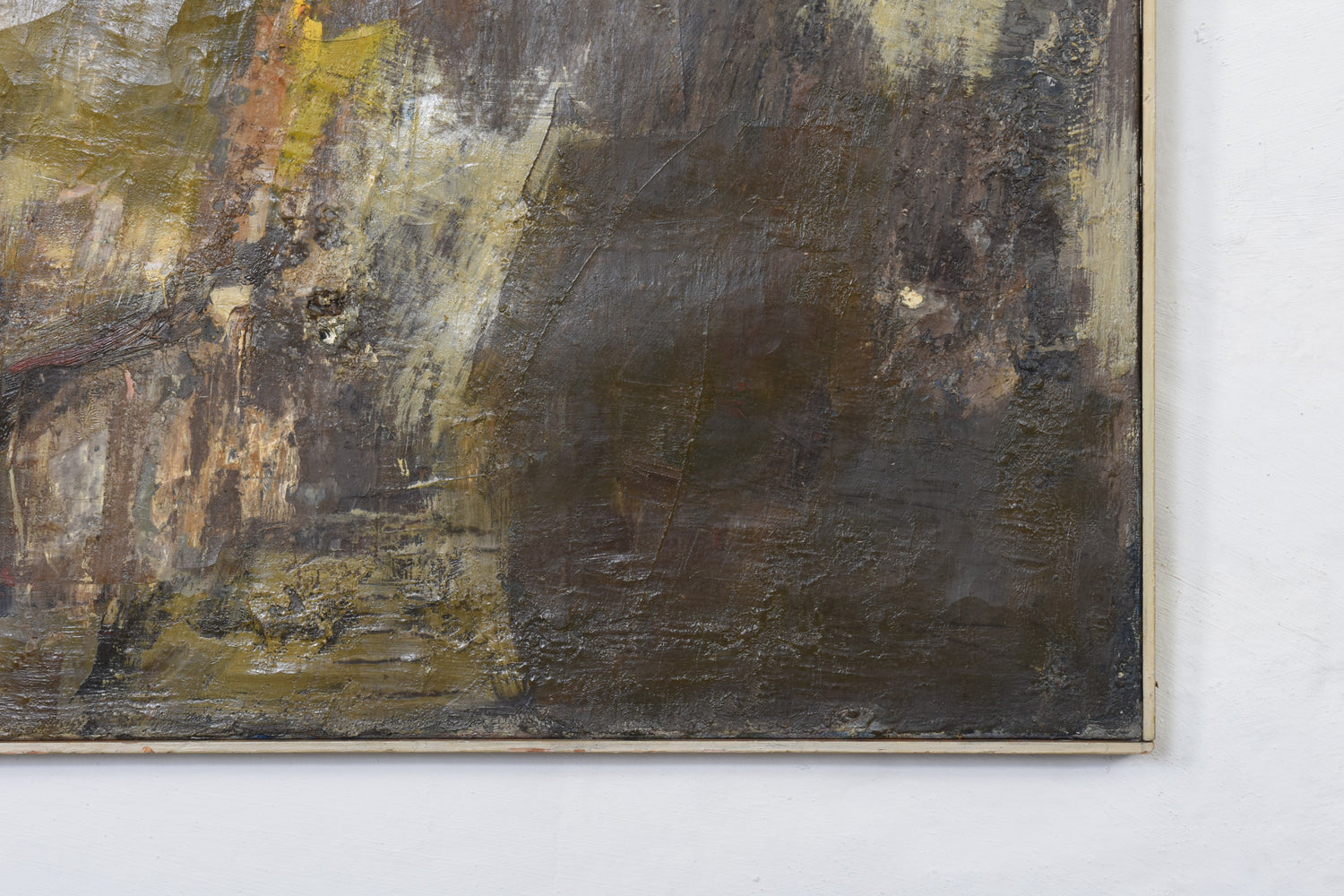 In this abstract oil on canvas, artist Flemming Lipholt (1925-1995) has opposed cool and warm earthy colours. Sweeping gestures of paint collide and run over each other to further emphasise the dramatic atmosphere of this painting. Areas of the canvas are layered with thick paint, giving a sense of three-dimensional form and also conveying to us that the artist genuinely seems to have enjoyed exploring the textural qualities of paint.