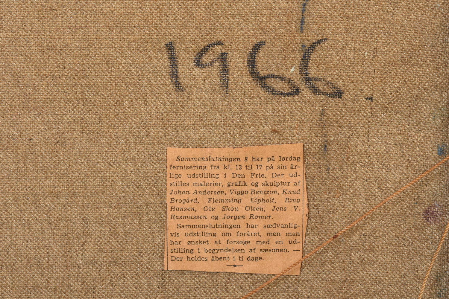 The text on the reverse of the canvas describes an annual exhibition held in the Den Frie building, in which Flemming Lipholt was showing alongside seven other artists. Den Frie Udstilling is Denmark's oldest artists' association and the mid-century marked the first time that abstract art such as Lipholt’s was seriously represented.