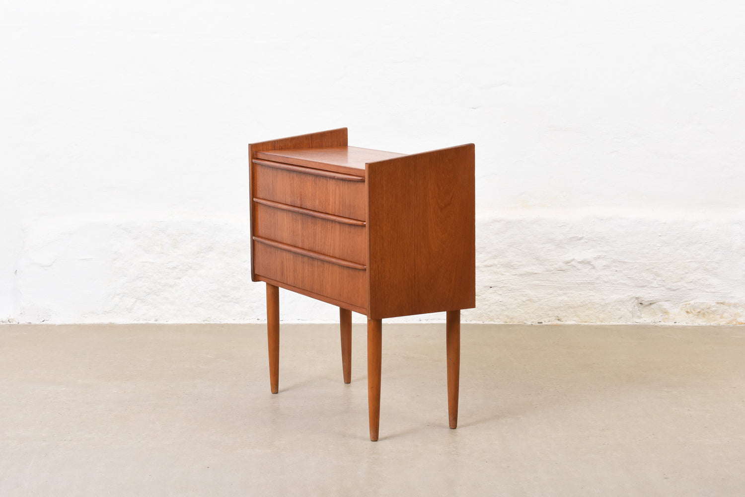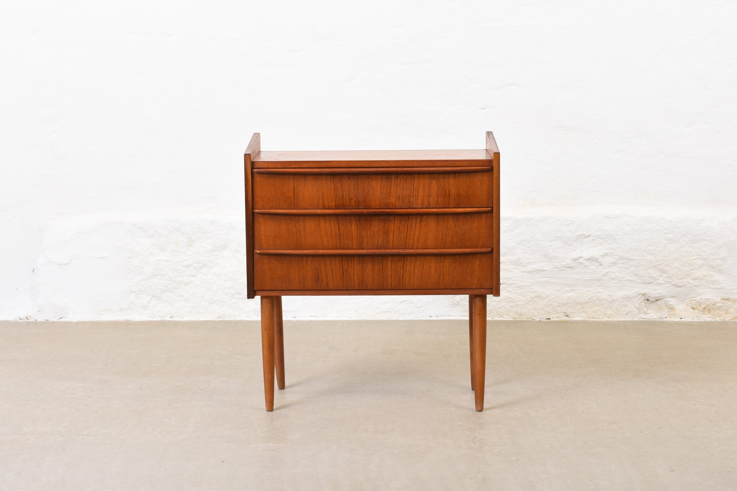 Low chest of three drawers in teak with lipped handles.