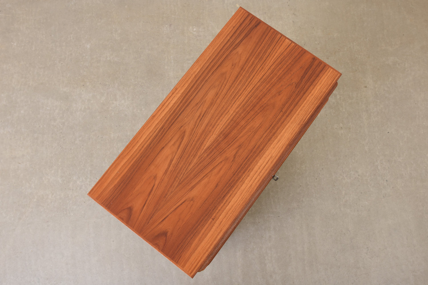 Teak chest of six drawers with lipped handles and locking top drawer (original key included). Sits on tapered beech legs.