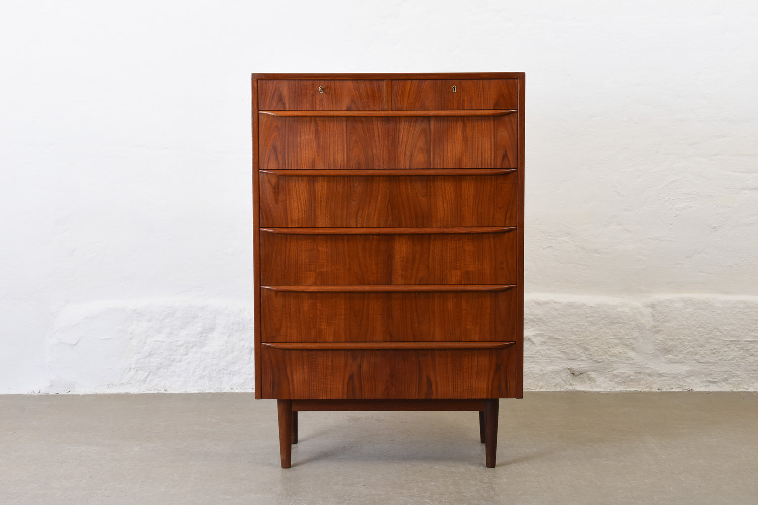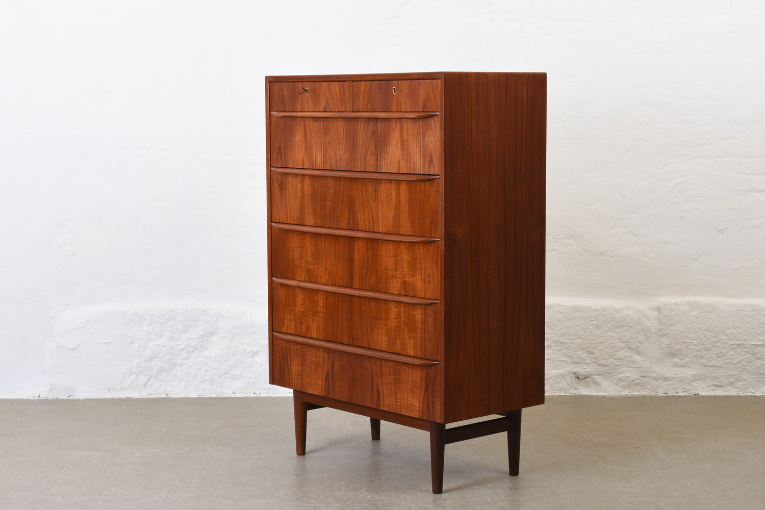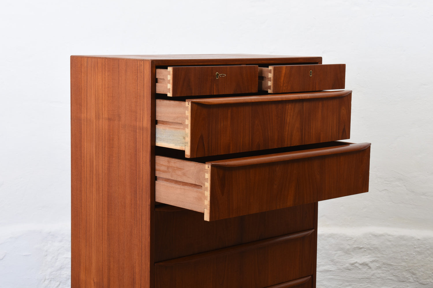 Superior quality, masterfully crafted Danish chest of seven drawers in teak with oak-lined drawers.