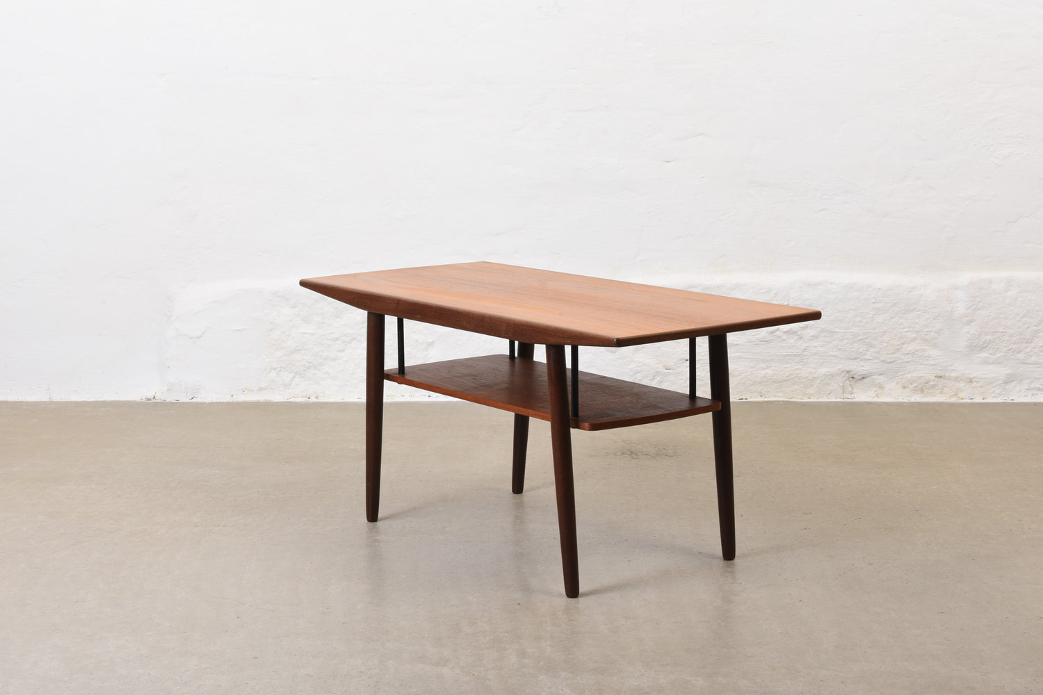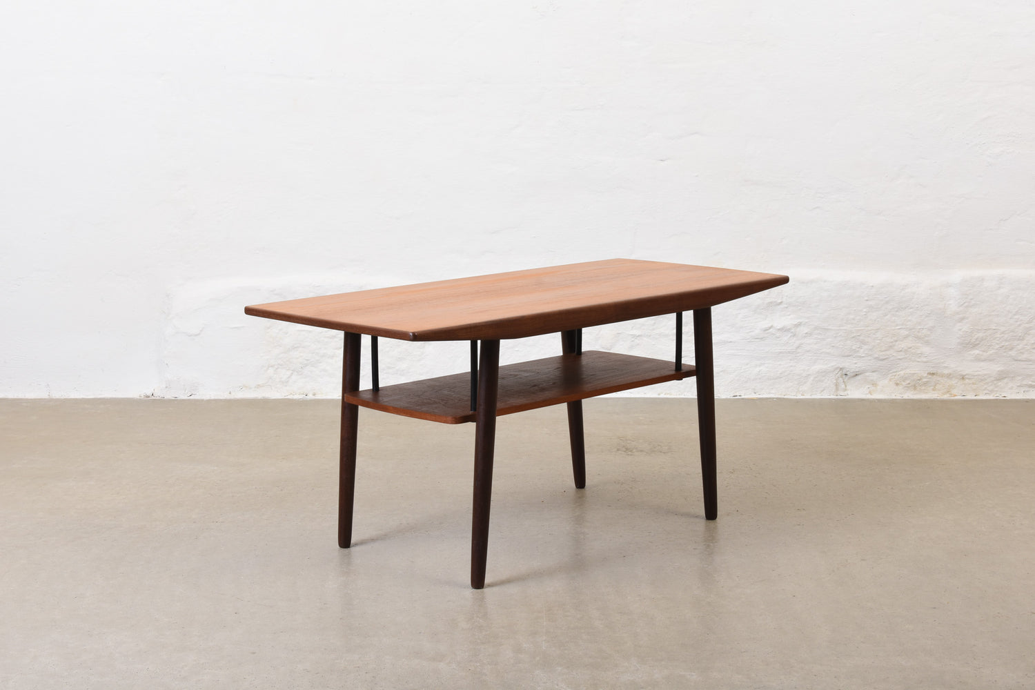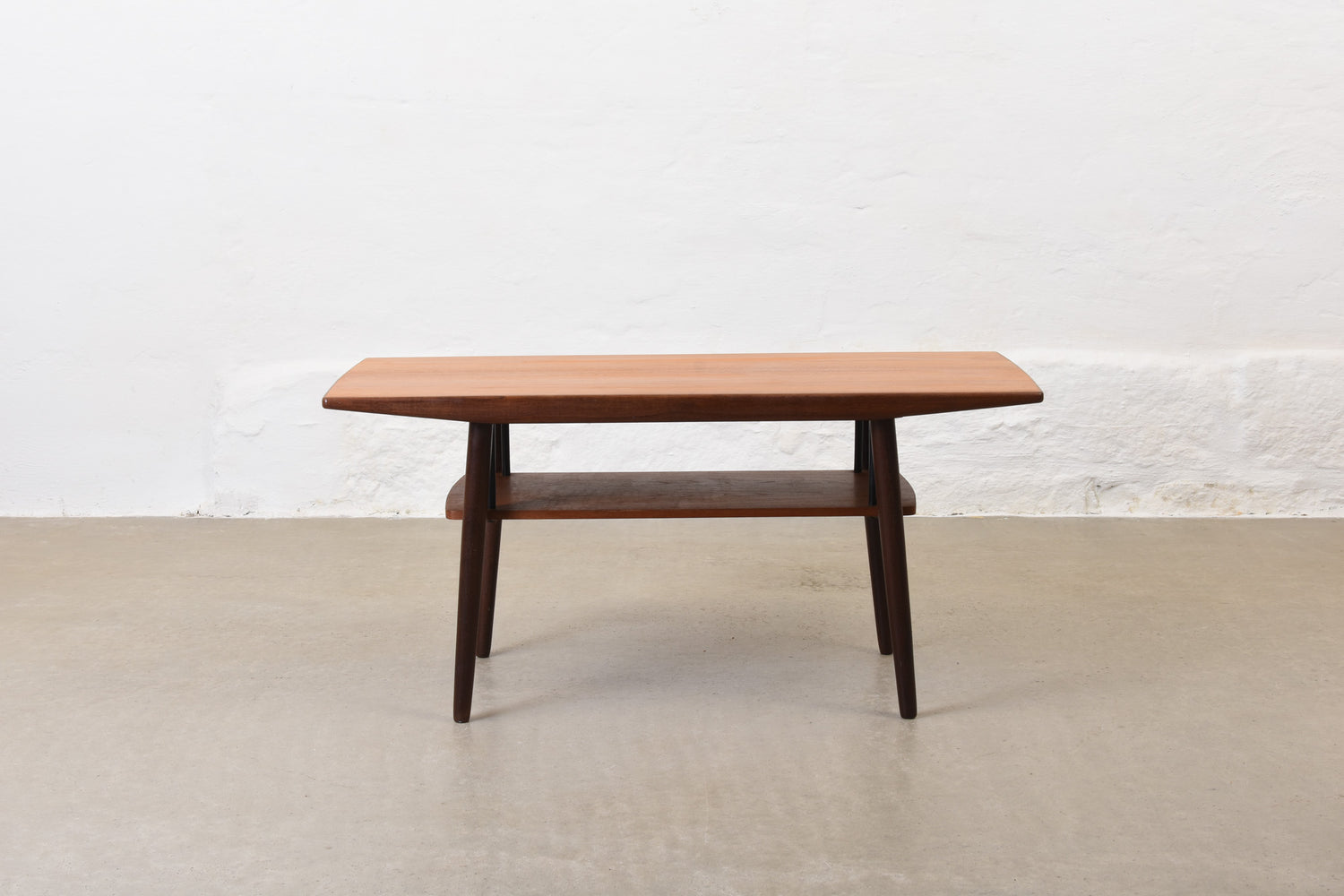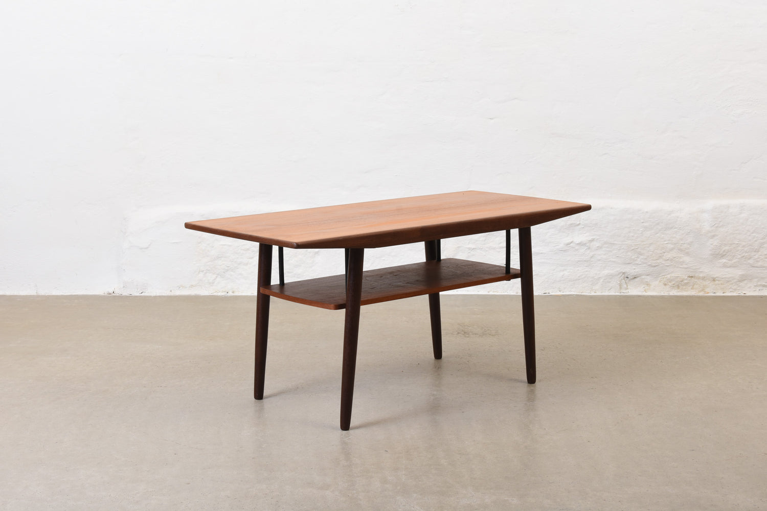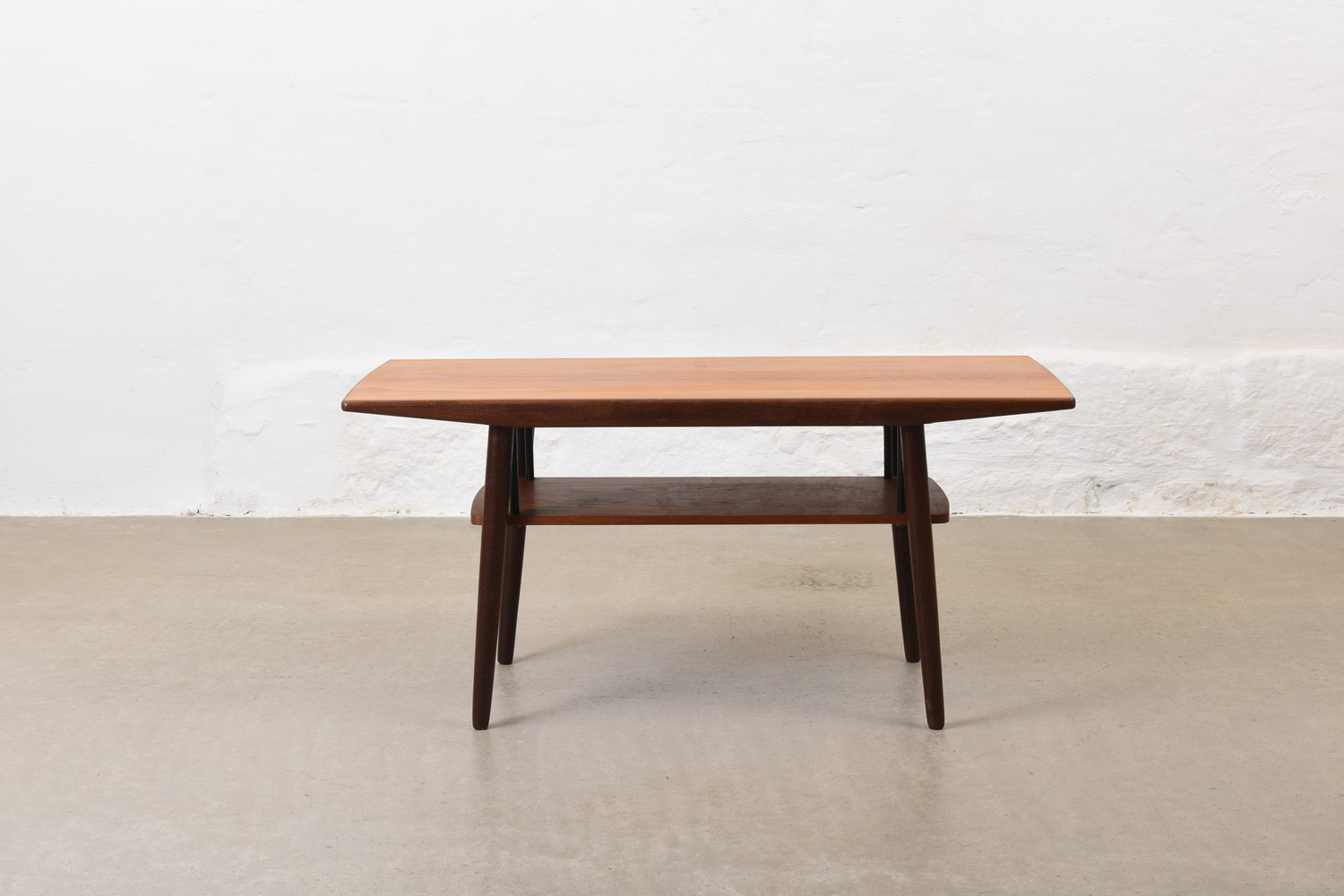Coffee table in teak with magazine shelf.