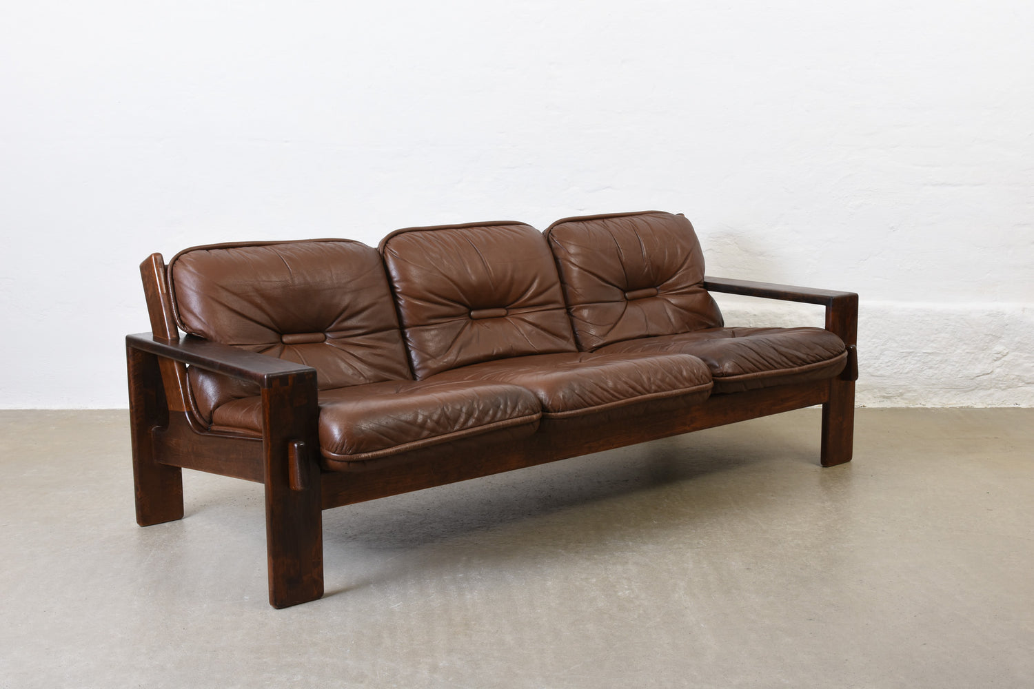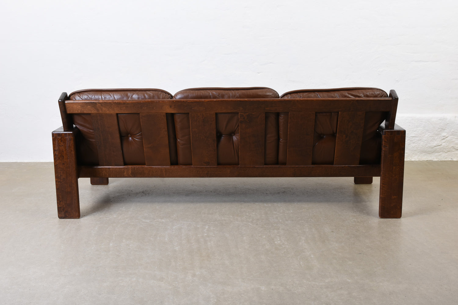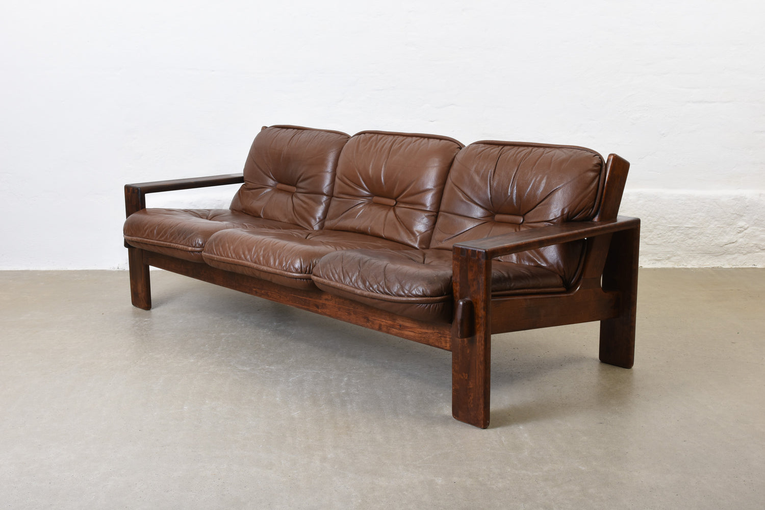 Low back three seat 'Bonanza' sofa with a solid stained beech frame and leather pad cushions with foam filling.