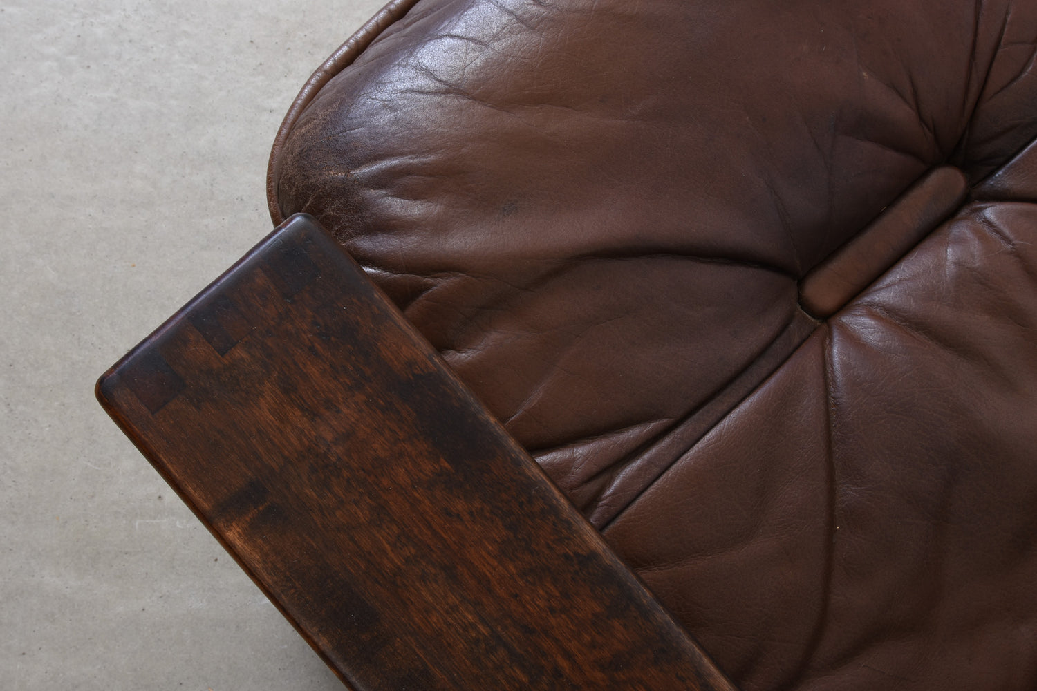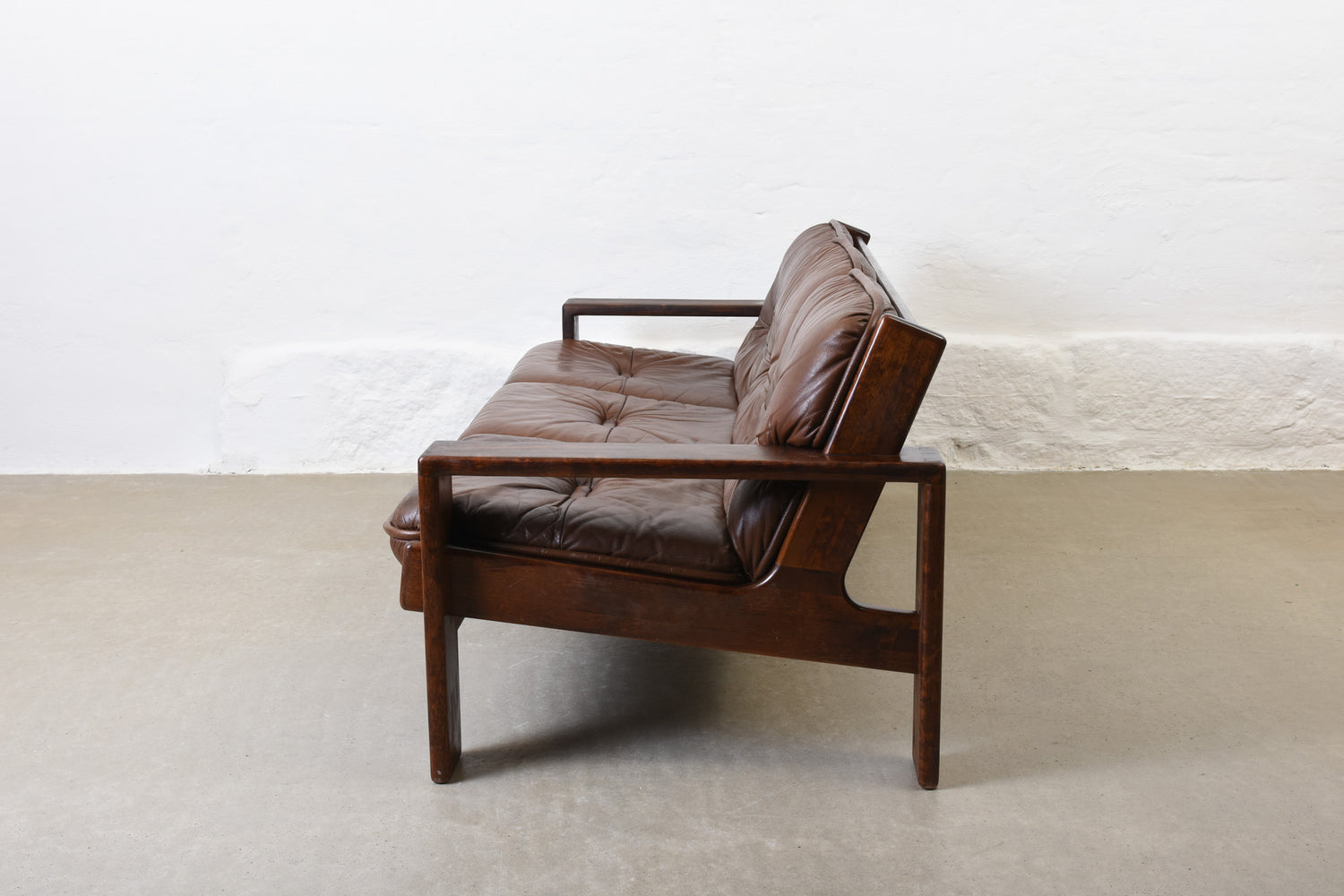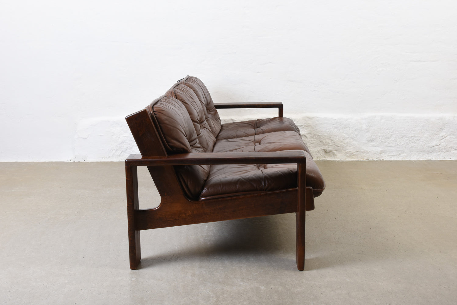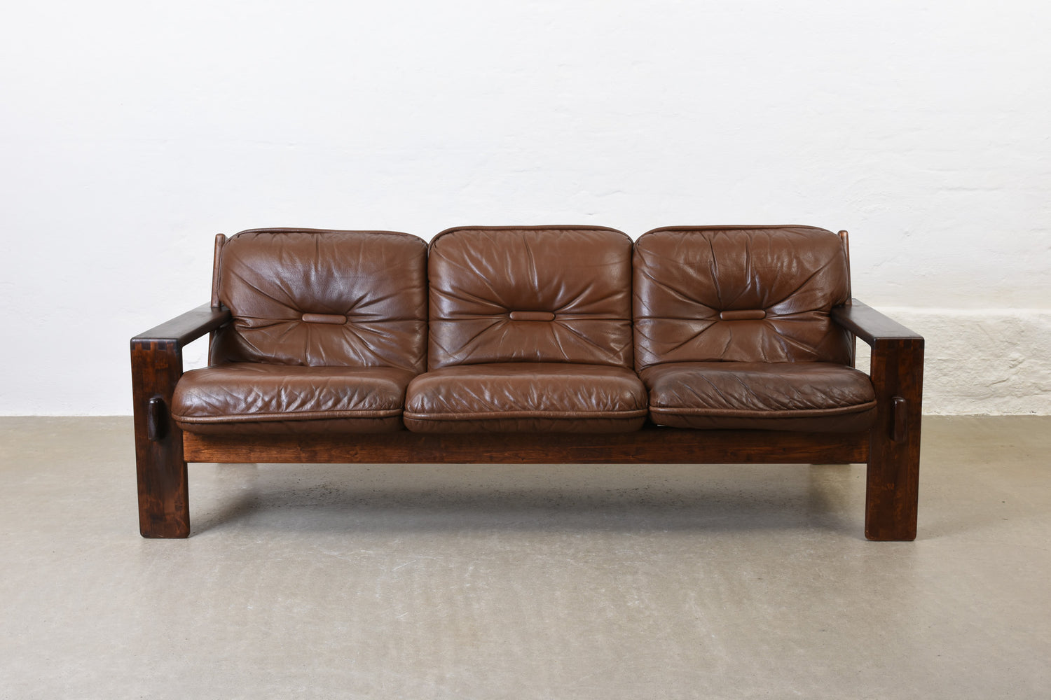 Low back three seat 'Bonanza' sofa with a solid stained beech frame and leather pad cushions with foam filling.