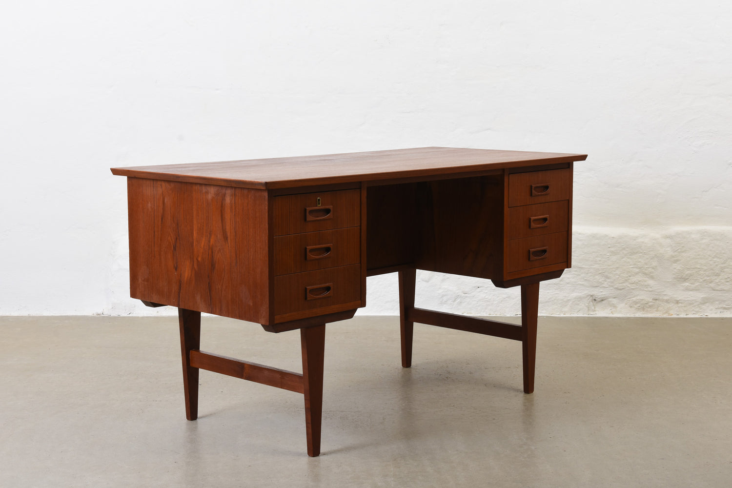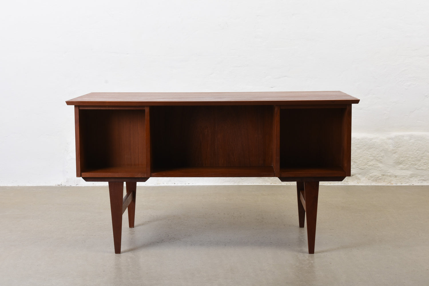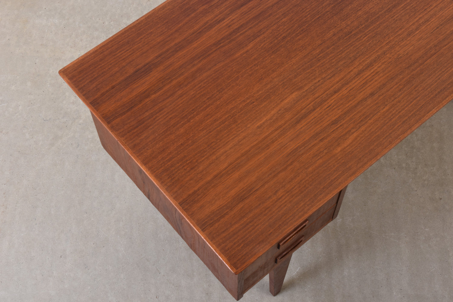 Twin pedestal desk in teak featuring six drawers with inset handles as well as a rear bookshelf.