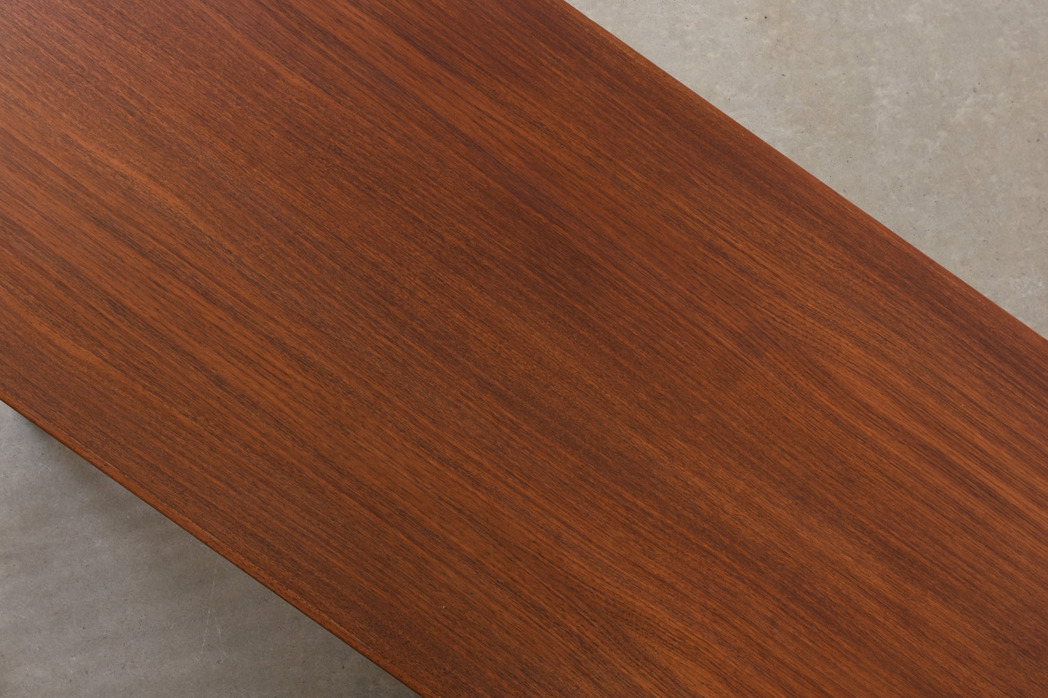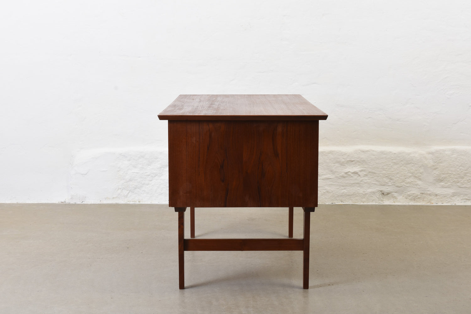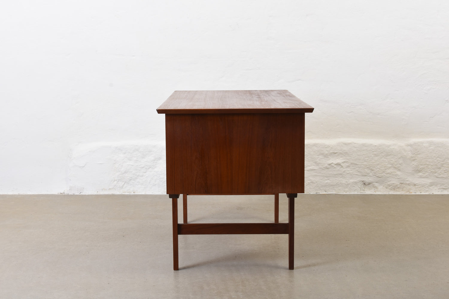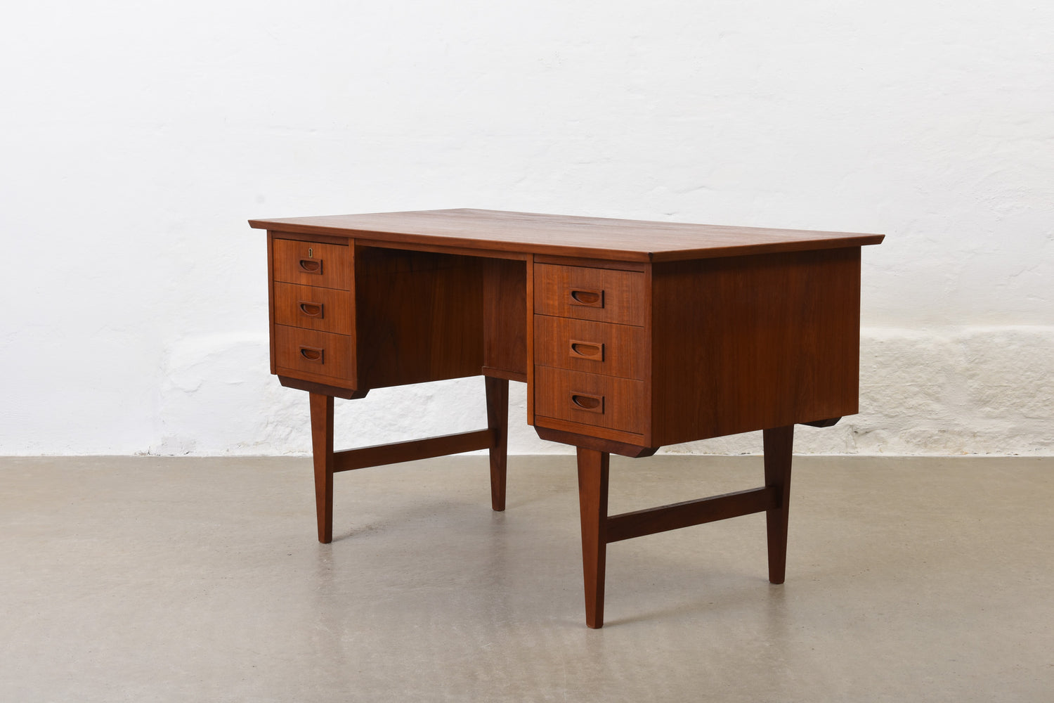 Twin pedestal desk in teak featuring six drawers with inset handles as well as a rear bookshelf.