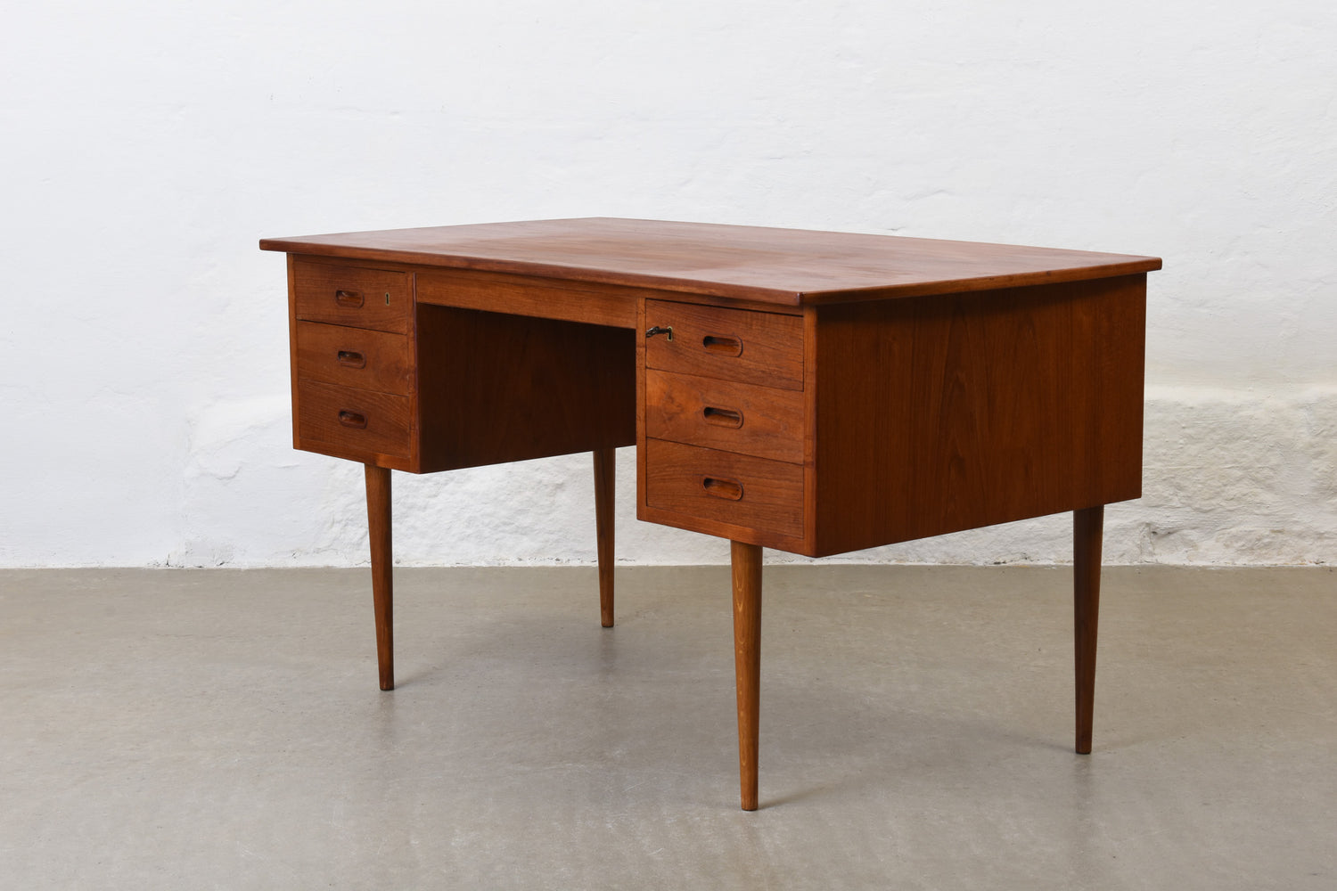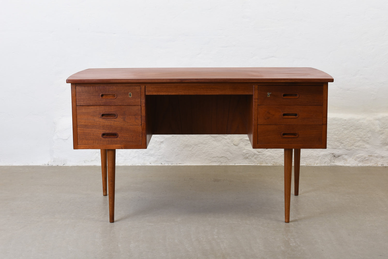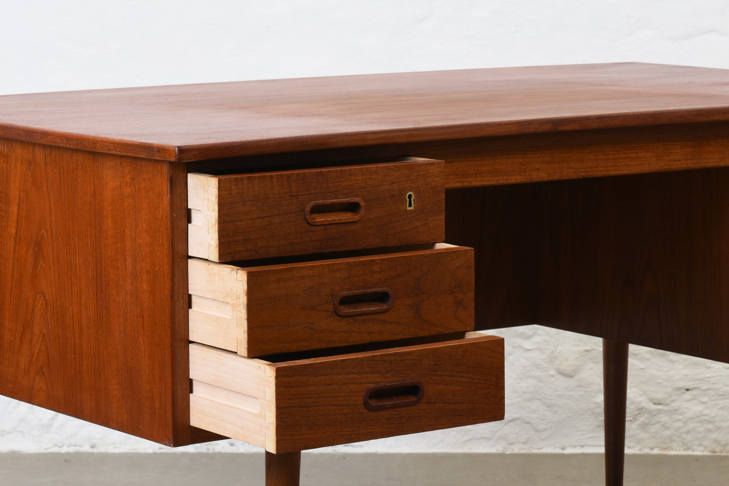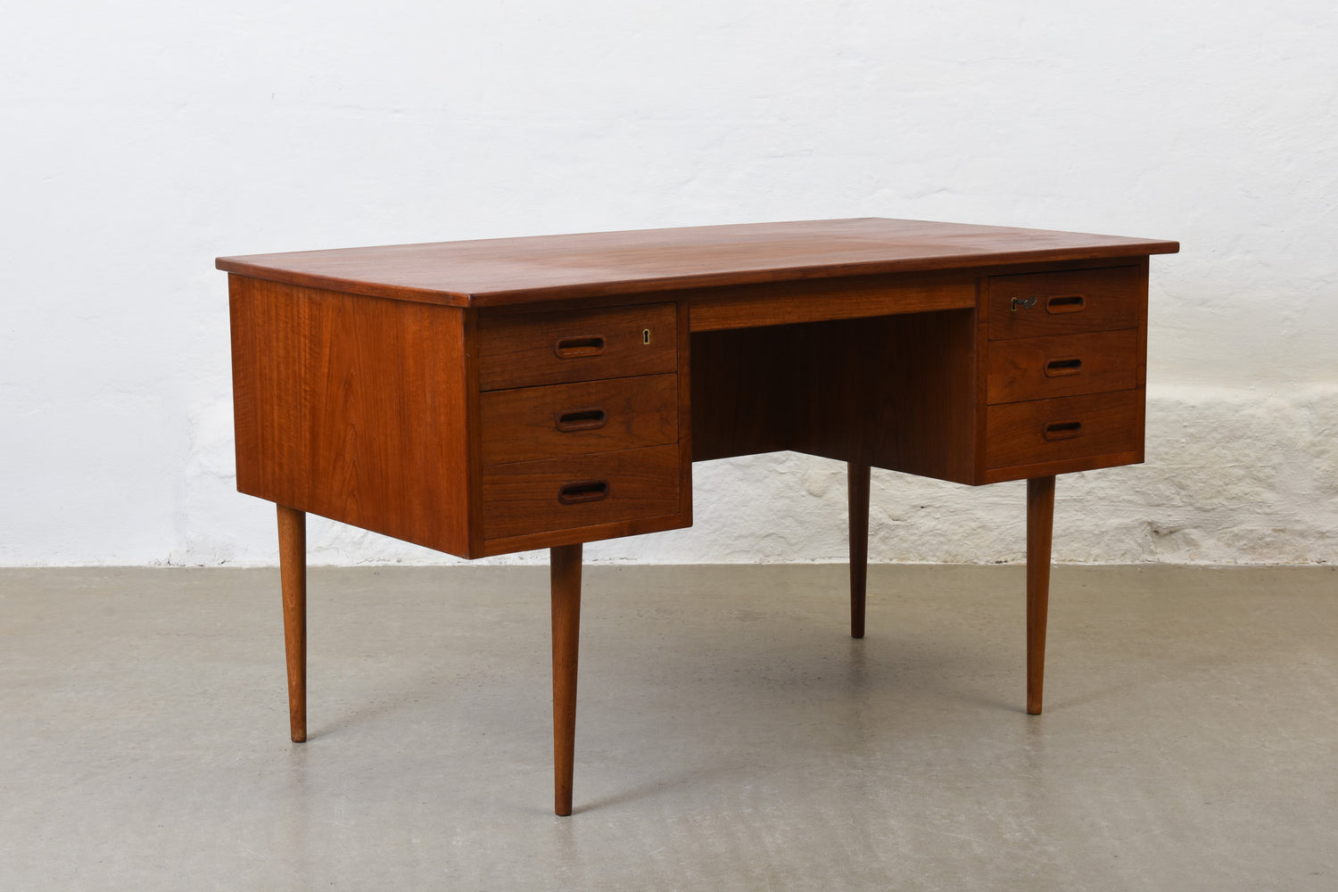 Twin pedestal desk in teak with a selection of six drawers and rear bookshelf. Sits on turned solid oak legs.