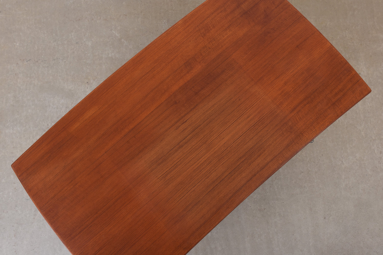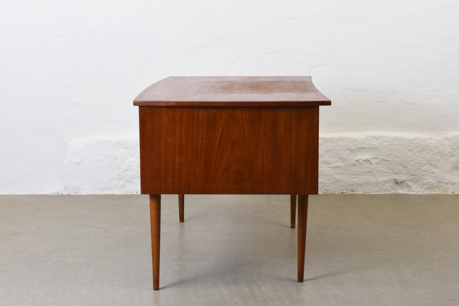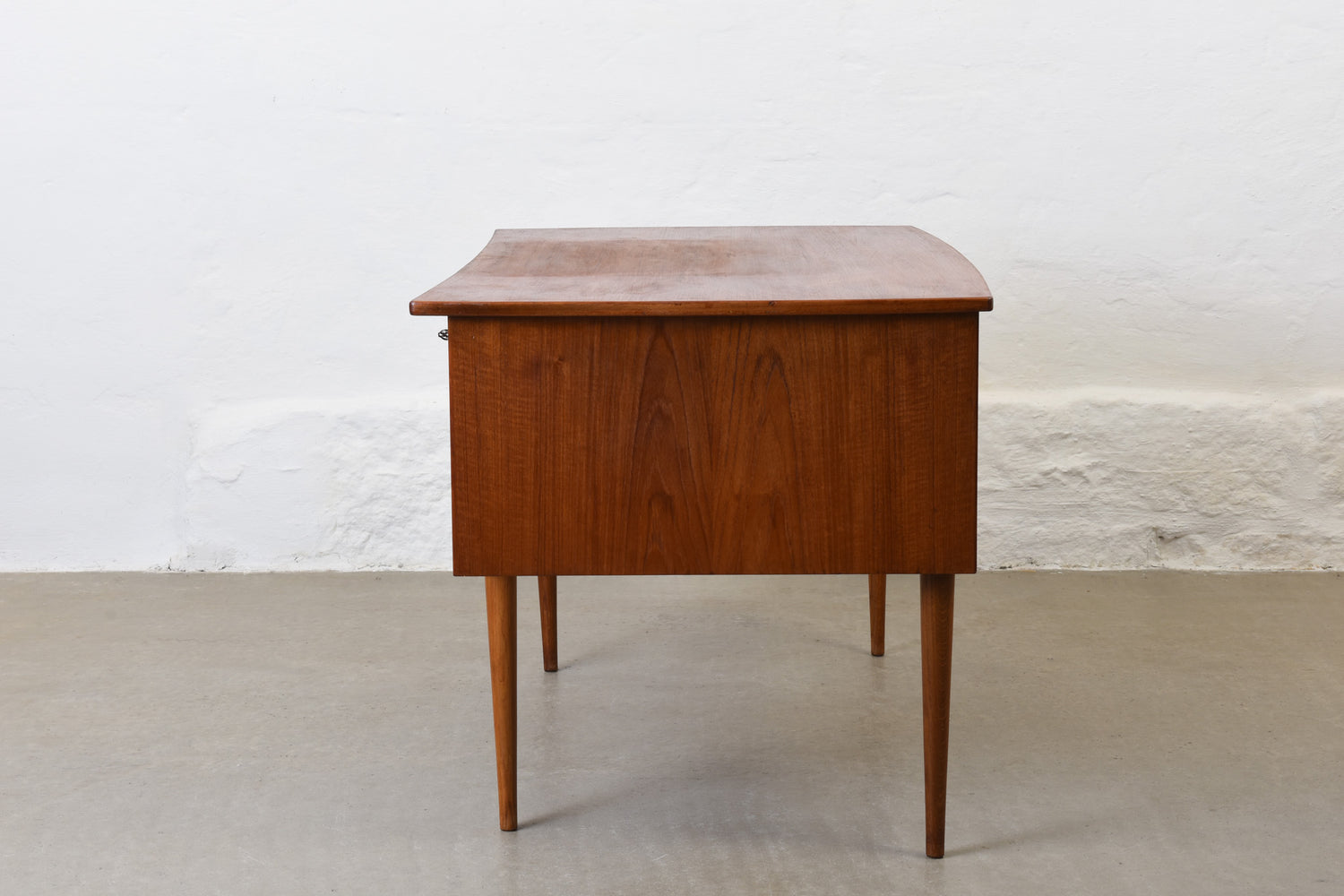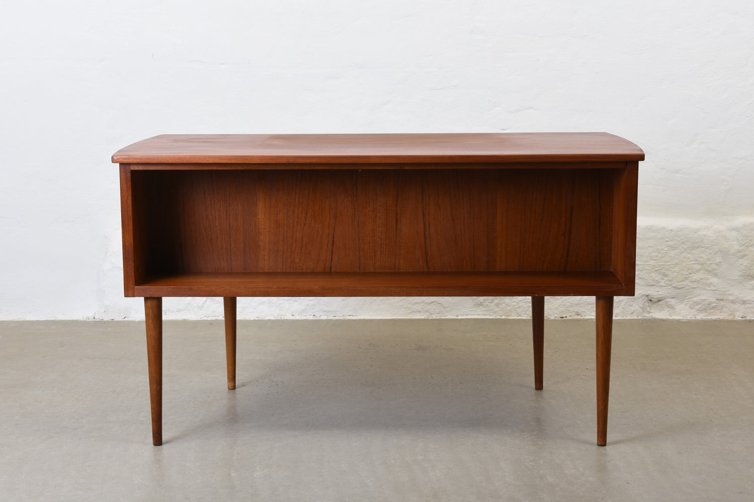 Twin pedestal desk in teak with a selection of six drawers and rear bookshelf. Sits on turned solid oak legs.