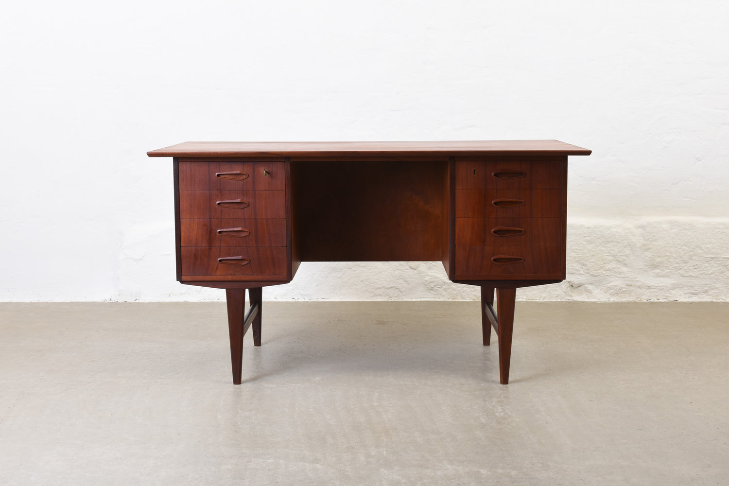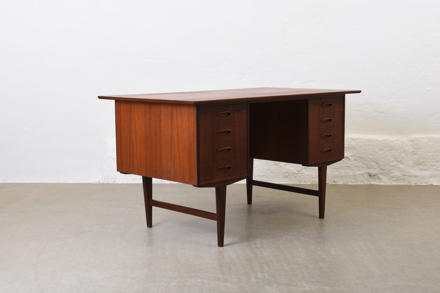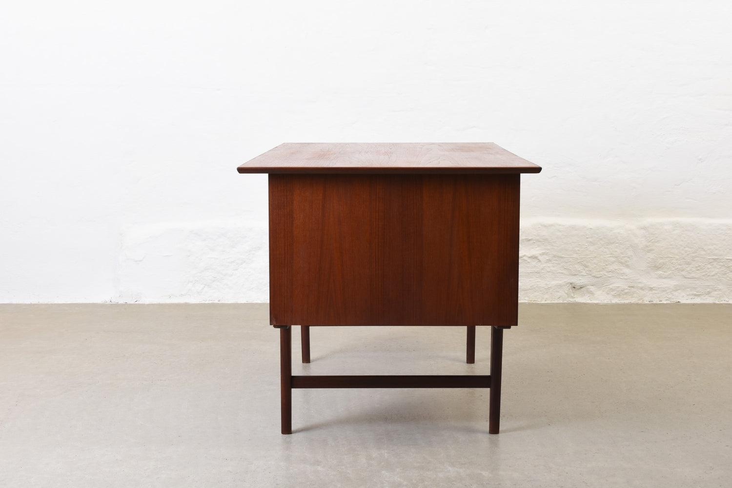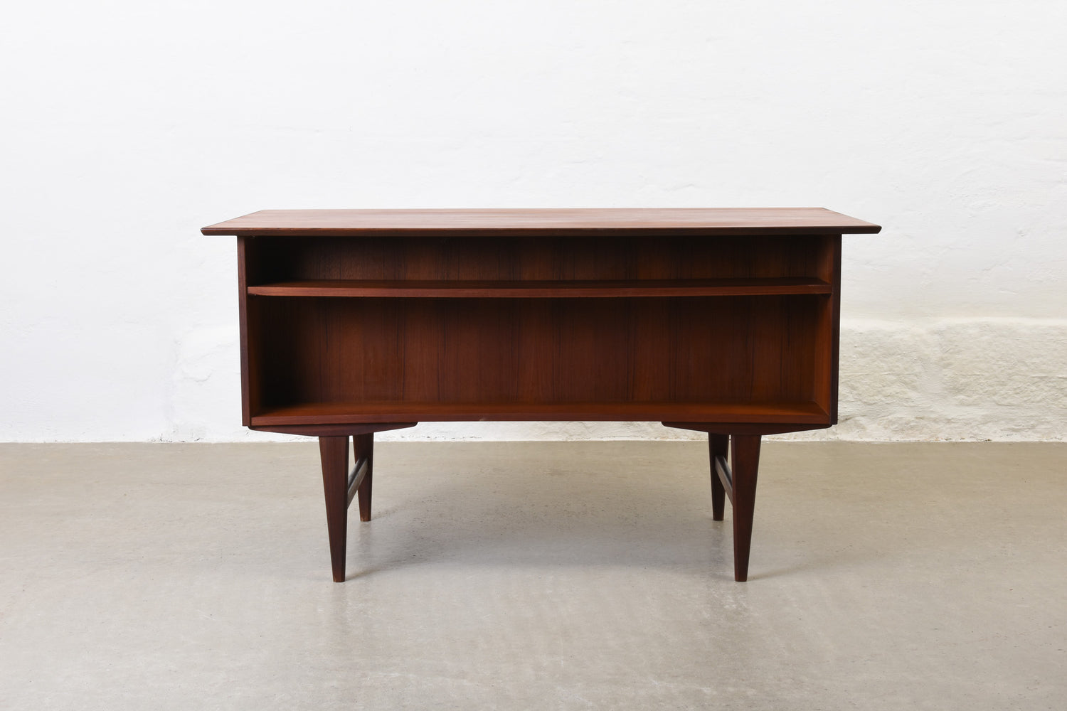Twin pedestal desk in teak with a selection of eight drawers and rear bookshelf.