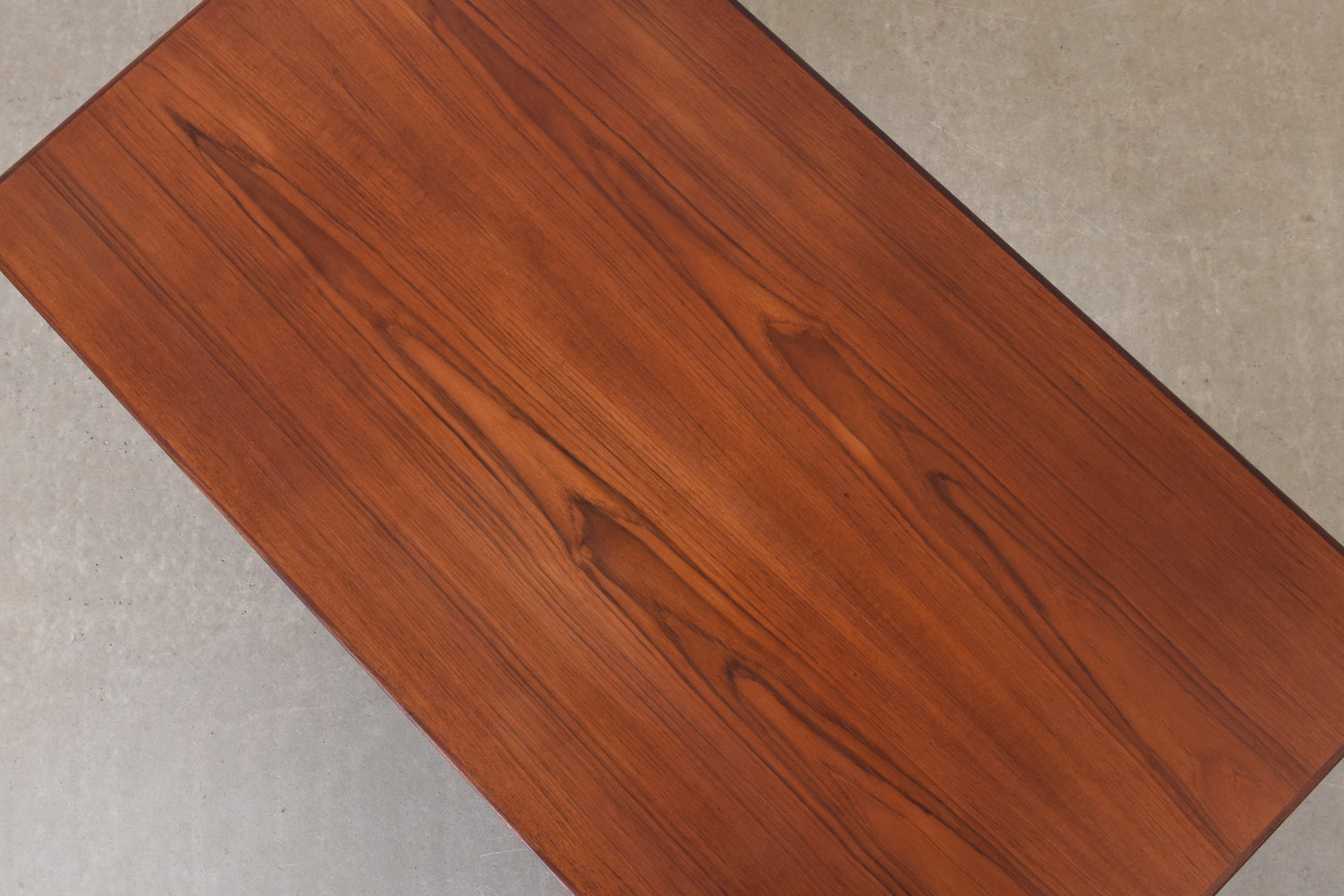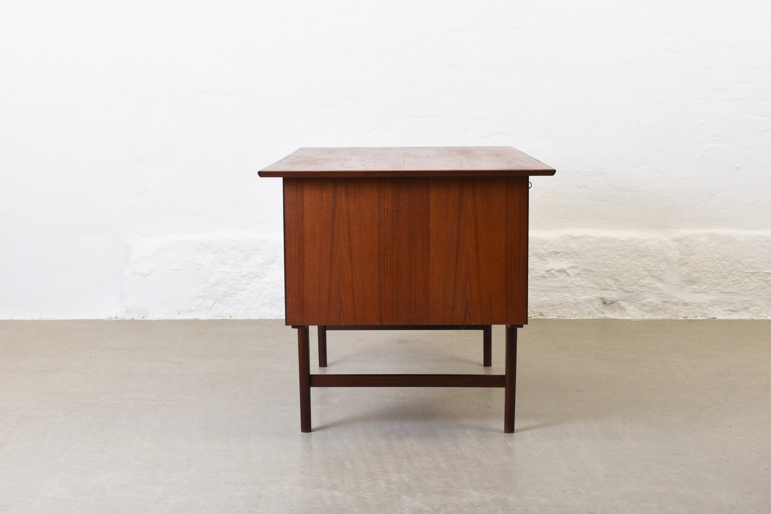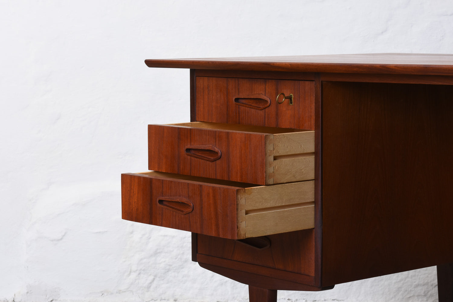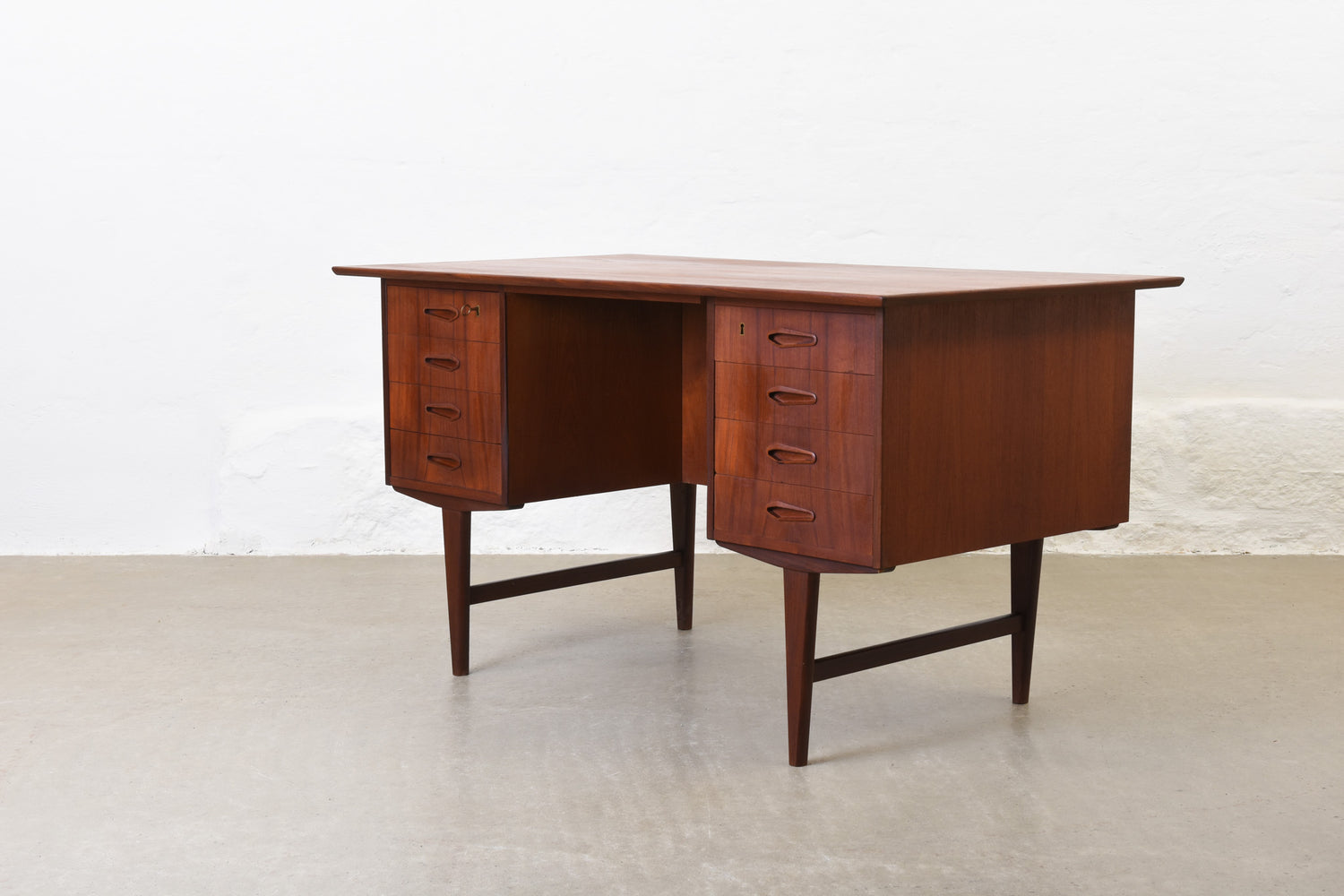 Twin pedestal desk in teak with a selection of eight drawers and rear bookshelf.