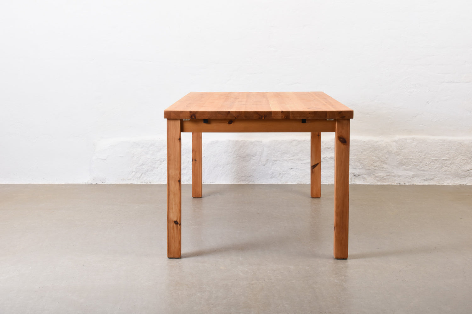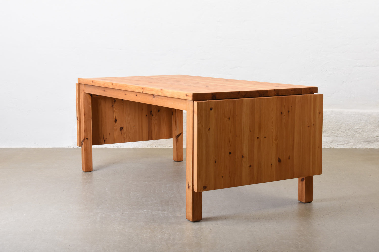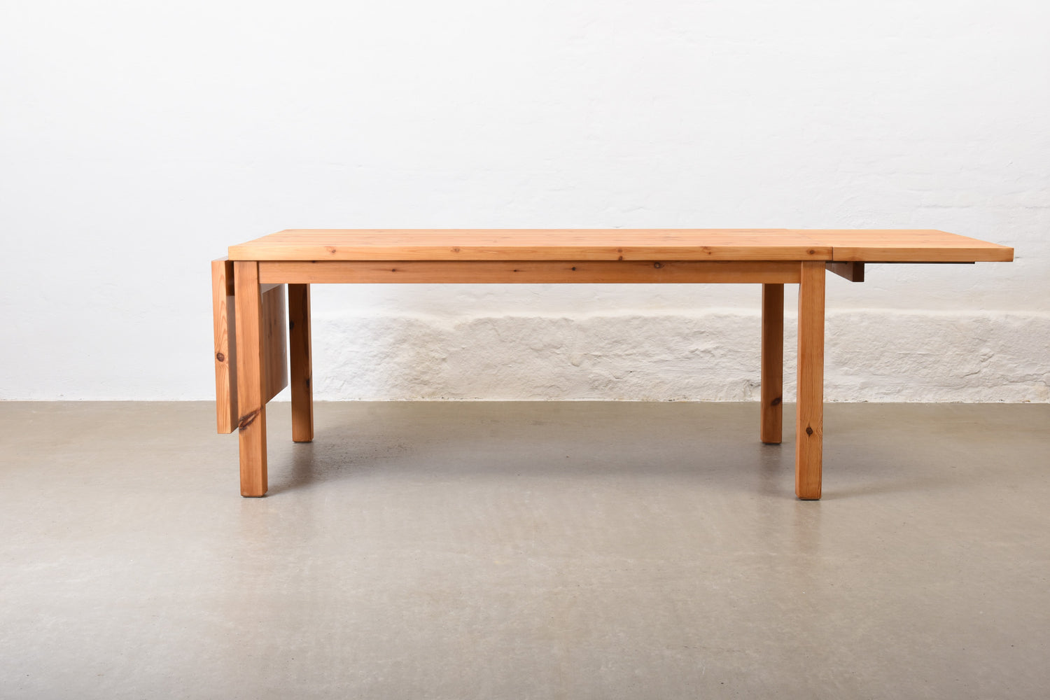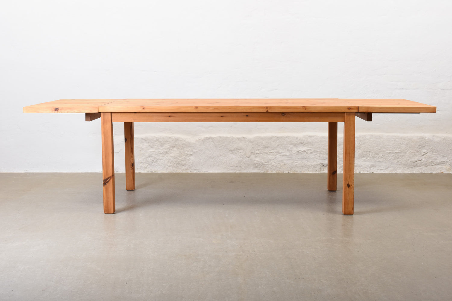 Large dining table in solid pine with two removable drop-leaf extensions. Sits six to eight normally and ten to twelve when fully extended.