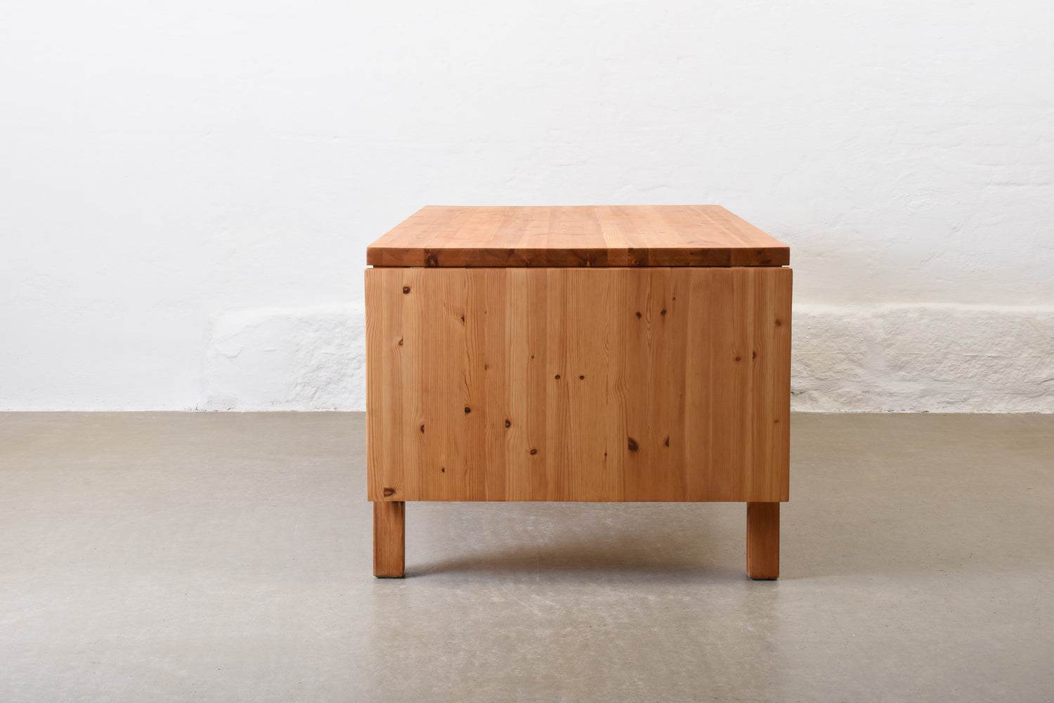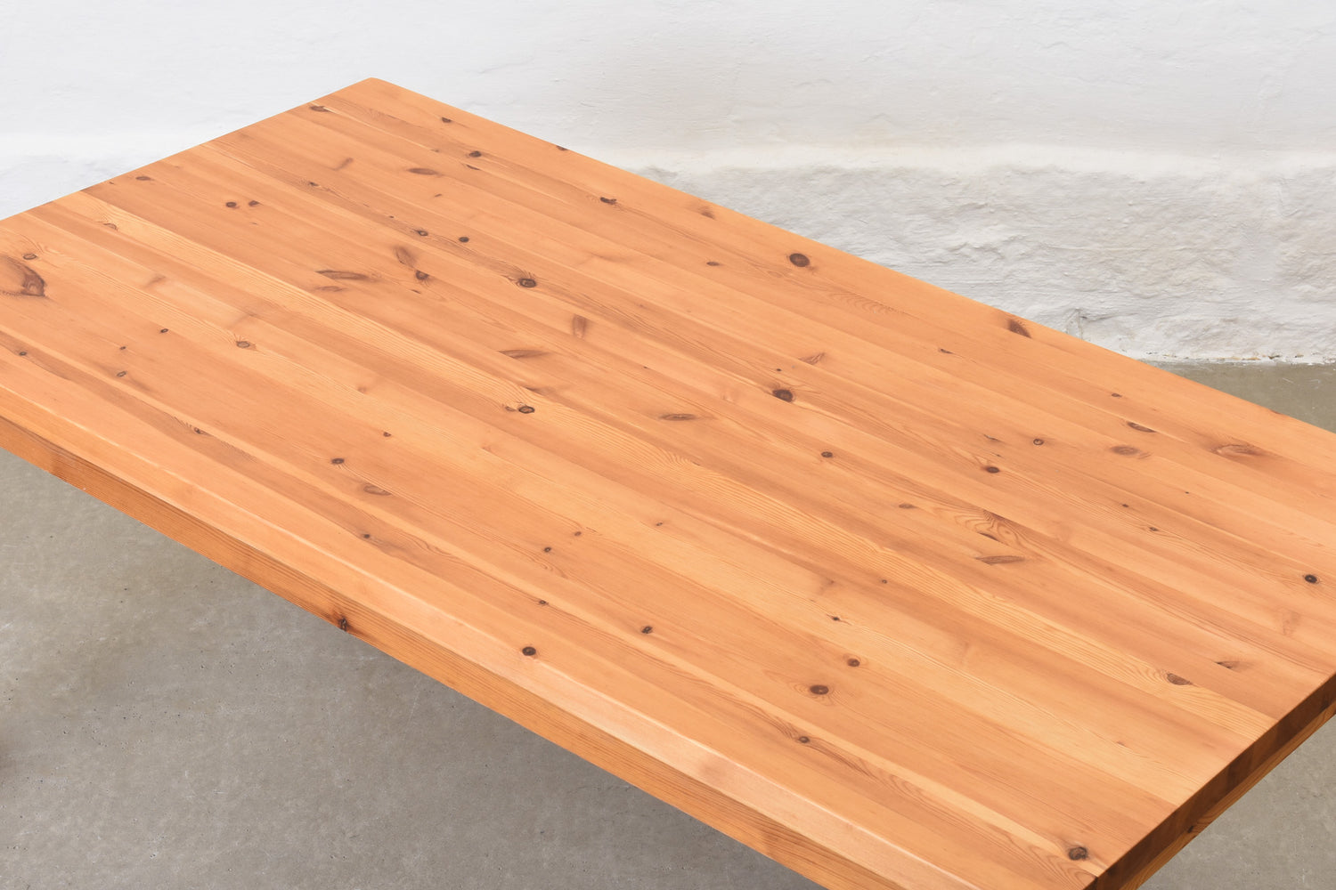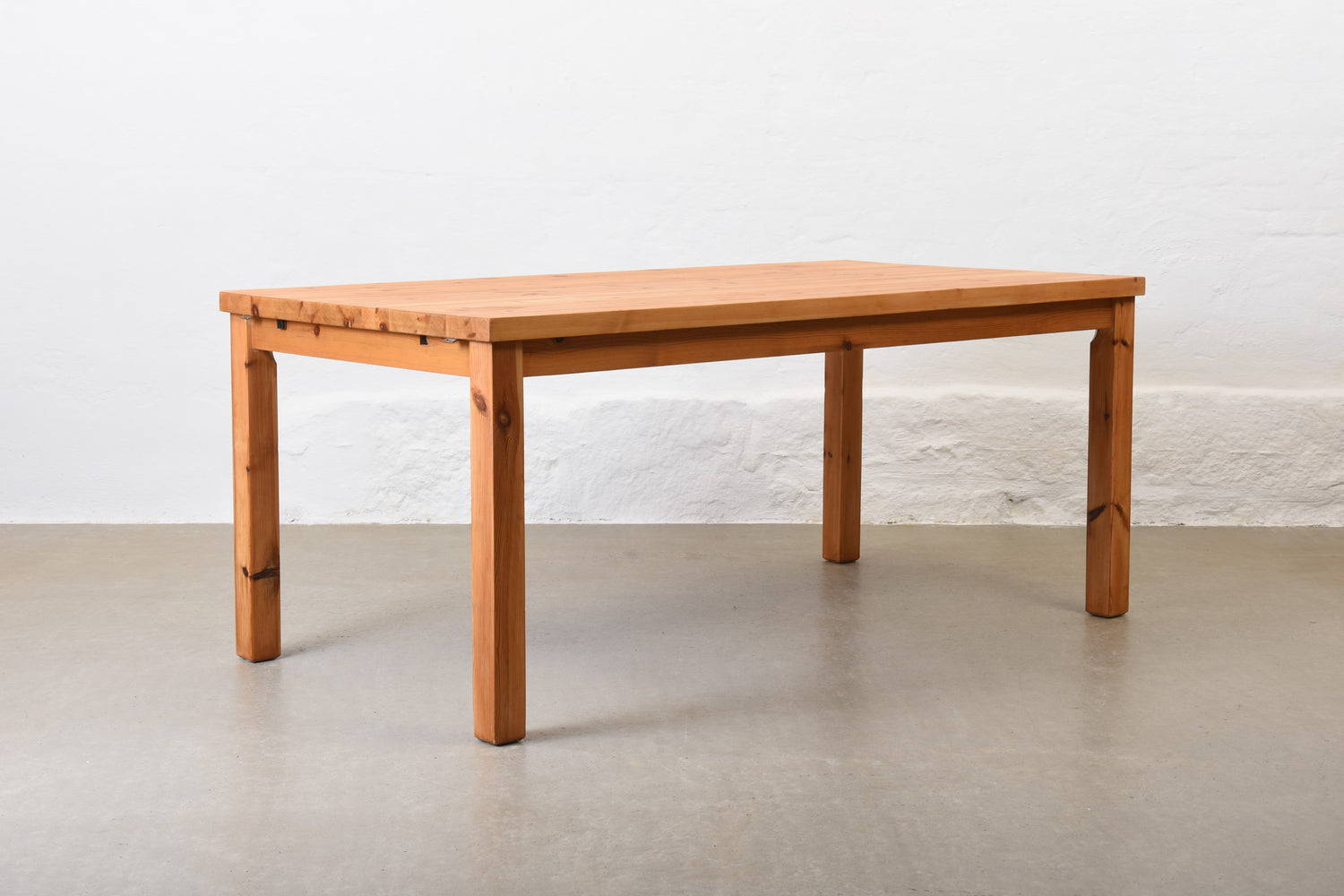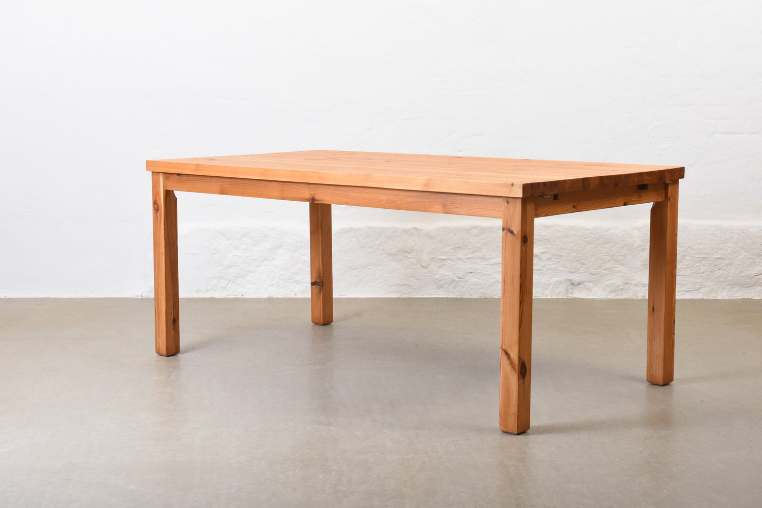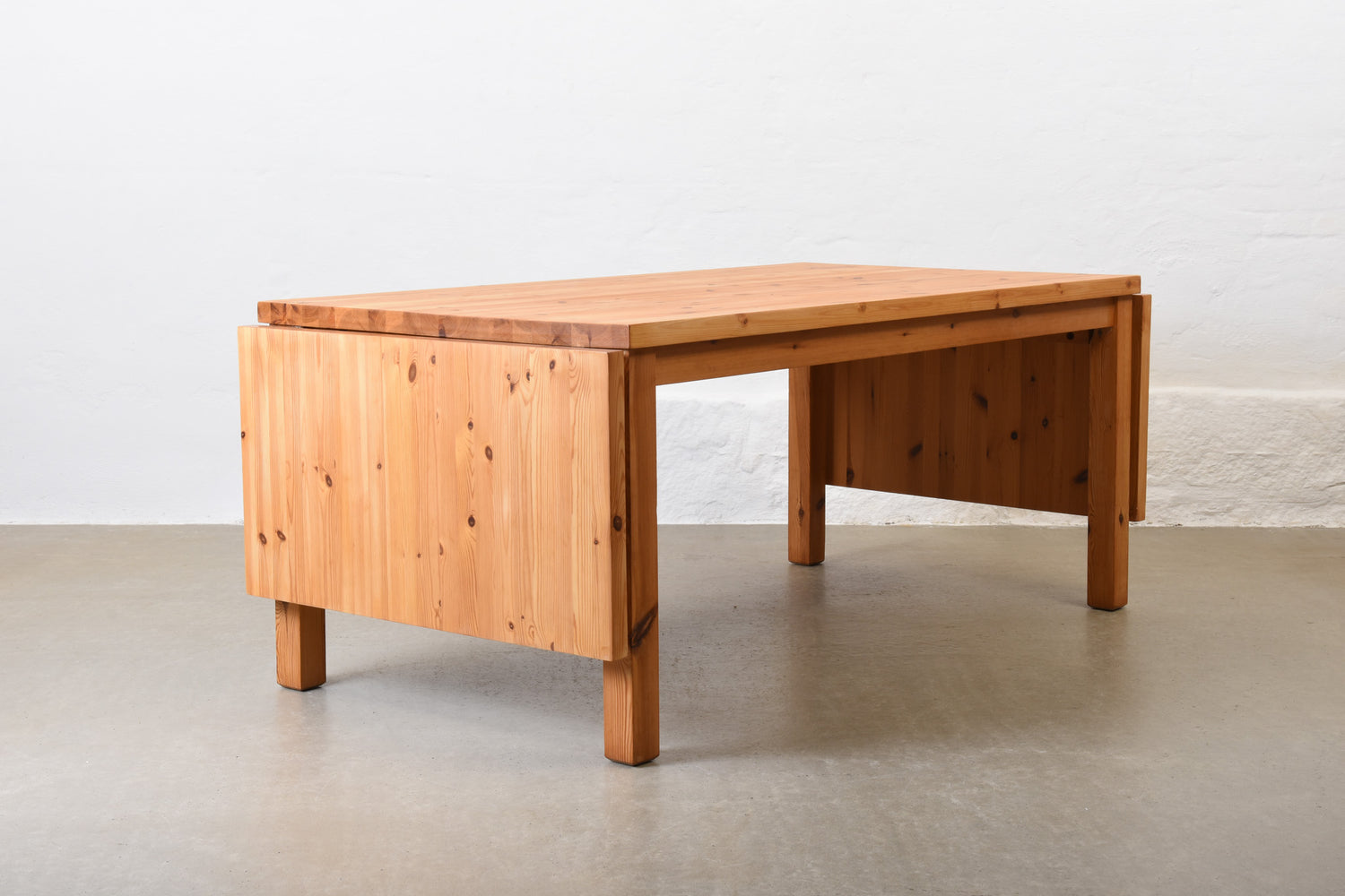 Large dining table in solid pine with two removable drop-leaf extensions. Sits six to eight normally and ten to twelve when fully extended.