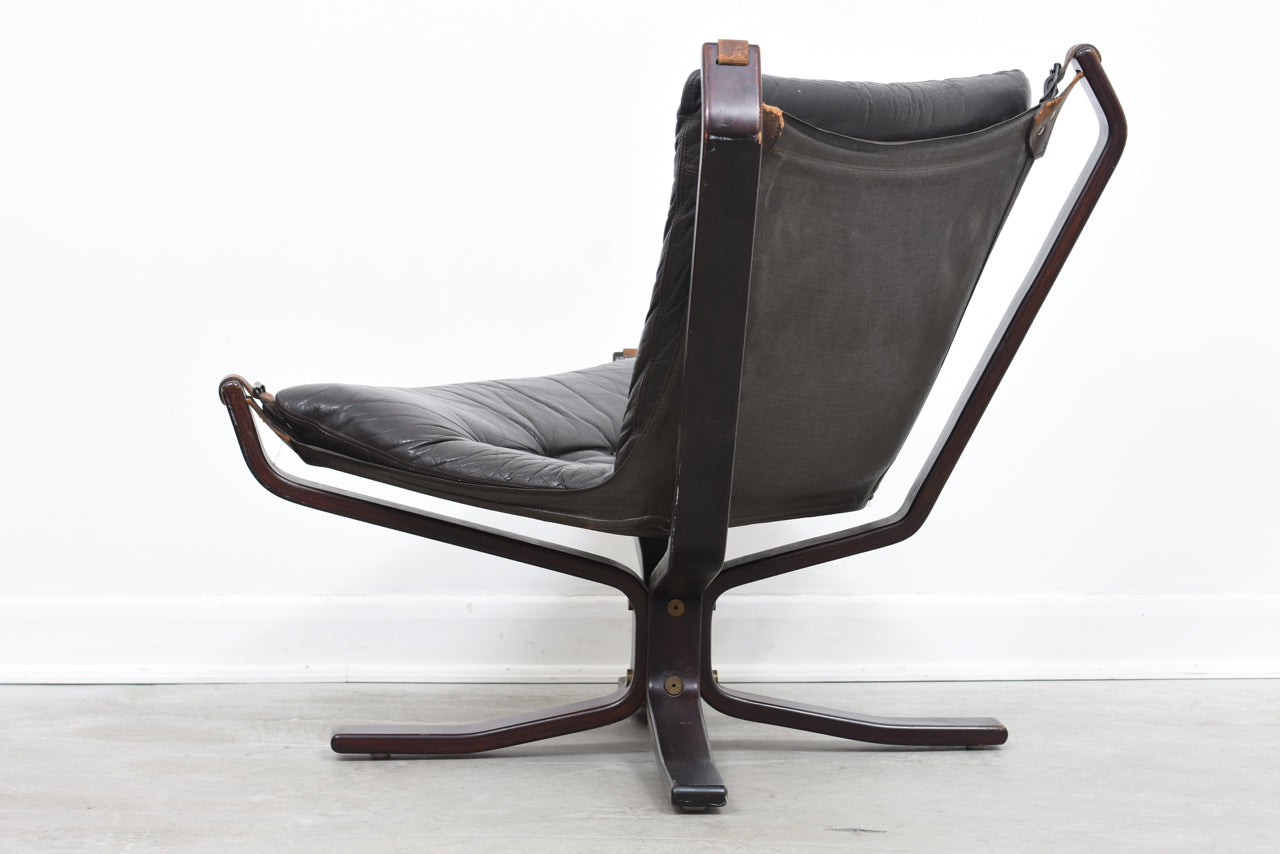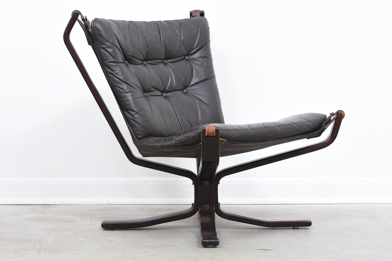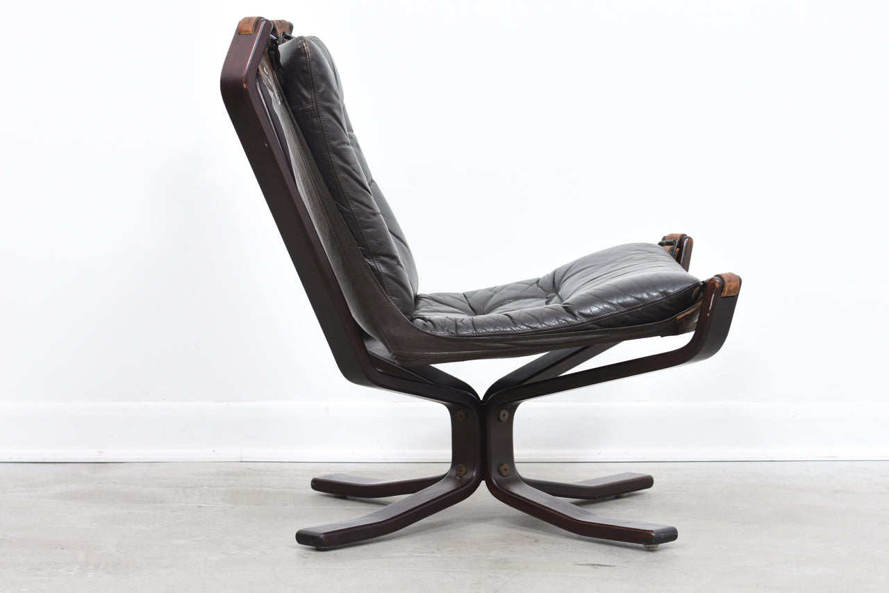 Falcon-esque lounge chair from the 1970s. Features padded leather cushion and a steambent stained beech frame.