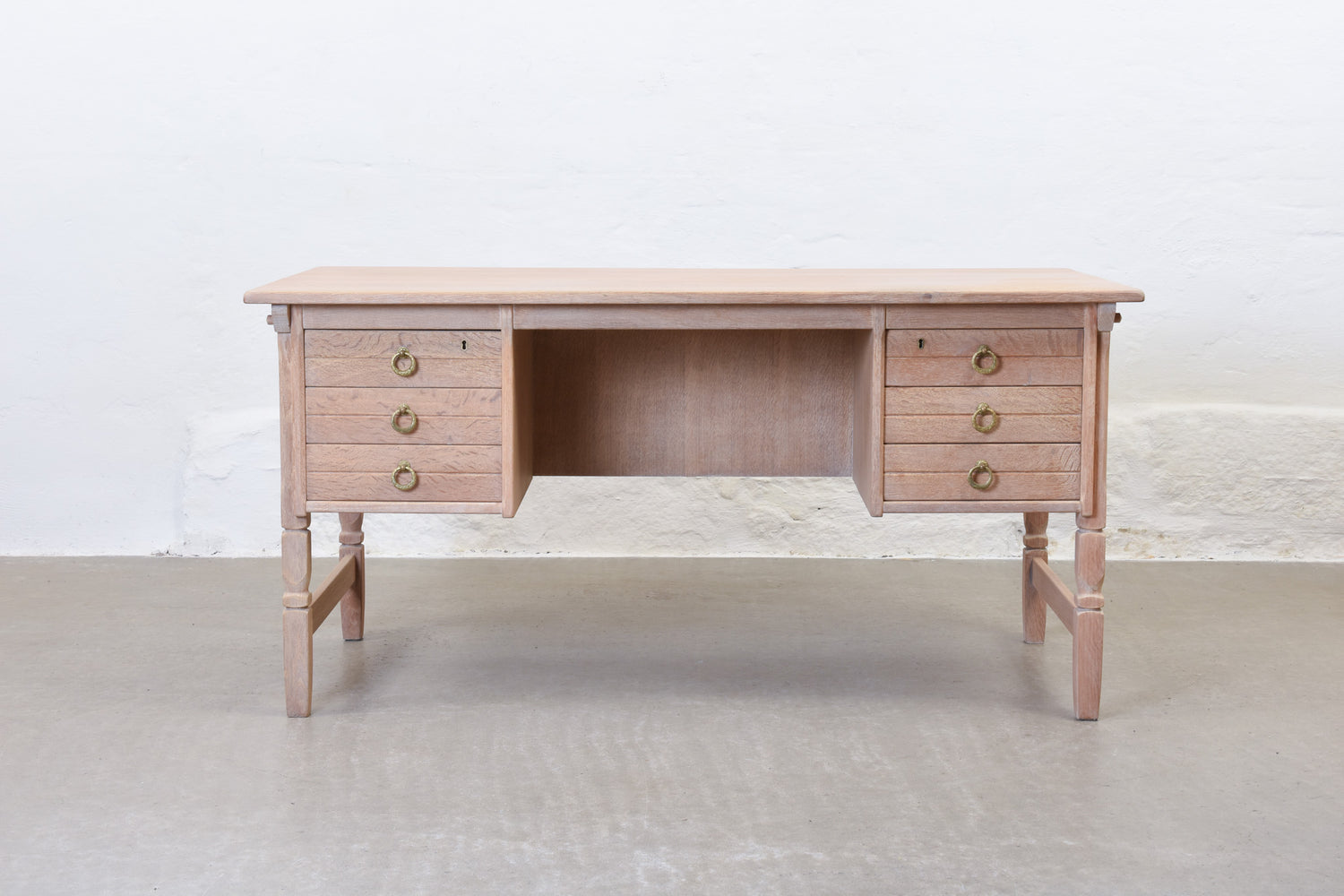 Twin pedestal desk in soaped oak with a selection of six drawers with brass handles and rear bookshelf.