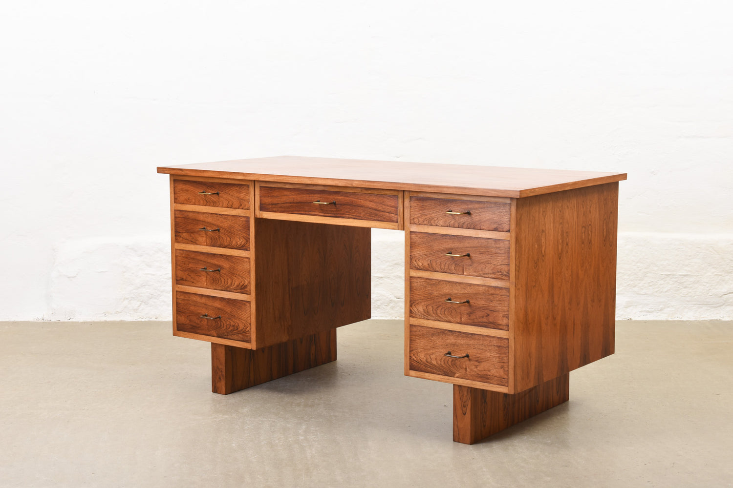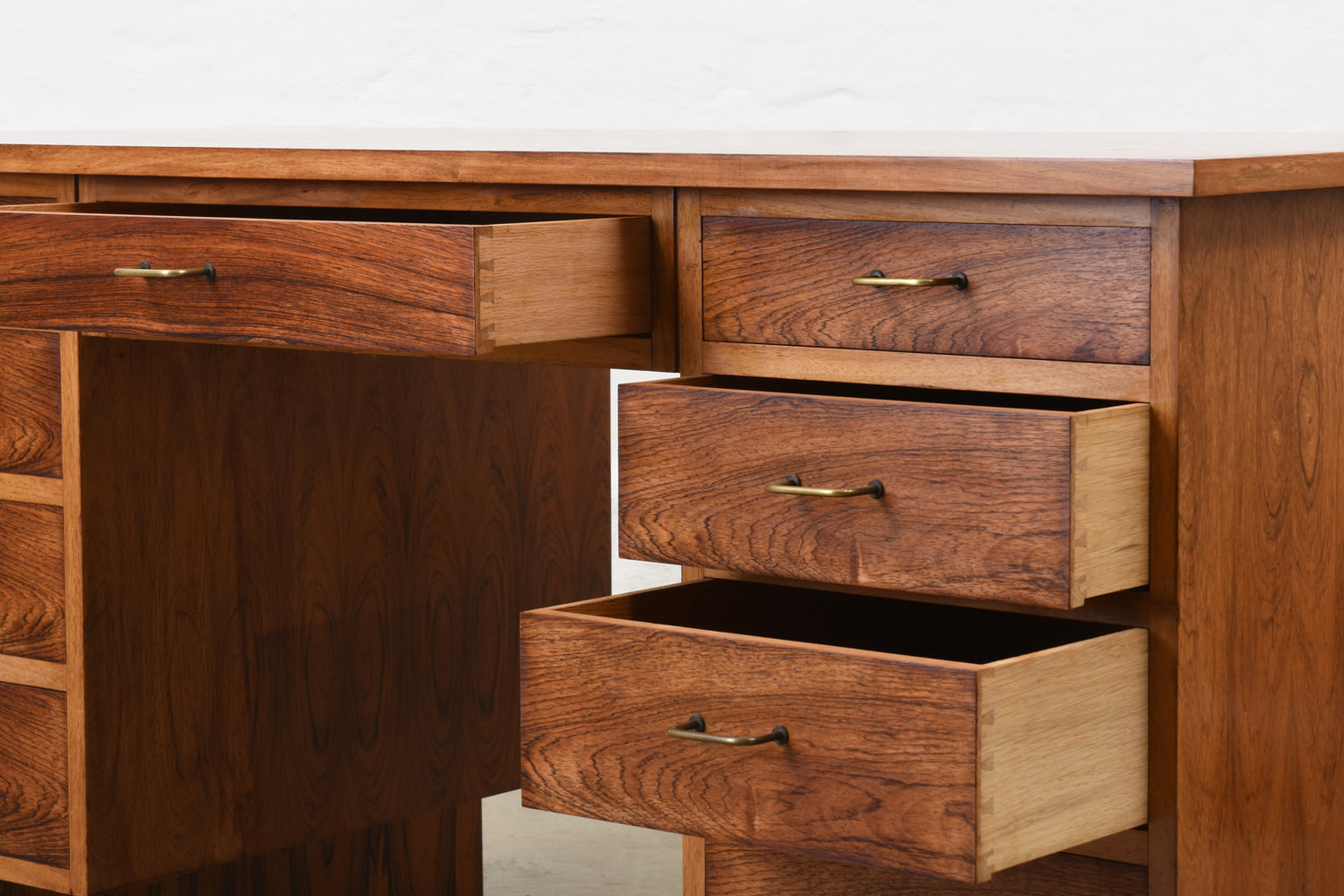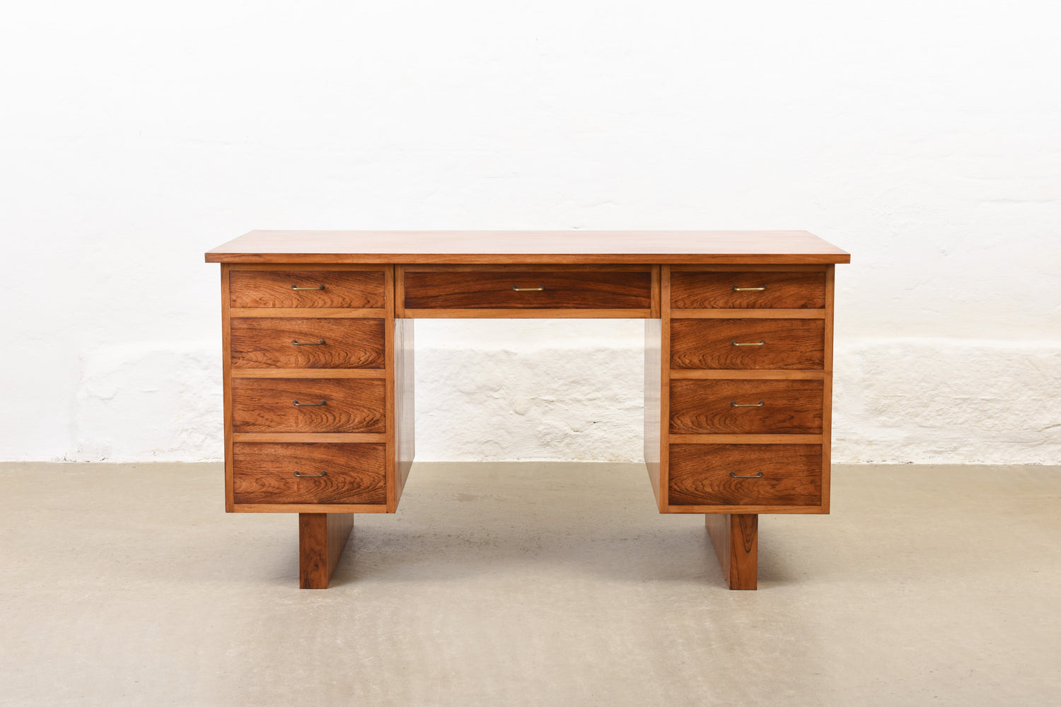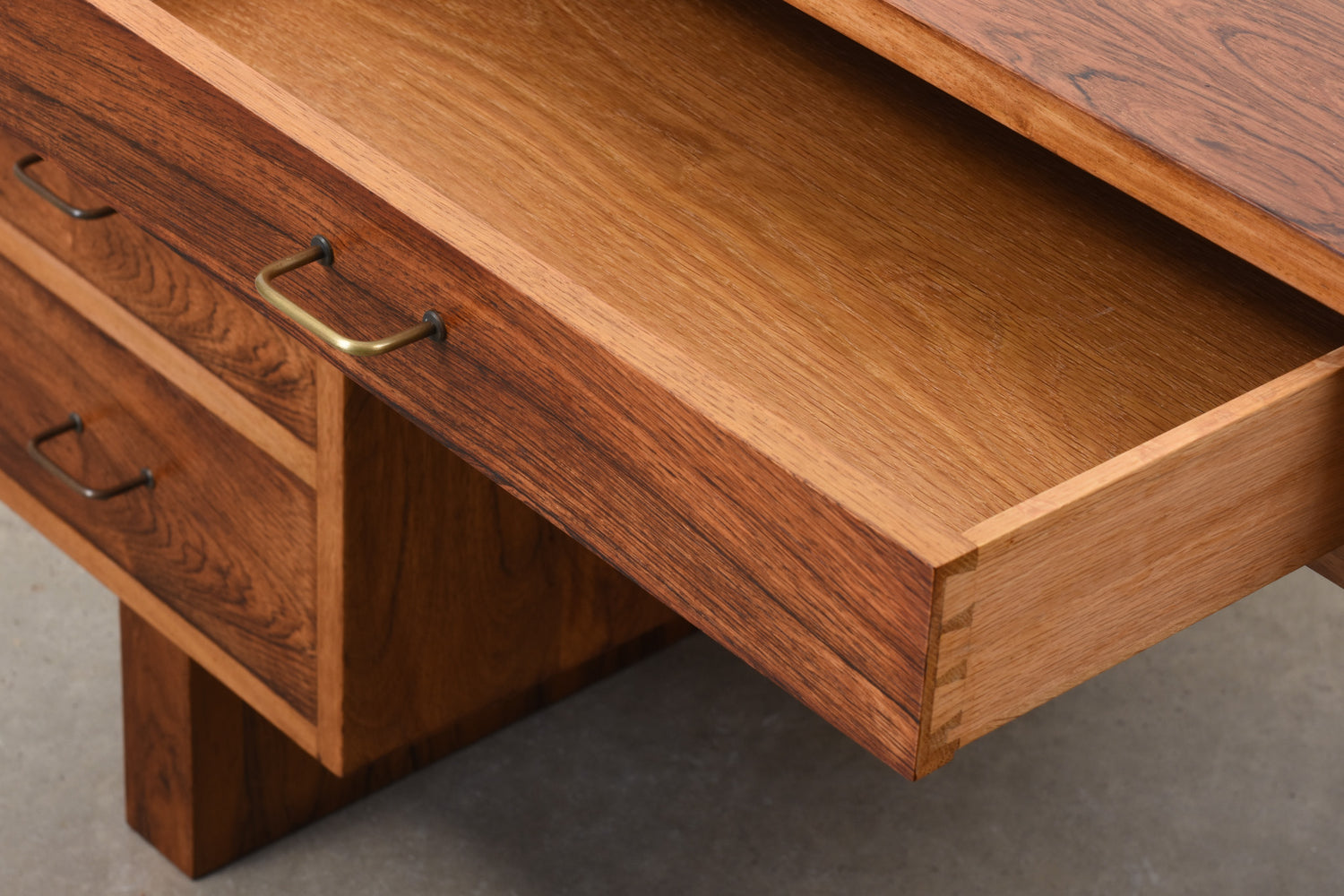 Twin pedestal writing desk in rosewood with a selection of nine oak-lined drawers with brass handles.