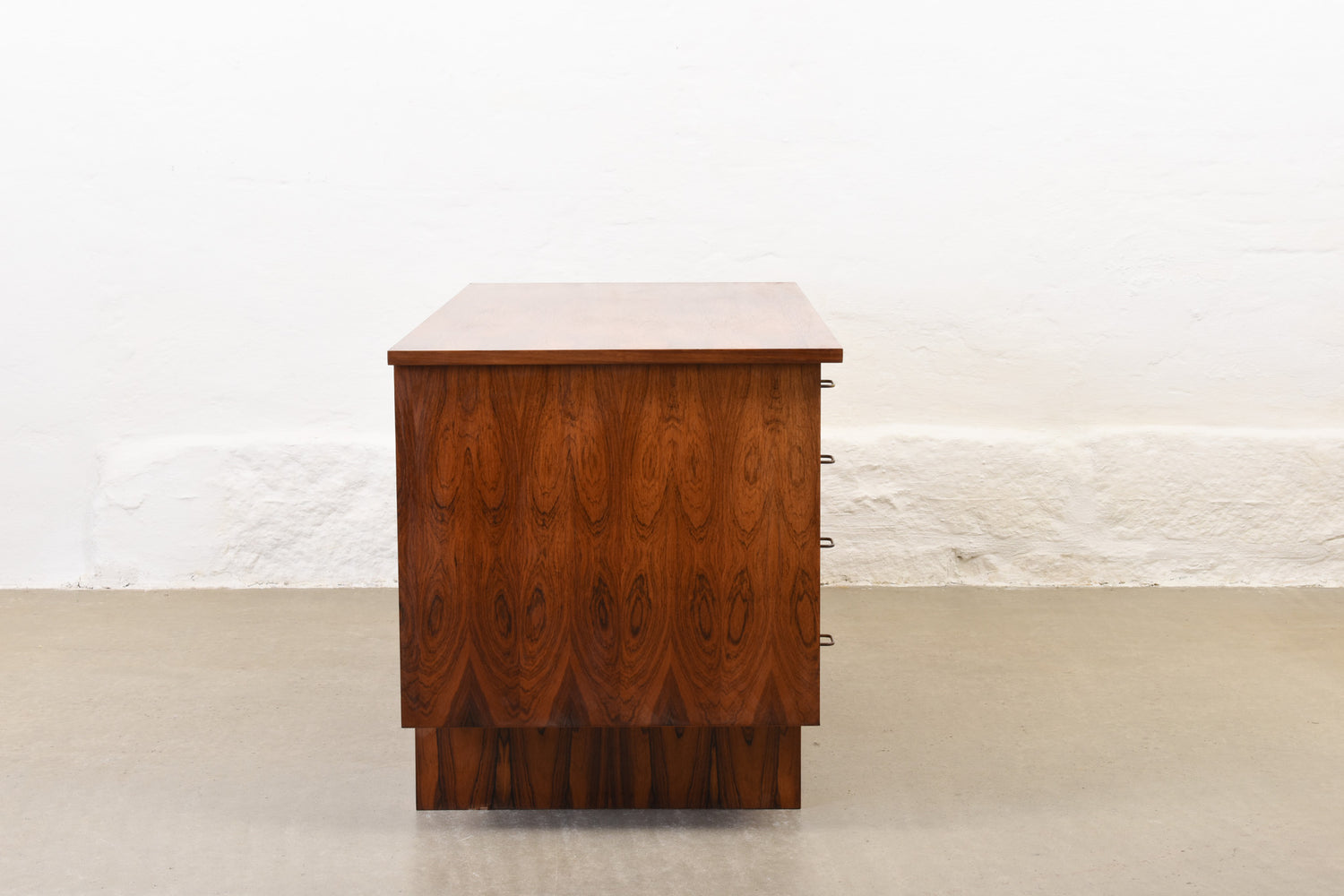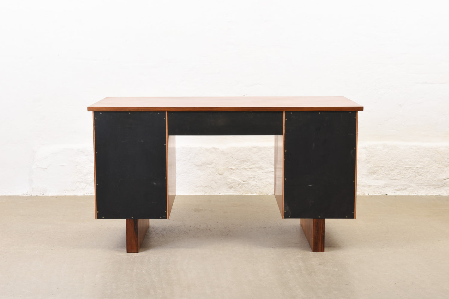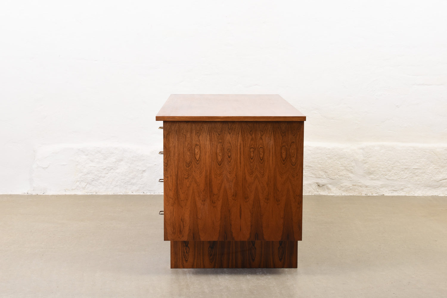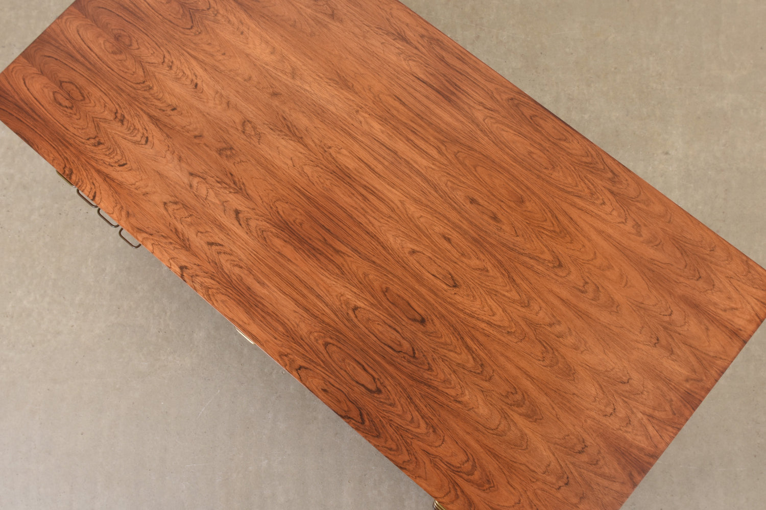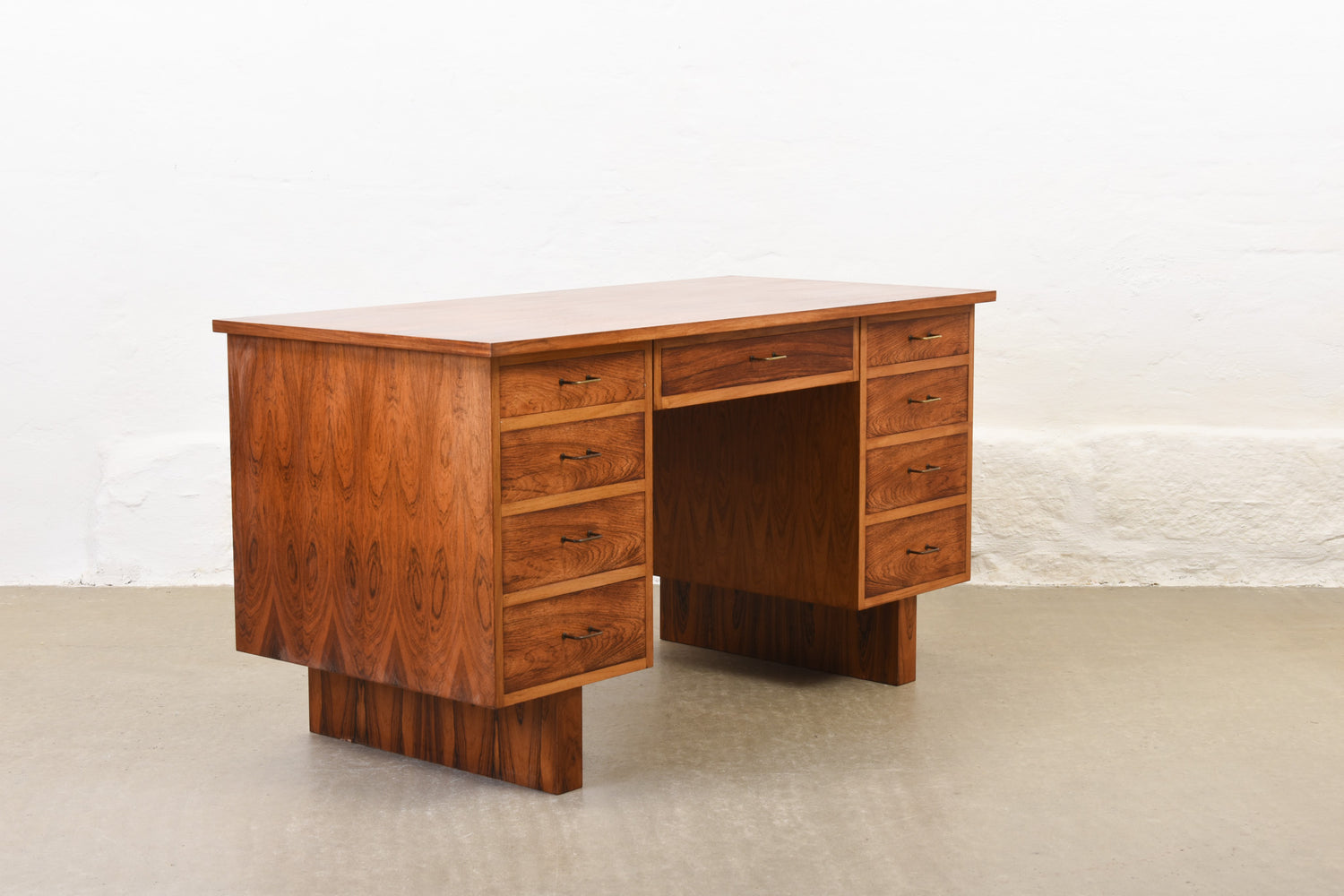 Twin pedestal writing desk in rosewood with a selection of nine oak-lined drawers with brass handles.