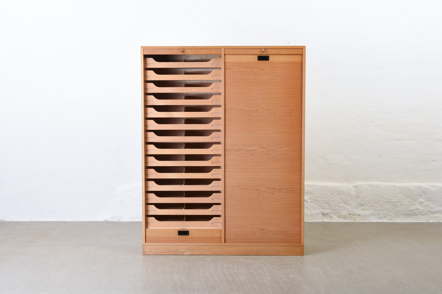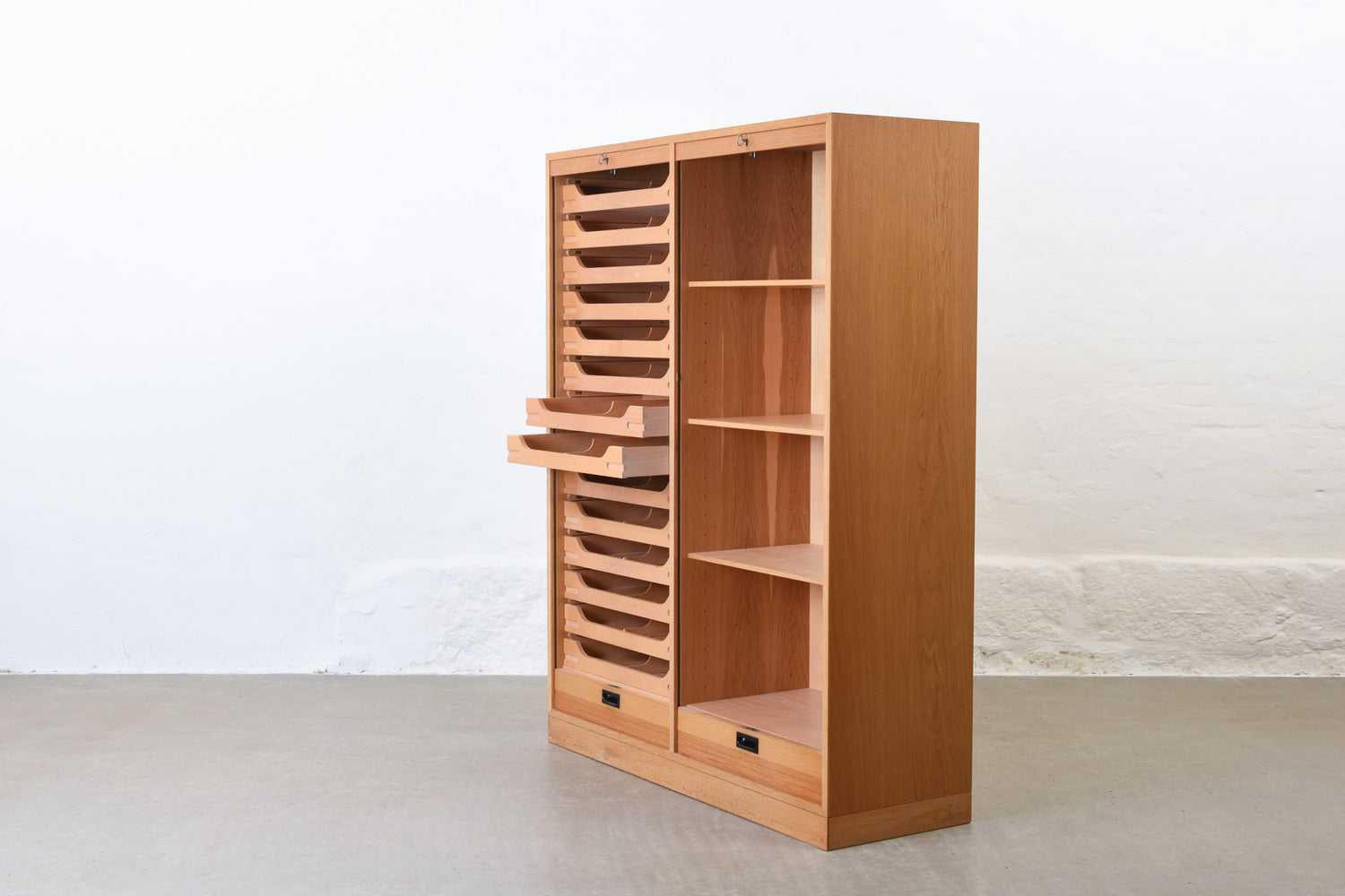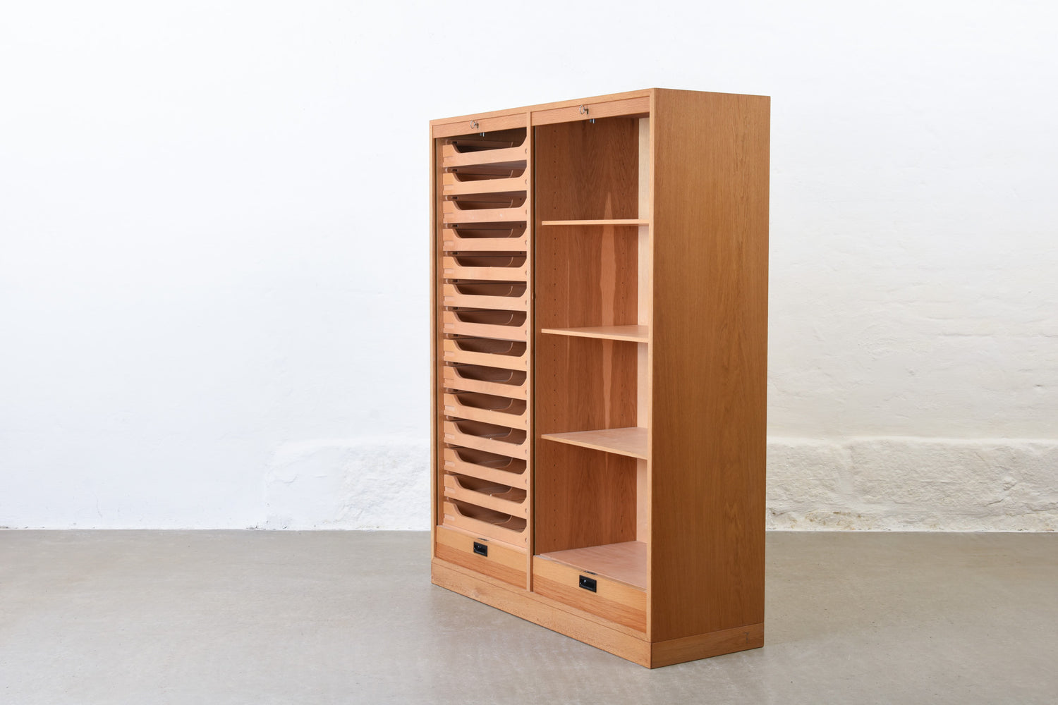 Double-fronted archive cabinet in oak with two locking drop-down tambour doors, three adjustable shelves and a selection of 14 filing trays with removable divider.