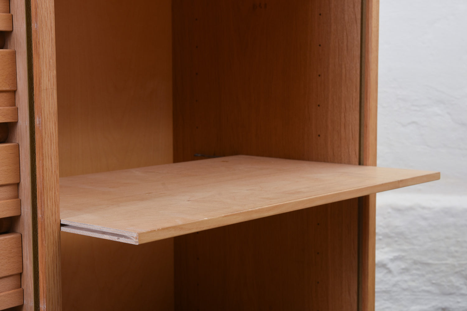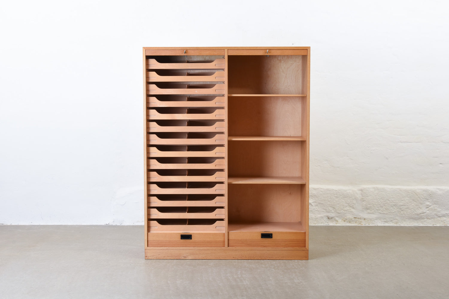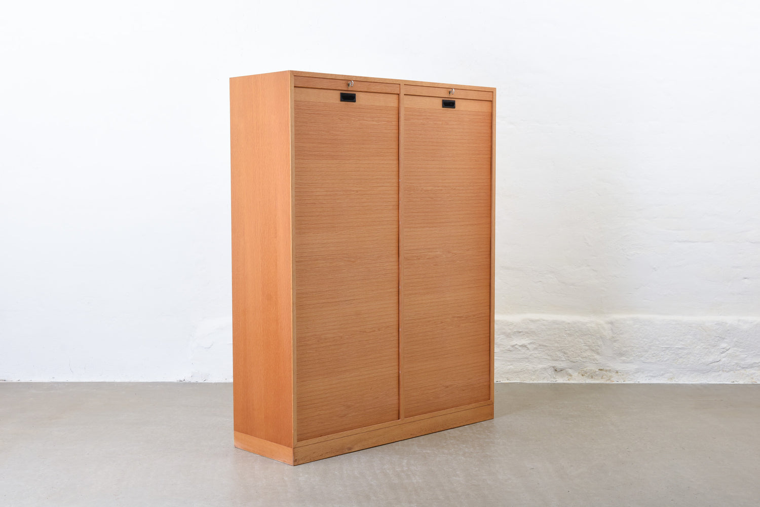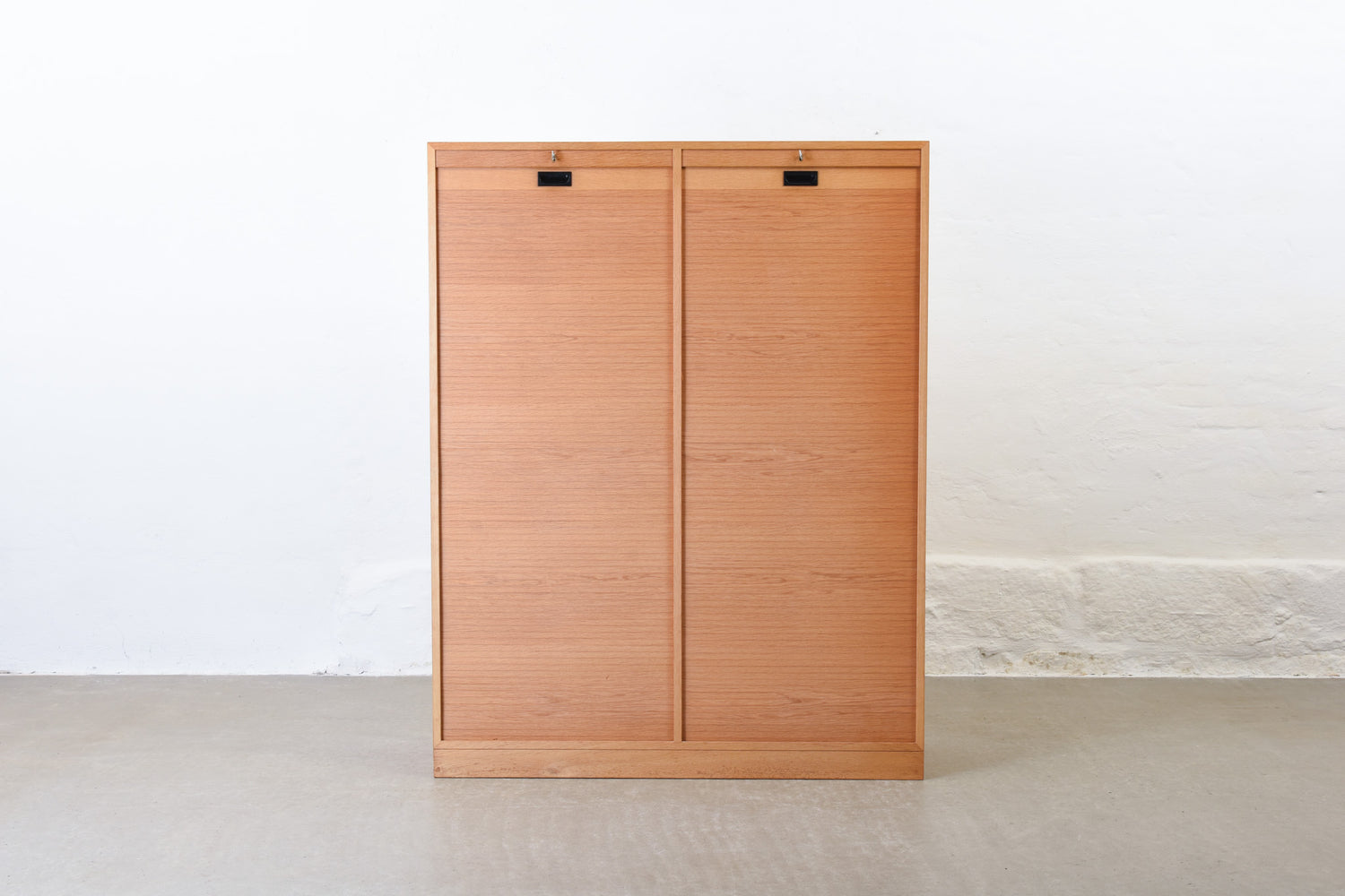 Double-fronted archive cabinet in oak with two locking drop-down tambour doors, three adjustable shelves and a selection of 14 filing trays with removable divider.