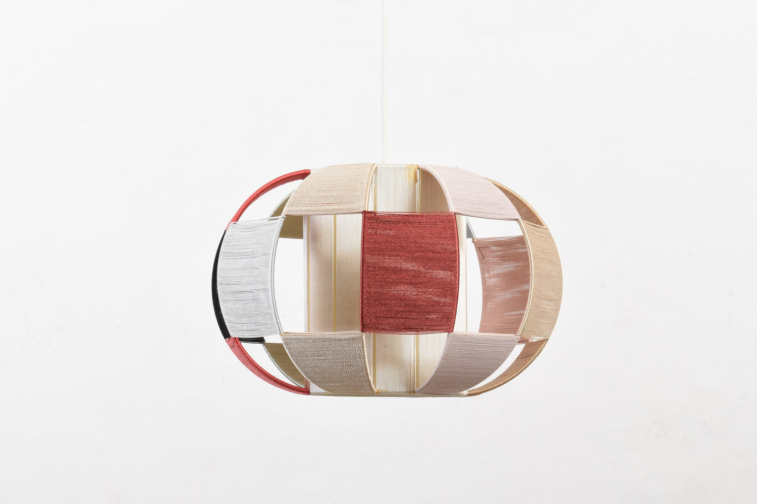 Vintage ceiling lamp with a white metal wire frame and coloured thread diffuser.