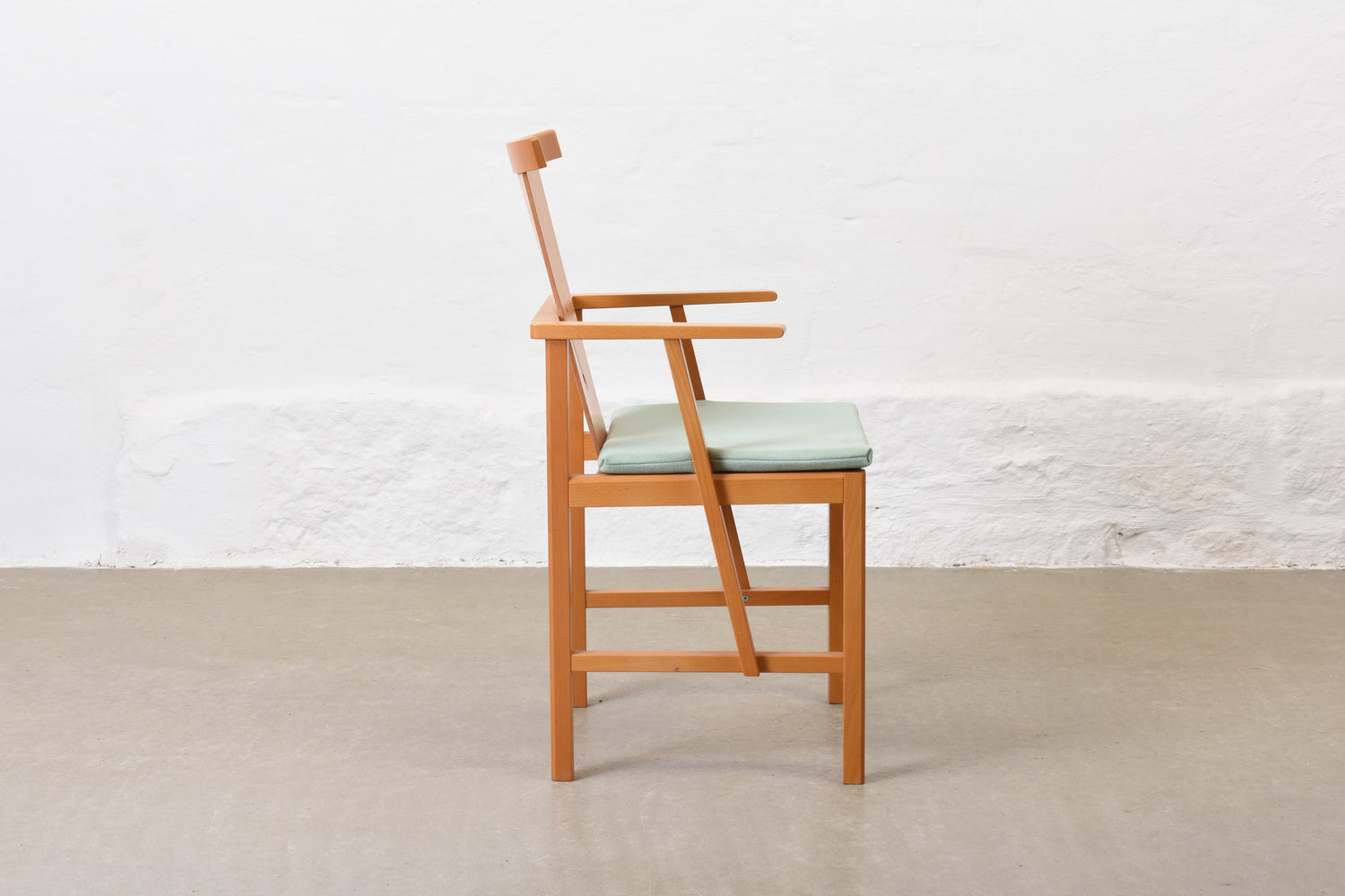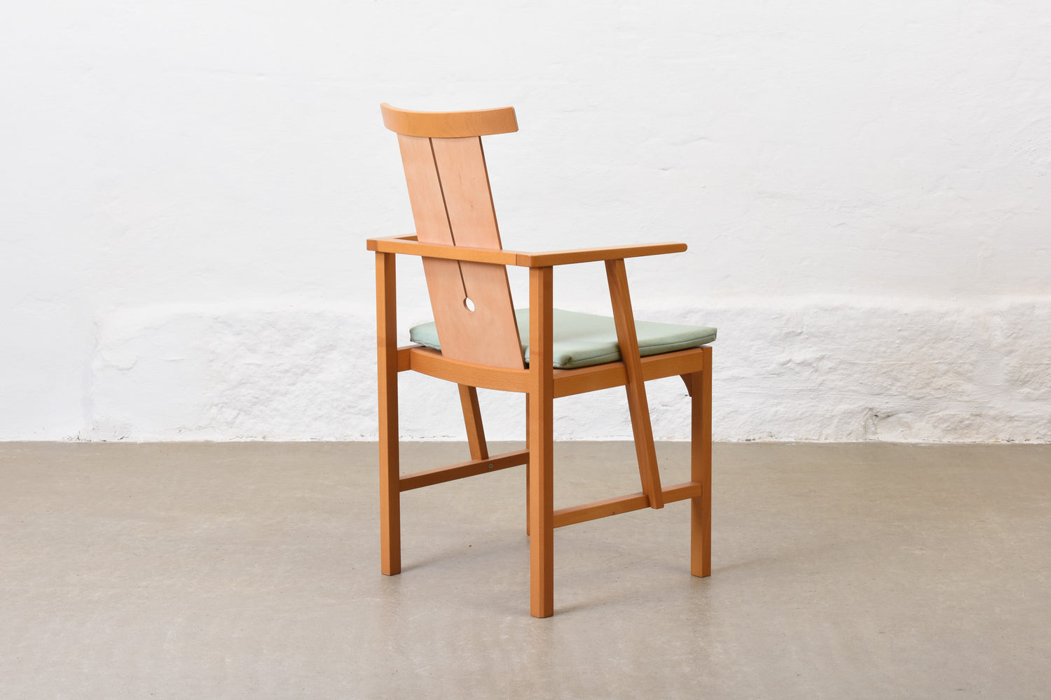 Postmodern 'Corner' armchair in beech with padded seat cushion newly reupholstered in mint wool.