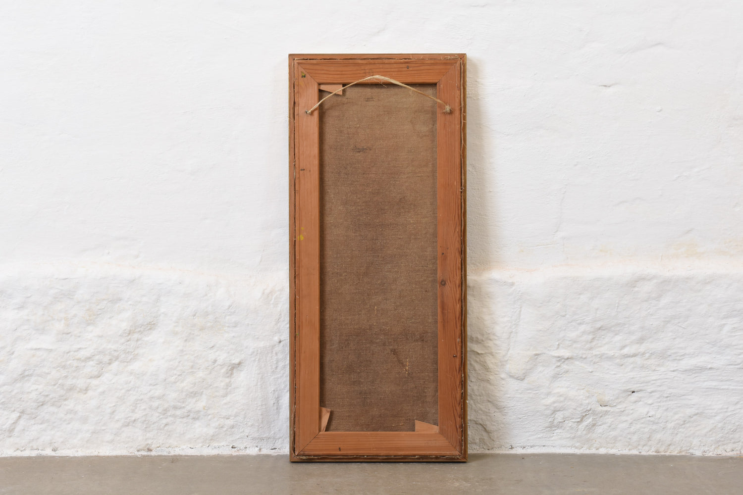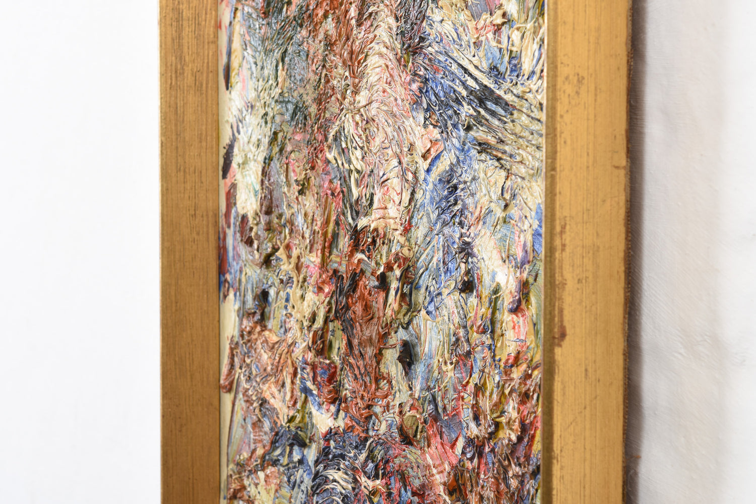 In this rectangular oil painting on canvas, we are immediately captivated by the expressive and dramatic paint marks, whose sweeping gestures draw our eye in multiple directions. We sense that the artist has revelled in the manipulation of oils in order to create this heavily textured work that explores the tactile, sensuous characteristics of paint. This heavy, thick layering of oil paint is a style that was practised by a number of mid-century painters throughout Europe.