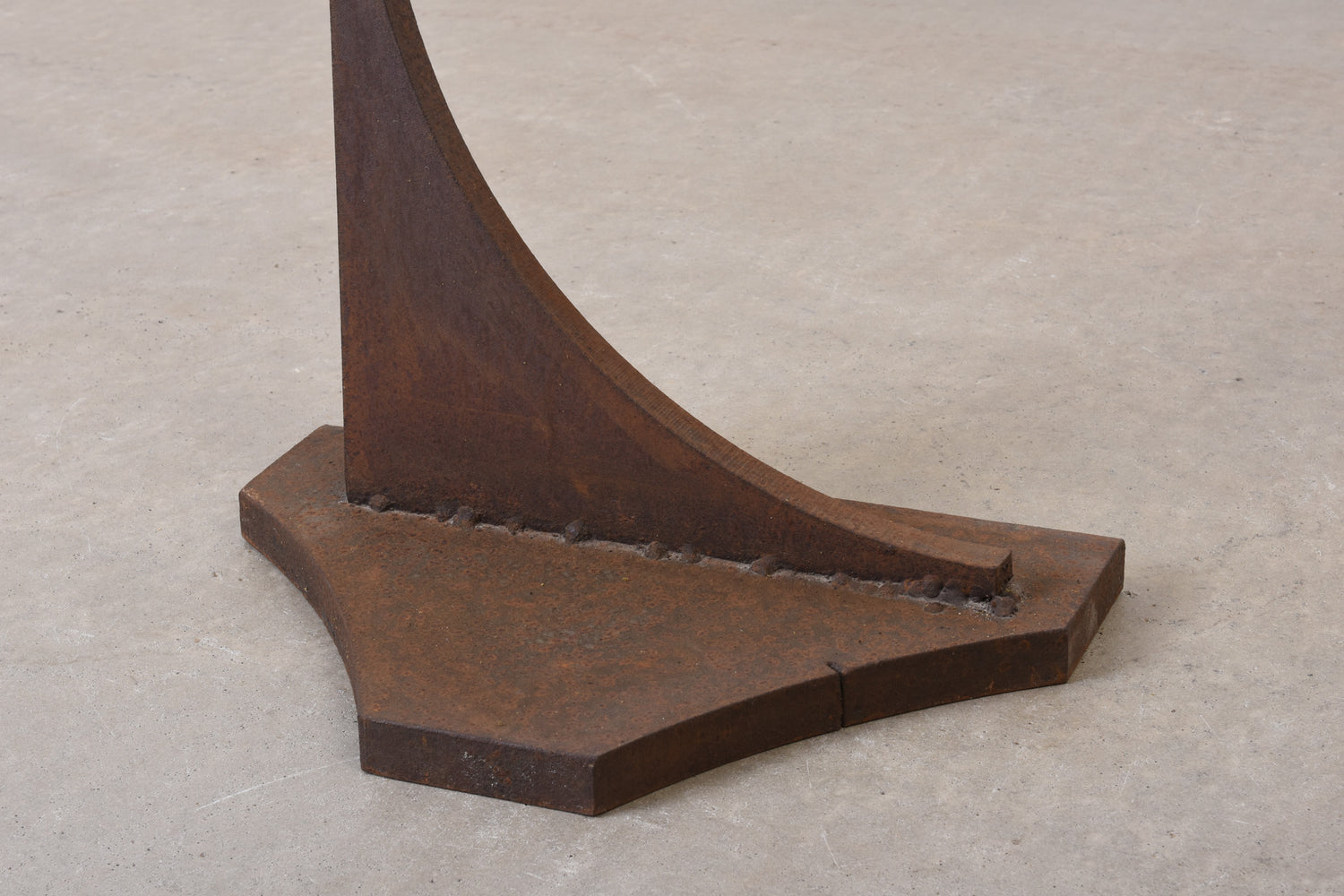 The hard, engineered edges of the metal evoke the industrialised world, while the build-up of surface patina reminds us of nature’s eternal ability to affect and weather materials. The smooth, gliding curves of the metal provide a striking contrast with its hard heaviness, as well as creating a sense of fluid movement.