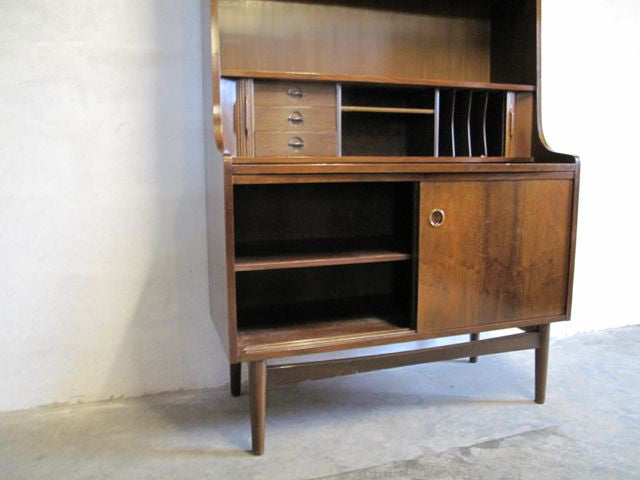 Stylish bookshelf / bureau in mahogany. Plenty of storage space by way of two adjustable shelves, compartmental storage hidden by roller-style doors as well as a cupboard at the bottom. Produced by Bornholms MÌ_ÌÇÌ__belfabrik in 1966.